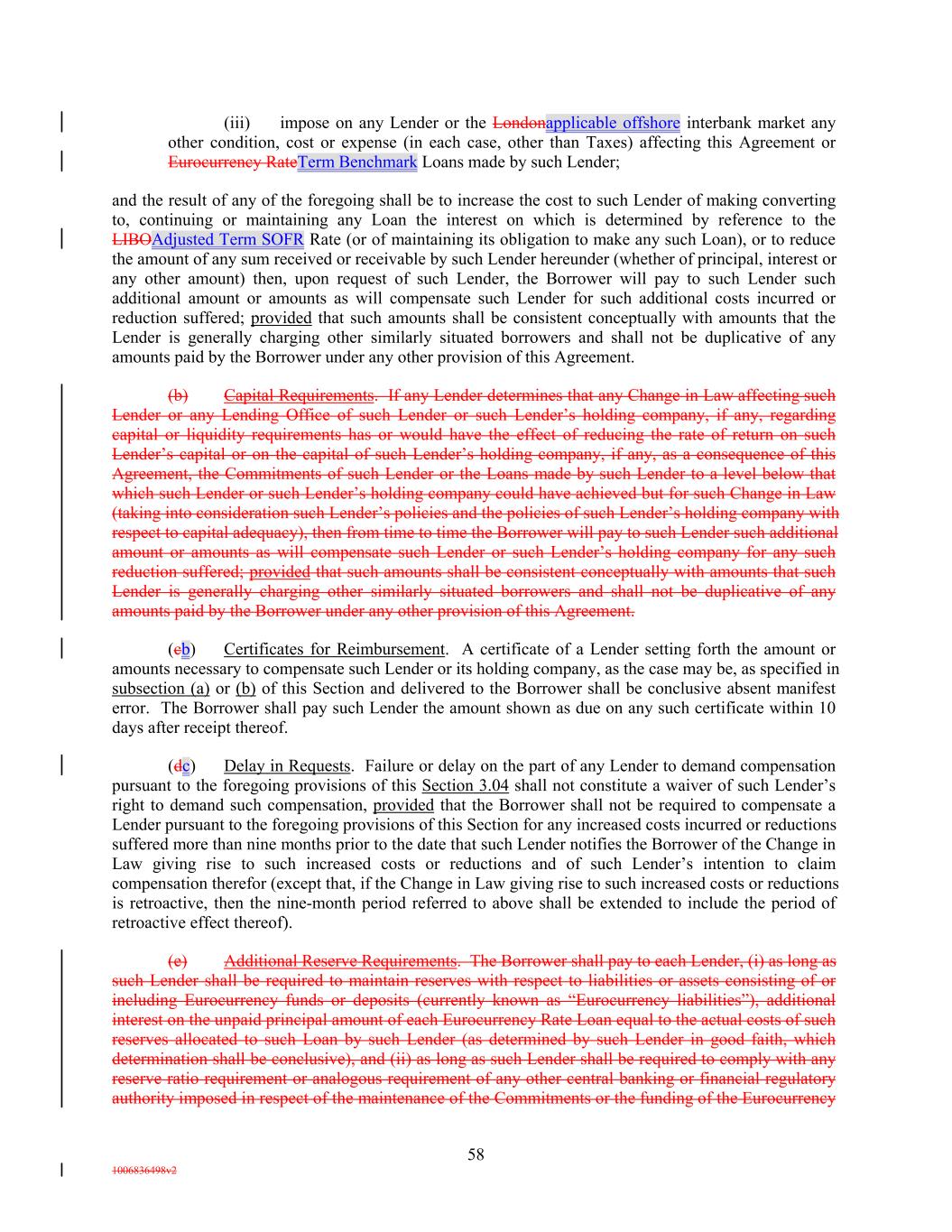 (iii) impose on any Lender or the Londonapplicable offshore interbank market any other condition, cost or expense (in each case, other than Taxes) affecting this Agreement or Eurocurrency RateTerm Benchmark Loans made by such Lender; and the result of any of the foregoing shall be to increase the cost to such Lender of making converting to, continuing or maintaining any Loan the interest on which is determined by reference to the LIBOAdjusted Term SOFR Rate (or of maintaining its obligation to make any such Loan), or to reduce the amount of any sum received or receivable by such Lender hereunder (whether of principal, interest or any other amount) then, upon request of such Lender, the Borrower will pay to such Lender such additional amount or amounts as will compensate such Lender for such additional costs incurred or reduction suffered; provided that such amounts shall be consistent conceptually with amounts that the Lender is generally charging other similarly situated borrowers and shall not be duplicative of any amounts paid by the Borrower under any other provision of this Agreement. (b) Capital Requirements. If any Lender determines that any Change in Law affecting such Lender or any Lending Office of such Lender or such Lender’s holding company, if any, regarding capital or liquidity requirements has or would have the effect of reducing the rate of return on such Lender’s capital or on the capital of such Lender’s holding company, if any, as a consequence of this Agreement, the Commitments of such Lender or the Loans made by such Lender to a level below that which such Lender or such Lender’s holding company could have achieved but for such Change in Law (taking into consideration such Lender’s policies and the policies of such Lender’s holding company with respect to capital adequacy), then from time to time the Borrower will pay to such Lender such additional amount or amounts as will compensate such Lender or such Lender’s holding company for any such reduction suffered; provided that such amounts shall be consistent conceptually with amounts that such Lender is generally charging other similarly situated borrowers and shall not be duplicative of any amounts paid by the Borrower under any other provision of this Agreement. (cb) Certificates for Reimbursement. A certificate of a Lender setting forth the amount or amounts necessary to compensate such Lender or its holding company, as the case may be, as specified in subsection (a) or (b) of this Section and delivered to the Borrower shall be conclusive absent manifest error. The Borrower shall pay such Lender the amount shown as due on any such certificate within 10 days after receipt thereof. (dc) Delay in Requests. Failure or delay on the part of any Lender to demand compensation pursuant to the foregoing provisions of this Section 3.04 shall not constitute a waiver of such Lender’s right to demand such compensation, provided that the Borrower shall not be required to compensate a Lender pursuant to the foregoing provisions of this Section for any increased costs incurred or reductions suffered more than nine months prior to the date that such Lender notifies the Borrower of the Change in Law giving rise to such increased costs or reductions and of such Lender’s intention to claim compensation therefor (except that, if the Change in Law giving rise to such increased costs or reductions is retroactive, then the nine-month period referred to above shall be extended to include the period of retroactive effect thereof). (e) Additional Reserve Requirements. The Borrower shall pay to each Lender, (i) as long as such Lender shall be required to maintain reserves with respect to liabilities or assets consisting of or including Eurocurrency funds or deposits (currently known as “Eurocurrency liabilities”), additional interest on the unpaid principal amount of each Eurocurrency Rate Loan equal to the actual costs of such reserves allocated to such Loan by such Lender (as determined by such Lender in good faith, which determination shall be conclusive), and (ii) as long as such Lender shall be required to comply with any reserve ratio requirement or analogous requirement of any other central banking or financial regulatory authority imposed in respect of the maintenance of the Commitments or the funding of the Eurocurrency 58 1006836498v2