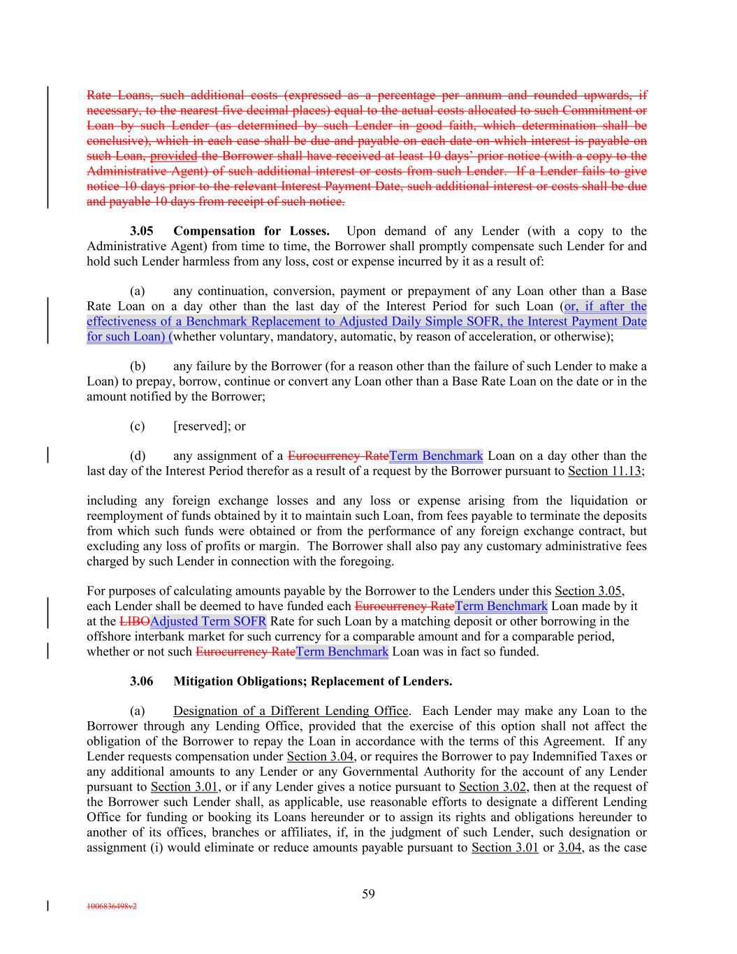 Rate Loans, such additional costs (expressed as a percentage per annum and rounded upwards, if necessary, to the nearest five decimal places) equal to the actual costs allocated to such Commitment or Loan by such Lender (as determined by such Lender in good faith, which determination shall be conclusive), which in each case shall be due and payable on each date on which interest is payable on such Loan, provided the Borrower shall have received at least 10 days’ prior notice (with a copy to the Administrative Agent) of such additional interest or costs from such Lender. If a Lender fails to give notice 10 days prior to the relevant Interest Payment Date, such additional interest or costs shall be due and payable 10 days from receipt of such notice. 3.05 Compensation for Losses. Upon demand of any Lender (with a copy to the Administrative Agent) from time to time, the Borrower shall promptly compensate such Lender for and hold such Lender harmless from any loss, cost or expense incurred by it as a result of: (a) any continuation, conversion, payment or prepayment of any Loan other than a Base Rate Loan on a day other than the last day of the Interest Period for such Loan (or, if after the effectiveness of a Benchmark Replacement to Adjusted Daily Simple SOFR, the Interest Payment Date for such Loan) (whether voluntary, mandatory, automatic, by reason of acceleration, or otherwise); (b) any failure by the Borrower (for a reason other than the failure of such Lender to make a Loan) to prepay, borrow, continue or convert any Loan other than a Base Rate Loan on the date or in the amount notified by the Borrower; (c) [reserved]; or (d) any assignment of a Eurocurrency RateTerm Benchmark Loan on a day other than the last day of the Interest Period therefor as a result of a request by the Borrower pursuant to Section 11.13; including any foreign exchange losses and any loss or expense arising from the liquidation or reemployment of funds obtained by it to maintain such Loan, from fees payable to terminate the deposits from which such funds were obtained or from the performance of any foreign exchange contract, but excluding any loss of profits or margin. The Borrower shall also pay any customary administrative fees charged by such Lender in connection with the foregoing. For purposes of calculating amounts payable by the Borrower to the Lenders under this Section 3.05, each Lender shall be deemed to have funded each Eurocurrency RateTerm Benchmark Loan made by it at the LIBOAdjusted Term SOFR Rate for such Loan by a matching deposit or other borrowing in the offshore interbank market for such currency for a comparable amount and for a comparable period, whether or not such Eurocurrency RateTerm Benchmark Loan was in fact so funded. 3.06 Mitigation Obligations; Replacement of Lenders. (a) Designation of a Different Lending Office. Each Lender may make any Loan to the Borrower through any Lending Office, provided that the exercise of this option shall not affect the obligation of the Borrower to repay the Loan in accordance with the terms of this Agreement. If any Lender requests compensation under Section 3.04, or requires the Borrower to pay Indemnified Taxes or any additional amounts to any Lender or any Governmental Authority for the account of any Lender pursuant to Section 3.01, or if any Lender gives a notice pursuant to Section 3.02, then at the request of the Borrower such Lender shall, as applicable, use reasonable efforts to designate a different Lending Office for funding or booking its Loans hereunder or to assign its rights and obligations hereunder to another of its offices, branches or affiliates, if, in the judgment of such Lender, such designation or assignment (i) would eliminate or reduce amounts payable pursuant to Section 3.01 or 3.04, as the case 59 1006836498v2