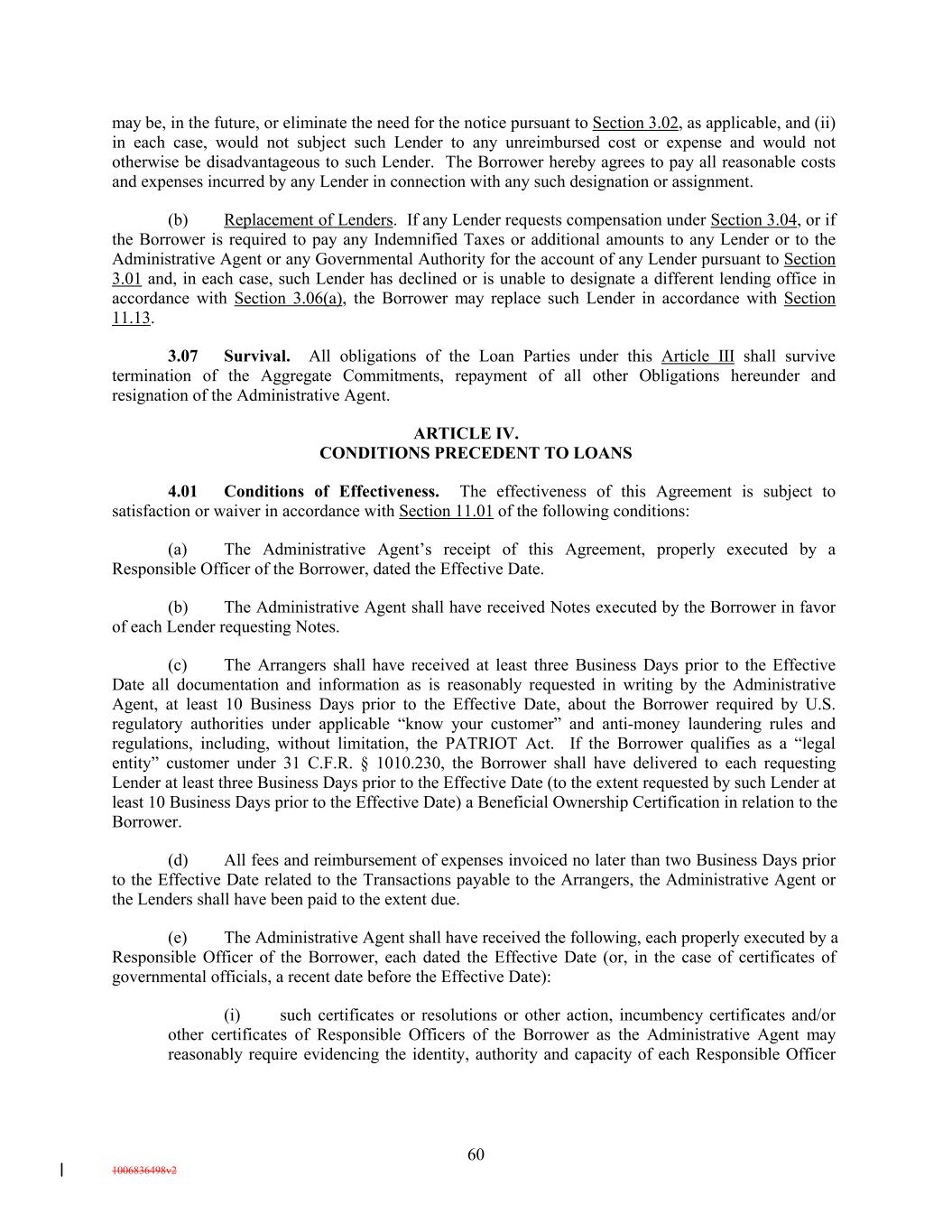 may be, in the future, or eliminate the need for the notice pursuant to Section 3.02, as applicable, and (ii) in each case, would not subject such Lender to any unreimbursed cost or expense and would not otherwise be disadvantageous to such Lender. The Borrower hereby agrees to pay all reasonable costs and expenses incurred by any Lender in connection with any such designation or assignment. (b) Replacement of Lenders. If any Lender requests compensation under Section 3.04, or if the Borrower is required to pay any Indemnified Taxes or additional amounts to any Lender or to the Administrative Agent or any Governmental Authority for the account of any Lender pursuant to Section 3.01 and, in each case, such Lender has declined or is unable to designate a different lending office in accordance with Section 3.06(a), the Borrower may replace such Lender in accordance with Section 11.13. 3.07 Survival. All obligations of the Loan Parties under this Article III shall survive termination of the Aggregate Commitments, repayment of all other Obligations hereunder and resignation of the Administrative Agent. ARTICLE IV. CONDITIONS PRECEDENT TO LOANS 4.01 Conditions of Effectiveness. The effectiveness of this Agreement is subject to satisfaction or waiver in accordance with Section 11.01 of the following conditions: (a) The Administrative Agent’s receipt of this Agreement, properly executed by a Responsible Officer of the Borrower, dated the Effective Date. (b) The Administrative Agent shall have received Notes executed by the Borrower in favor of each Lender requesting Notes. (c) The Arrangers shall have received at least three Business Days prior to the Effective Date all documentation and information as is reasonably requested in writing by the Administrative Agent, at least 10 Business Days prior to the Effective Date, about the Borrower required by U.S. regulatory authorities under applicable “know your customer” and anti-money laundering rules and regulations, including, without limitation, the PATRIOT Act. If the Borrower qualifies as a “legal entity” customer under 31 C.F.R. § 1010.230, the Borrower shall have delivered to each requesting Lender at least three Business Days prior to the Effective Date (to the extent requested by such Lender at least 10 Business Days prior to the Effective Date) a Beneficial Ownership Certification in relation to the Borrower. (d) All fees and reimbursement of expenses invoiced no later than two Business Days prior to the Effective Date related to the Transactions payable to the Arrangers, the Administrative Agent or the Lenders shall have been paid to the extent due. (e) The Administrative Agent shall have received the following, each properly executed by a Responsible Officer of the Borrower, each dated the Effective Date (or, in the case of certificates of governmental officials, a recent date before the Effective Date): (i) such certificates or resolutions or other action, incumbency certificates and/or other certificates of Responsible Officers of the Borrower as the Administrative Agent may reasonably require evidencing the identity, authority and capacity of each Responsible Officer 60 1006836498v2
