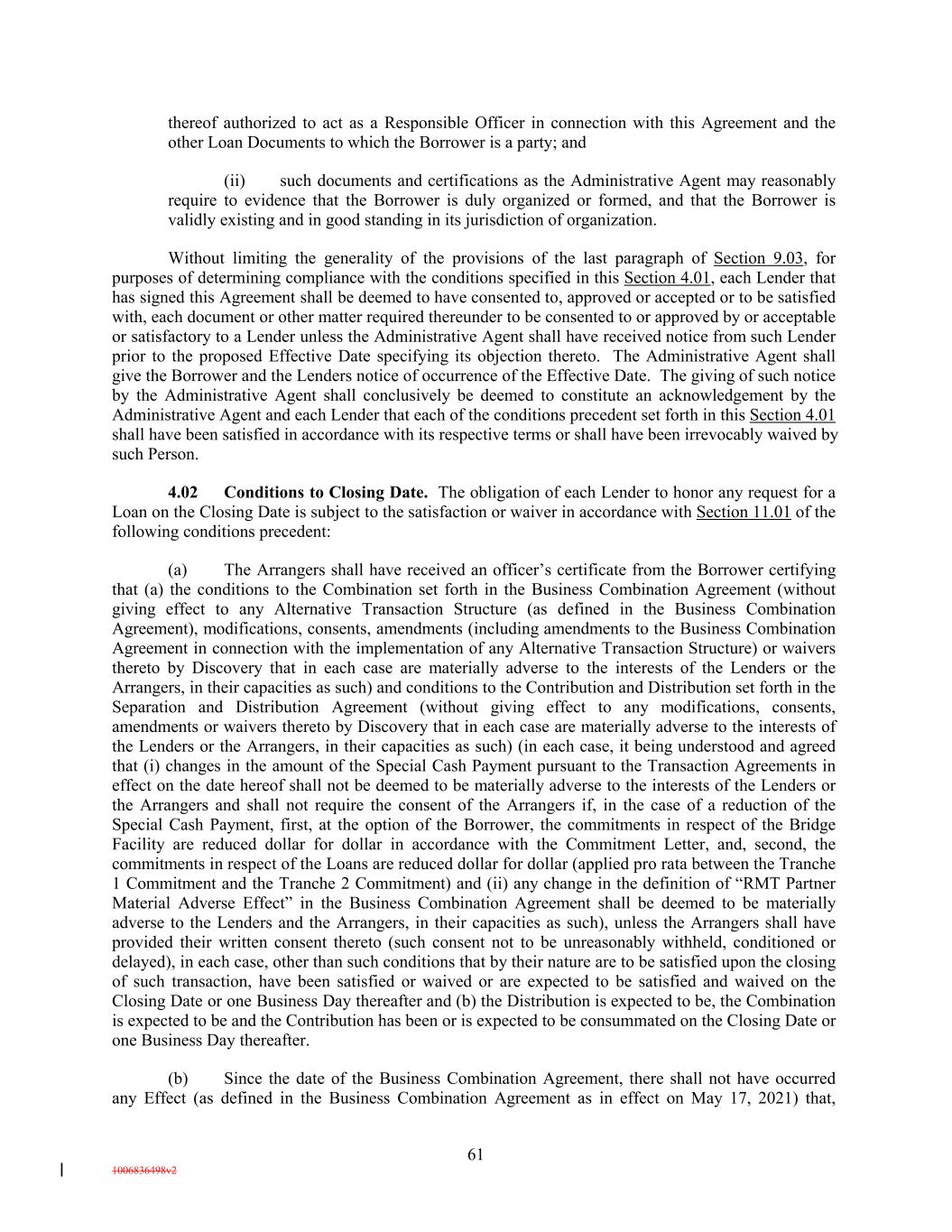 thereof authorized to act as a Responsible Officer in connection with this Agreement and the other Loan Documents to which the Borrower is a party; and (ii) such documents and certifications as the Administrative Agent may reasonably require to evidence that the Borrower is duly organized or formed, and that the Borrower is validly existing and in good standing in its jurisdiction of organization. Without limiting the generality of the provisions of the last paragraph of Section 9.03, for purposes of determining compliance with the conditions specified in this Section 4.01, each Lender that has signed this Agreement shall be deemed to have consented to, approved or accepted or to be satisfied with, each document or other matter required thereunder to be consented to or approved by or acceptable or satisfactory to a Lender unless the Administrative Agent shall have received notice from such Lender prior to the proposed Effective Date specifying its objection thereto. The Administrative Agent shall give the Borrower and the Lenders notice of occurrence of the Effective Date. The giving of such notice by the Administrative Agent shall conclusively be deemed to constitute an acknowledgement by the Administrative Agent and each Lender that each of the conditions precedent set forth in this Section 4.01 shall have been satisfied in accordance with its respective terms or shall have been irrevocably waived by such Person. 4.02 Conditions to Closing Date. The obligation of each Lender to honor any request for a Loan on the Closing Date is subject to the satisfaction or waiver in accordance with Section 11.01 of the following conditions precedent: (a) The Arrangers shall have received an officer’s certificate from the Borrower certifying that (a) the conditions to the Combination set forth in the Business Combination Agreement (without giving effect to any Alternative Transaction Structure (as defined in the Business Combination Agreement), modifications, consents, amendments (including amendments to the Business Combination Agreement in connection with the implementation of any Alternative Transaction Structure) or waivers thereto by Discovery that in each case are materially adverse to the interests of the Lenders or the Arrangers, in their capacities as such) and conditions to the Contribution and Distribution set forth in the Separation and Distribution Agreement (without giving effect to any modifications, consents, amendments or waivers thereto by Discovery that in each case are materially adverse to the interests of the Lenders or the Arrangers, in their capacities as such) (in each case, it being understood and agreed that (i) changes in the amount of the Special Cash Payment pursuant to the Transaction Agreements in effect on the date hereof shall not be deemed to be materially adverse to the interests of the Lenders or the Arrangers and shall not require the consent of the Arrangers if, in the case of a reduction of the Special Cash Payment, first, at the option of the Borrower, the commitments in respect of the Bridge Facility are reduced dollar for dollar in accordance with the Commitment Letter, and, second, the commitments in respect of the Loans are reduced dollar for dollar (applied pro rata between the Tranche 1 Commitment and the Tranche 2 Commitment) and (ii) any change in the definition of “RMT Partner Material Adverse Effect” in the Business Combination Agreement shall be deemed to be materially adverse to the Lenders and the Arrangers, in their capacities as such), unless the Arrangers shall have provided their written consent thereto (such consent not to be unreasonably withheld, conditioned or delayed), in each case, other than such conditions that by their nature are to be satisfied upon the closing of such transaction, have been satisfied or waived or are expected to be satisfied and waived on the Closing Date or one Business Day thereafter and (b) the Distribution is expected to be, the Combination is expected to be and the Contribution has been or is expected to be consummated on the Closing Date or one Business Day thereafter. (b) Since the date of the Business Combination Agreement, there shall not have occurred any Effect (as defined in the Business Combination Agreement as in effect on May 17, 2021) that, 61 1006836498v2