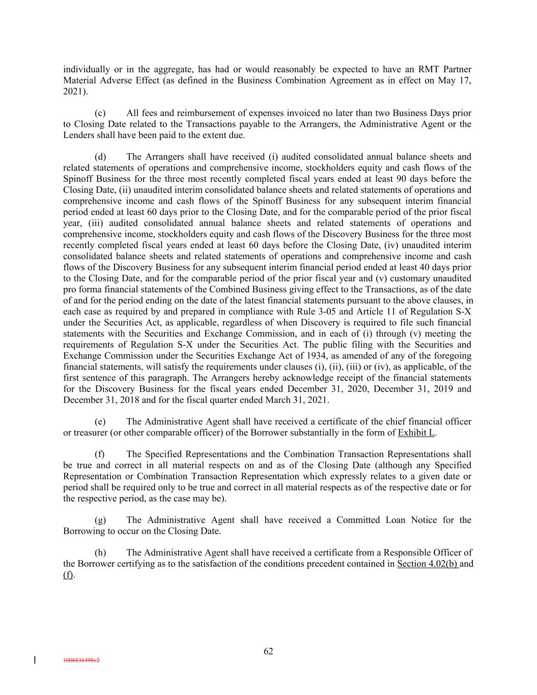 individually or in the aggregate, has had or would reasonably be expected to have an RMT Partner Material Adverse Effect (as defined in the Business Combination Agreement as in effect on May 17, 2021). (c) All fees and reimbursement of expenses invoiced no later than two Business Days prior to Closing Date related to the Transactions payable to the Arrangers, the Administrative Agent or the Lenders shall have been paid to the extent due. (d) The Arrangers shall have received (i) audited consolidated annual balance sheets and related statements of operations and comprehensive income, stockholders equity and cash flows of the Spinoff Business for the three most recently completed fiscal years ended at least 90 days before the Closing Date, (ii) unaudited interim consolidated balance sheets and related statements of operations and comprehensive income and cash flows of the Spinoff Business for any subsequent interim financial period ended at least 60 days prior to the Closing Date, and for the comparable period of the prior fiscal year, (iii) audited consolidated annual balance sheets and related statements of operations and comprehensive income, stockholders equity and cash flows of the Discovery Business for the three most recently completed fiscal years ended at least 60 days before the Closing Date, (iv) unaudited interim consolidated balance sheets and related statements of operations and comprehensive income and cash flows of the Discovery Business for any subsequent interim financial period ended at least 40 days prior to the Closing Date, and for the comparable period of the prior fiscal year and (v) customary unaudited pro forma financial statements of the Combined Business giving effect to the Transactions, as of the date of and for the period ending on the date of the latest financial statements pursuant to the above clauses, in each case as required by and prepared in compliance with Rule 3-05 and Article 11 of Regulation S-X under the Securities Act, as applicable, regardless of when Discovery is required to file such financial statements with the Securities and Exchange Commission, and in each of (i) through (v) meeting the requirements of Regulation S-X under the Securities Act. The public filing with the Securities and Exchange Commission under the Securities Exchange Act of 1934, as amended of any of the foregoing financial statements, will satisfy the requirements under clauses (i), (ii), (iii) or (iv), as applicable, of the first sentence of this paragraph. The Arrangers hereby acknowledge receipt of the financial statements for the Discovery Business for the fiscal years ended December 31, 2020, December 31, 2019 and December 31, 2018 and for the fiscal quarter ended March 31, 2021. (e) The Administrative Agent shall have received a certificate of the chief financial officer or treasurer (or other comparable officer) of the Borrower substantially in the form of Exhibit L. (f) The Specified Representations and the Combination Transaction Representations shall be true and correct in all material respects on and as of the Closing Date (although any Specified Representation or Combination Transaction Representation which expressly relates to a given date or period shall be required only to be true and correct in all material respects as of the respective date or for the respective period, as the case may be). (g) The Administrative Agent shall have received a Committed Loan Notice for the Borrowing to occur on the Closing Date. (h) The Administrative Agent shall have received a certificate from a Responsible Officer of the Borrower certifying as to the satisfaction of the conditions precedent contained in Section 4.02(b) and (f). 62 1006836498v2