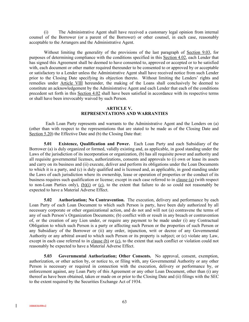 (i) The Administrative Agent shall have received a customary legal opinion from internal counsel of the Borrower (or a parent of the Borrower) or other counsel, in each case, reasonably acceptable to the Arrangers and the Administrative Agent. Without limiting the generality of the provisions of the last paragraph of Section 9.03, for purposes of determining compliance with the conditions specified in this Section 4.02, each Lender that has signed this Agreement shall be deemed to have consented to, approved or accepted or to be satisfied with, each document or other matter required thereunder to be consented to or approved by or acceptable or satisfactory to a Lender unless the Administrative Agent shall have received notice from such Lender prior to the Closing Date specifying its objection thereto. Without limiting the Lenders’ rights and remedies under Article VIII hereunder, the making of the Loans shall conclusively be deemed to constitute an acknowledgement by the Administrative Agent and each Lender that each of the conditions precedent set forth in this Section 4.02 shall have been satisfied in accordance with its respective terms or shall have been irrevocably waived by such Person. ARTICLE V. REPRESENTATIONS AND WARRANTIES Each Loan Party represents and warrants to the Administrative Agent and the Lenders on (a) (other than with respect to the representations that are stated to be made as of the Closing Date and Section 5.20) the Effective Date and (b) the Closing Date that: 5.01 Existence, Qualification and Power. Each Loan Party and each Subsidiary of the Borrower (a) is duly organized or formed, validly existing and, as applicable, in good standing under the Laws of the jurisdiction of its incorporation or organization, (b) has all requisite power and authority and all requisite governmental licenses, authorizations, consents and approvals to (i) own or lease its assets and carry on its business and (ii) execute, deliver and perform its obligations under the Loan Documents to which it is a party, and (c) is duly qualified and is licensed and, as applicable, in good standing under the Laws of each jurisdiction where its ownership, lease or operation of properties or the conduct of its business requires such qualification or license; except in each case referred to in clause (a) (with respect to non-Loan Parties only), (b)(i) or (c), to the extent that failure to do so could not reasonably be expected to have a Material Adverse Effect. 5.02 Authorization; No Contravention. The execution, delivery and performance by each Loan Party of each Loan Document to which such Person is party, have been duly authorized by all necessary corporate or other organizational action, and do not and will not (a) contravene the terms of any of such Person’s Organization Documents; (b) conflict with or result in any breach or contravention of, or the creation of any Lien under, or require any payment to be made under (i) any Contractual Obligation to which such Person is a party or affecting such Person or the properties of such Person or any Subsidiary of the Borrower or (ii) any order, injunction, writ or decree of any Governmental Authority or any arbitral award to which such Person or its property is subject; or (c) violate any Law, except in each case referred to in clause (b) or (c), to the extent that such conflict or violation could not reasonably be expected to have a Material Adverse Effect. 5.03 Governmental Authorization; Other Consents. No approval, consent, exemption, authorization, or other action by, or notice to, or filing with, any Governmental Authority or any other Person is necessary or required in connection with the execution, delivery or performance by, or enforcement against, any Loan Party of this Agreement or any other Loan Document, other than (i) any thereof as have been obtained, taken or made on or prior to the Closing Date and (ii) filings with the SEC to the extent required by the Securities Exchange Act of 1934. 63 1006836498v2