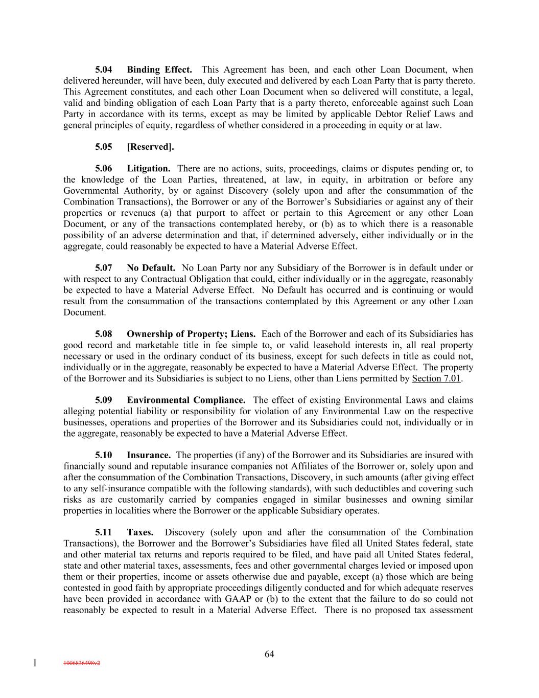 5.04 Binding Effect. This Agreement has been, and each other Loan Document, when delivered hereunder, will have been, duly executed and delivered by each Loan Party that is party thereto. This Agreement constitutes, and each other Loan Document when so delivered will constitute, a legal, valid and binding obligation of each Loan Party that is a party thereto, enforceable against such Loan Party in accordance with its terms, except as may be limited by applicable Debtor Relief Laws and general principles of equity, regardless of whether considered in a proceeding in equity or at law. 5.05 [Reserved]. 5.06 Litigation. There are no actions, suits, proceedings, claims or disputes pending or, to the knowledge of the Loan Parties, threatened, at law, in equity, in arbitration or before any Governmental Authority, by or against Discovery (solely upon and after the consummation of the Combination Transactions), the Borrower or any of the Borrower’s Subsidiaries or against any of their properties or revenues (a) that purport to affect or pertain to this Agreement or any other Loan Document, or any of the transactions contemplated hereby, or (b) as to which there is a reasonable possibility of an adverse determination and that, if determined adversely, either individually or in the aggregate, could reasonably be expected to have a Material Adverse Effect. 5.07 No Default. No Loan Party nor any Subsidiary of the Borrower is in default under or with respect to any Contractual Obligation that could, either individually or in the aggregate, reasonably be expected to have a Material Adverse Effect. No Default has occurred and is continuing or would result from the consummation of the transactions contemplated by this Agreement or any other Loan Document. 5.08 Ownership of Property; Liens. Each of the Borrower and each of its Subsidiaries has good record and marketable title in fee simple to, or valid leasehold interests in, all real property necessary or used in the ordinary conduct of its business, except for such defects in title as could not, individually or in the aggregate, reasonably be expected to have a Material Adverse Effect. The property of the Borrower and its Subsidiaries is subject to no Liens, other than Liens permitted by Section 7.01. 5.09 Environmental Compliance. The effect of existing Environmental Laws and claims alleging potential liability or responsibility for violation of any Environmental Law on the respective businesses, operations and properties of the Borrower and its Subsidiaries could not, individually or in the aggregate, reasonably be expected to have a Material Adverse Effect. 5.10 Insurance. The properties (if any) of the Borrower and its Subsidiaries are insured with financially sound and reputable insurance companies not Affiliates of the Borrower or, solely upon and after the consummation of the Combination Transactions, Discovery, in such amounts (after giving effect to any self-insurance compatible with the following standards), with such deductibles and covering such risks as are customarily carried by companies engaged in similar businesses and owning similar properties in localities where the Borrower or the applicable Subsidiary operates. 5.11 Taxes. Discovery (solely upon and after the consummation of the Combination Transactions), the Borrower and the Borrower’s Subsidiaries have filed all United States federal, state and other material tax returns and reports required to be filed, and have paid all United States federal, state and other material taxes, assessments, fees and other governmental charges levied or imposed upon them or their properties, income or assets otherwise due and payable, except (a) those which are being contested in good faith by appropriate proceedings diligently conducted and for which adequate reserves have been provided in accordance with GAAP or (b) to the extent that the failure to do so could not reasonably be expected to result in a Material Adverse Effect. There is no proposed tax assessment 64 1006836498v2