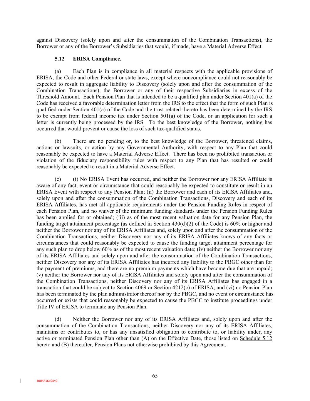 against Discovery (solely upon and after the consummation of the Combination Transactions), the Borrower or any of the Borrower’s Subsidiaries that would, if made, have a Material Adverse Effect. 5.12 ERISA Compliance. (a) Each Plan is in compliance in all material respects with the applicable provisions of ERISA, the Code and other Federal or state laws, except where noncompliance could not reasonably be expected to result in aggregate liability to Discovery (solely upon and after the consummation of the Combination Transactions), the Borrower or any of their respective Subsidiaries in excess of the Threshold Amount. Each Pension Plan that is intended to be a qualified plan under Section 401(a) of the Code has received a favorable determination letter from the IRS to the effect that the form of such Plan is qualified under Section 401(a) of the Code and the trust related thereto has been determined by the IRS to be exempt from federal income tax under Section 501(a) of the Code, or an application for such a letter is currently being processed by the IRS. To the best knowledge of the Borrower, nothing has occurred that would prevent or cause the loss of such tax-qualified status. (b) There are no pending or, to the best knowledge of the Borrower, threatened claims, actions or lawsuits, or action by any Governmental Authority, with respect to any Plan that could reasonably be expected to have a Material Adverse Effect. There has been no prohibited transaction or violation of the fiduciary responsibility rules with respect to any Plan that has resulted or could reasonably be expected to result in a Material Adverse Effect. (c) (i) No ERISA Event has occurred, and neither the Borrower nor any ERISA Affiliate is aware of any fact, event or circumstance that could reasonably be expected to constitute or result in an ERISA Event with respect to any Pension Plan; (ii) the Borrower and each of its ERISA Affiliates and, solely upon and after the consummation of the Combination Transactions, Discovery and each of its ERISA Affiliates, has met all applicable requirements under the Pension Funding Rules in respect of each Pension Plan, and no waiver of the minimum funding standards under the Pension Funding Rules has been applied for or obtained; (iii) as of the most recent valuation date for any Pension Plan, the funding target attainment percentage (as defined in Section 430(d)(2) of the Code) is 60% or higher and neither the Borrower nor any of its ERISA Affiliates and, solely upon and after the consummation of the Combination Transactions, neither Discovery nor any of its ERISA Affiliates knows of any facts or circumstances that could reasonably be expected to cause the funding target attainment percentage for any such plan to drop below 60% as of the most recent valuation date; (iv) neither the Borrower nor any of its ERISA Affiliates and solely upon and after the consummation of the Combination Transactions, neither Discovery nor any of its ERISA Affiliates has incurred any liability to the PBGC other than for the payment of premiums, and there are no premium payments which have become due that are unpaid; (v) neither the Borrower nor any of its ERISA Affiliates and solely upon and after the consummation of the Combination Transactions, neither Discovery nor any of its ERISA Affiliates has engaged in a transaction that could be subject to Section 4069 or Section 4212(c) of ERISA; and (vi) no Pension Plan has been terminated by the plan administrator thereof nor by the PBGC, and no event or circumstance has occurred or exists that could reasonably be expected to cause the PBGC to institute proceedings under Title IV of ERISA to terminate any Pension Plan. (d) Neither the Borrower nor any of its ERISA Affiliates and, solely upon and after the consummation of the Combination Transactions, neither Discovery nor any of its ERISA Affiliates, maintains or contributes to, or has any unsatisfied obligation to contribute to, or liability under, any active or terminated Pension Plan other than (A) on the Effective Date, those listed on Schedule 5.12 hereto and (B) thereafter, Pension Plans not otherwise prohibited by this Agreement. 65 1006836498v2