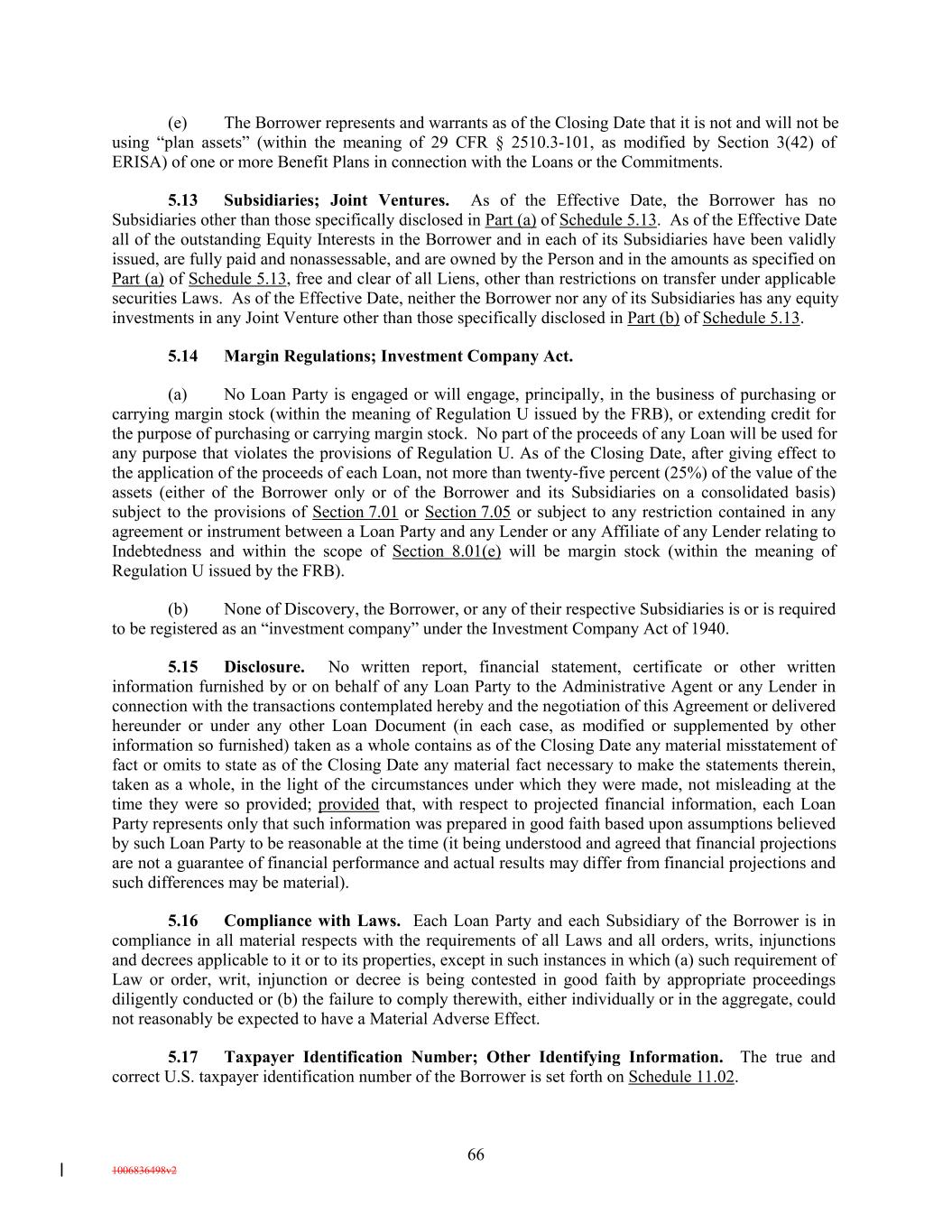 (e) The Borrower represents and warrants as of the Closing Date that it is not and will not be using “plan assets” (within the meaning of 29 CFR § 2510.3-101, as modified by Section 3(42) of ERISA) of one or more Benefit Plans in connection with the Loans or the Commitments. 5.13 Subsidiaries; Joint Ventures. As of the Effective Date, the Borrower has no Subsidiaries other than those specifically disclosed in Part (a) of Schedule 5.13. As of the Effective Date all of the outstanding Equity Interests in the Borrower and in each of its Subsidiaries have been validly issued, are fully paid and nonassessable, and are owned by the Person and in the amounts as specified on Part (a) of Schedule 5.13, free and clear of all Liens, other than restrictions on transfer under applicable securities Laws. As of the Effective Date, neither the Borrower nor any of its Subsidiaries has any equity investments in any Joint Venture other than those specifically disclosed in Part (b) of Schedule 5.13. 5.14 Margin Regulations; Investment Company Act. (a) No Loan Party is engaged or will engage, principally, in the business of purchasing or carrying margin stock (within the meaning of Regulation U issued by the FRB), or extending credit for the purpose of purchasing or carrying margin stock. No part of the proceeds of any Loan will be used for any purpose that violates the provisions of Regulation U. As of the Closing Date, after giving effect to the application of the proceeds of each Loan, not more than twenty-five percent (25%) of the value of the assets (either of the Borrower only or of the Borrower and its Subsidiaries on a consolidated basis) subject to the provisions of Section 7.01 or Section 7.05 or subject to any restriction contained in any agreement or instrument between a Loan Party and any Lender or any Affiliate of any Lender relating to Indebtedness and within the scope of Section 8.01(e) will be margin stock (within the meaning of Regulation U issued by the FRB). (b) None of Discovery, the Borrower, or any of their respective Subsidiaries is or is required to be registered as an “investment company” under the Investment Company Act of 1940. 5.15 Disclosure. No written report, financial statement, certificate or other written information furnished by or on behalf of any Loan Party to the Administrative Agent or any Lender in connection with the transactions contemplated hereby and the negotiation of this Agreement or delivered hereunder or under any other Loan Document (in each case, as modified or supplemented by other information so furnished) taken as a whole contains as of the Closing Date any material misstatement of fact or omits to state as of the Closing Date any material fact necessary to make the statements therein, taken as a whole, in the light of the circumstances under which they were made, not misleading at the time they were so provided; provided that, with respect to projected financial information, each Loan Party represents only that such information was prepared in good faith based upon assumptions believed by such Loan Party to be reasonable at the time (it being understood and agreed that financial projections are not a guarantee of financial performance and actual results may differ from financial projections and such differences may be material). 5.16 Compliance with Laws. Each Loan Party and each Subsidiary of the Borrower is in compliance in all material respects with the requirements of all Laws and all orders, writs, injunctions and decrees applicable to it or to its properties, except in such instances in which (a) such requirement of Law or order, writ, injunction or decree is being contested in good faith by appropriate proceedings diligently conducted or (b) the failure to comply therewith, either individually or in the aggregate, could not reasonably be expected to have a Material Adverse Effect. 5.17 Taxpayer Identification Number; Other Identifying Information. The true and correct U.S. taxpayer identification number of the Borrower is set forth on Schedule 11.02. 66 1006836498v2