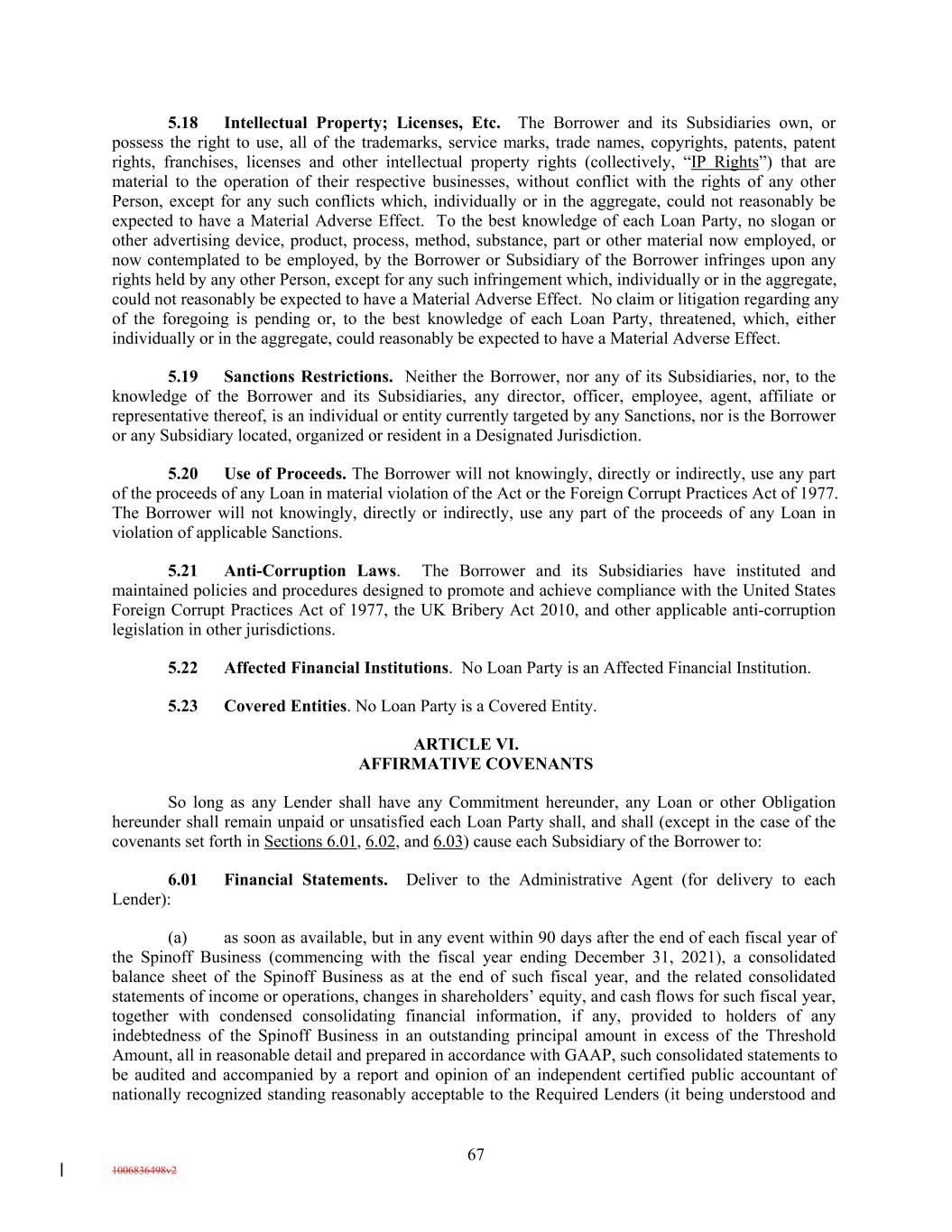 5.18 Intellectual Property; Licenses, Etc. The Borrower and its Subsidiaries own, or possess the right to use, all of the trademarks, service marks, trade names, copyrights, patents, patent rights, franchises, licenses and other intellectual property rights (collectively, “IP Rights”) that are material to the operation of their respective businesses, without conflict with the rights of any other Person, except for any such conflicts which, individually or in the aggregate, could not reasonably be expected to have a Material Adverse Effect. To the best knowledge of each Loan Party, no slogan or other advertising device, product, process, method, substance, part or other material now employed, or now contemplated to be employed, by the Borrower or Subsidiary of the Borrower infringes upon any rights held by any other Person, except for any such infringement which, individually or in the aggregate, could not reasonably be expected to have a Material Adverse Effect. No claim or litigation regarding any of the foregoing is pending or, to the best knowledge of each Loan Party, threatened, which, either individually or in the aggregate, could reasonably be expected to have a Material Adverse Effect. 5.19 Sanctions Restrictions. Neither the Borrower, nor any of its Subsidiaries, nor, to the knowledge of the Borrower and its Subsidiaries, any director, officer, employee, agent, affiliate or representative thereof, is an individual or entity currently targeted by any Sanctions, nor is the Borrower or any Subsidiary located, organized or resident in a Designated Jurisdiction. 5.20 Use of Proceeds. The Borrower will not knowingly, directly or indirectly, use any part of the proceeds of any Loan in material violation of the Act or the Foreign Corrupt Practices Act of 1977. The Borrower will not knowingly, directly or indirectly, use any part of the proceeds of any Loan in violation of applicable Sanctions. 5.21 Anti-Corruption Laws. The Borrower and its Subsidiaries have instituted and maintained policies and procedures designed to promote and achieve compliance with the United States Foreign Corrupt Practices Act of 1977, the UK Bribery Act 2010, and other applicable anti-corruption legislation in other jurisdictions. 5.22 Affected Financial Institutions. No Loan Party is an Affected Financial Institution. 5.23 Covered Entities. No Loan Party is a Covered Entity. ARTICLE VI. AFFIRMATIVE COVENANTS So long as any Lender shall have any Commitment hereunder, any Loan or other Obligation hereunder shall remain unpaid or unsatisfied each Loan Party shall, and shall (except in the case of the covenants set forth in Sections 6.01, 6.02, and 6.03) cause each Subsidiary of the Borrower to: 6.01 Financial Statements. Deliver to the Administrative Agent (for delivery to each Lender): (a) as soon as available, but in any event within 90 days after the end of each fiscal year of the Spinoff Business (commencing with the fiscal year ending December 31, 2021), a consolidated balance sheet of the Spinoff Business as at the end of such fiscal year, and the related consolidated statements of income or operations, changes in shareholders’ equity, and cash flows for such fiscal year, together with condensed consolidating financial information, if any, provided to holders of any indebtedness of the Spinoff Business in an outstanding principal amount in excess of the Threshold Amount, all in reasonable detail and prepared in accordance with GAAP, such consolidated statements to be audited and accompanied by a report and opinion of an independent certified public accountant of nationally recognized standing reasonably acceptable to the Required Lenders (it being understood and 67 1006836498v2