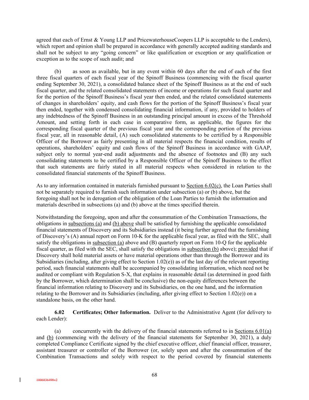 agreed that each of Ernst & Young LLP and PricewaterhouseCoopers LLP is acceptable to the Lenders), which report and opinion shall be prepared in accordance with generally accepted auditing standards and shall not be subject to any “going concern” or like qualification or exception or any qualification or exception as to the scope of such audit; and (b) as soon as available, but in any event within 60 days after the end of each of the first three fiscal quarters of each fiscal year of the Spinoff Business (commencing with the fiscal quarter ending September 30, 2021), a consolidated balance sheet of the Spinoff Business as at the end of such fiscal quarter, and the related consolidated statements of income or operations for such fiscal quarter and for the portion of the Spinoff Business’s fiscal year then ended, and the related consolidated statements of changes in shareholders’ equity, and cash flows for the portion of the Spinoff Business’s fiscal year then ended, together with condensed consolidating financial information, if any, provided to holders of any indebtedness of the Spinoff Business in an outstanding principal amount in excess of the Threshold Amount, and setting forth in each case in comparative form, as applicable, the figures for the corresponding fiscal quarter of the previous fiscal year and the corresponding portion of the previous fiscal year, all in reasonable detail, (A) such consolidated statements to be certified by a Responsible Officer of the Borrower as fairly presenting in all material respects the financial condition, results of operations, shareholders’ equity and cash flows of the Spinoff Business in accordance with GAAP, subject only to normal year-end audit adjustments and the absence of footnotes and (B) any such consolidating statements to be certified by a Responsible Officer of the Spinoff Business to the effect that such statements are fairly stated in all material respects when considered in relation to the consolidated financial statements of the Spinoff Business. As to any information contained in materials furnished pursuant to Section 6.02(c), the Loan Parties shall not be separately required to furnish such information under subsection (a) or (b) above, but the foregoing shall not be in derogation of the obligation of the Loan Parties to furnish the information and materials described in subsections (a) and (b) above at the times specified therein. Notwithstanding the foregoing, upon and after the consummation of the Combination Transactions, the obligations in subsections (a) and (b) above shall be satisfied by furnishing the applicable consolidated financial statements of Discovery and its Subsidiaries instead (it being further agreed that the furnishing of Discovery’s (A) annual report on Form 10-K for the applicable fiscal year, as filed with the SEC, shall satisfy the obligations in subsection (a) above and (B) quarterly report on Form 10-Q for the applicable fiscal quarter, as filed with the SEC, shall satisfy the obligations in subsection (b) above); provided that if Discovery shall hold material assets or have material operations other than through the Borrower and its Subsidiaries (including, after giving effect to Section 1.02(e)) as of the last day of the relevant reporting period, such financial statements shall be accompanied by consolidating information, which need not be audited or compliant with Regulation S-X, that explains in reasonable detail (as determined in good faith by the Borrower, which determination shall be conclusive) the non-equity differences between the financial information relating to Discovery and its Subsidiaries, on the one hand, and the information relating to the Borrower and its Subsidiaries (including, after giving effect to Section 1.02(e)) on a standalone basis, on the other hand. 6.02 Certificates; Other Information. Deliver to the Administrative Agent (for delivery to each Lender): (a) concurrently with the delivery of the financial statements referred to in Sections 6.01(a) and (b) (commencing with the delivery of the financial statements for September 30, 2021), a duly completed Compliance Certificate signed by the chief executive officer, chief financial officer, treasurer, assistant treasurer or controller of the Borrower (or, solely upon and after the consummation of the Combination Transactions and solely with respect to the period covered by financial statements 68 1006836498v2