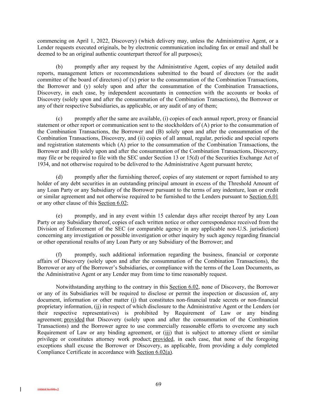 commencing on April 1, 2022, Discovery) (which delivery may, unless the Administrative Agent, or a Lender requests executed originals, be by electronic communication including fax or email and shall be deemed to be an original authentic counterpart thereof for all purposes); (b) promptly after any request by the Administrative Agent, copies of any detailed audit reports, management letters or recommendations submitted to the board of directors (or the audit committee of the board of directors) of (x) prior to the consummation of the Combination Transactions, the Borrower and (y) solely upon and after the consummation of the Combination Transactions, Discovery, in each case, by independent accountants in connection with the accounts or books of Discovery (solely upon and after the consummation of the Combination Transactions), the Borrower or any of their respective Subsidiaries, as applicable, or any audit of any of them; (c) promptly after the same are available, (i) copies of each annual report, proxy or financial statement or other report or communication sent to the stockholders of (A) prior to the consummation of the Combination Transactions, the Borrower and (B) solely upon and after the consummation of the Combination Transactions, Discovery, and (ii) copies of all annual, regular, periodic and special reports and registration statements which (A) prior to the consummation of the Combination Transactions, the Borrower and (B) solely upon and after the consummation of the Combination Transactions, Discovery, may file or be required to file with the SEC under Section 13 or 15(d) of the Securities Exchange Act of 1934, and not otherwise required to be delivered to the Administrative Agent pursuant hereto; (d) promptly after the furnishing thereof, copies of any statement or report furnished to any holder of any debt securities in an outstanding principal amount in excess of the Threshold Amount of any Loan Party or any Subsidiary of the Borrower pursuant to the terms of any indenture, loan or credit or similar agreement and not otherwise required to be furnished to the Lenders pursuant to Section 6.01 or any other clause of this Section 6.02; (e) promptly, and in any event within 15 calendar days after receipt thereof by any Loan Party or any Subsidiary thereof, copies of each written notice or other correspondence received from the Division of Enforcement of the SEC (or comparable agency in any applicable non-U.S. jurisdiction) concerning any investigation or possible investigation or other inquiry by such agency regarding financial or other operational results of any Loan Party or any Subsidiary of the Borrower; and (f) promptly, such additional information regarding the business, financial or corporate affairs of Discovery (solely upon and after the consummation of the Combination Transactions), the Borrower or any of the Borrower’s Subsidiaries, or compliance with the terms of the Loan Documents, as the Administrative Agent or any Lender may from time to time reasonably request. Notwithstanding anything to the contrary in this Section 6.02, none of Discovery, the Borrower or any of its Subsidiaries will be required to disclose or permit the inspection or discussion of, any document, information or other matter (i) that constitutes non-financial trade secrets or non-financial proprietary information, (ii) in respect of which disclosure to the Administrative Agent or the Lenders (or their respective representatives) is prohibited by Requirement of Law or any binding agreement; provided that Discovery (solely upon and after the consummation of the Combination Transactions) and the Borrower agree to use commercially reasonable efforts to overcome any such Requirement of Law or any binding agreement, or (iii) that is subject to attorney client or similar privilege or constitutes attorney work product; provided, in each case, that none of the foregoing exceptions shall excuse the Borrower or Discovery, as applicable, from providing a duly completed Compliance Certificate in accordance with Section 6.02(a). 69 1006836498v2