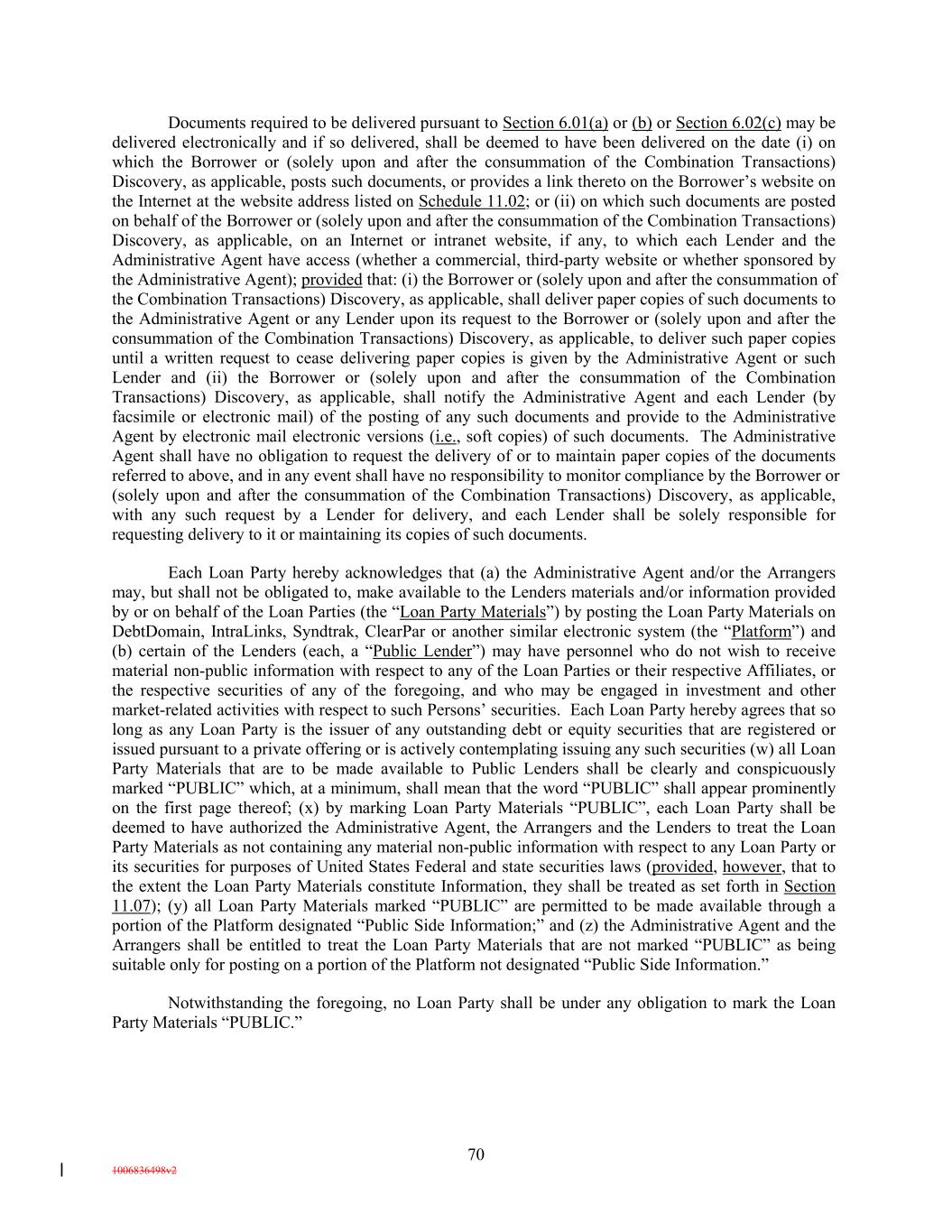 Documents required to be delivered pursuant to Section 6.01(a) or (b) or Section 6.02(c) may be delivered electronically and if so delivered, shall be deemed to have been delivered on the date (i) on which the Borrower or (solely upon and after the consummation of the Combination Transactions) Discovery, as applicable, posts such documents, or provides a link thereto on the Borrower’s website on the Internet at the website address listed on Schedule 11.02; or (ii) on which such documents are posted on behalf of the Borrower or (solely upon and after the consummation of the Combination Transactions) Discovery, as applicable, on an Internet or intranet website, if any, to which each Lender and the Administrative Agent have access (whether a commercial, third-party website or whether sponsored by the Administrative Agent); provided that: (i) the Borrower or (solely upon and after the consummation of the Combination Transactions) Discovery, as applicable, shall deliver paper copies of such documents to the Administrative Agent or any Lender upon its request to the Borrower or (solely upon and after the consummation of the Combination Transactions) Discovery, as applicable, to deliver such paper copies until a written request to cease delivering paper copies is given by the Administrative Agent or such Lender and (ii) the Borrower or (solely upon and after the consummation of the Combination Transactions) Discovery, as applicable, shall notify the Administrative Agent and each Lender (by facsimile or electronic mail) of the posting of any such documents and provide to the Administrative Agent by electronic mail electronic versions (i.e., soft copies) of such documents. The Administrative Agent shall have no obligation to request the delivery of or to maintain paper copies of the documents referred to above, and in any event shall have no responsibility to monitor compliance by the Borrower or (solely upon and after the consummation of the Combination Transactions) Discovery, as applicable, with any such request by a Lender for delivery, and each Lender shall be solely responsible for requesting delivery to it or maintaining its copies of such documents. Each Loan Party hereby acknowledges that (a) the Administrative Agent and/or the Arrangers may, but shall not be obligated to, make available to the Lenders materials and/or information provided by or on behalf of the Loan Parties (the “Loan Party Materials”) by posting the Loan Party Materials on DebtDomain, IntraLinks, Syndtrak, ClearPar or another similar electronic system (the “Platform”) and (b) certain of the Lenders (each, a “Public Lender”) may have personnel who do not wish to receive material non-public information with respect to any of the Loan Parties or their respective Affiliates, or the respective securities of any of the foregoing, and who may be engaged in investment and other market-related activities with respect to such Persons’ securities. Each Loan Party hereby agrees that so long as any Loan Party is the issuer of any outstanding debt or equity securities that are registered or issued pursuant to a private offering or is actively contemplating issuing any such securities (w) all Loan Party Materials that are to be made available to Public Lenders shall be clearly and conspicuously marked “PUBLIC” which, at a minimum, shall mean that the word “PUBLIC” shall appear prominently on the first page thereof; (x) by marking Loan Party Materials “PUBLIC”, each Loan Party shall be deemed to have authorized the Administrative Agent, the Arrangers and the Lenders to treat the Loan Party Materials as not containing any material non-public information with respect to any Loan Party or its securities for purposes of United States Federal and state securities laws (provided, however, that to the extent the Loan Party Materials constitute Information, they shall be treated as set forth in Section 11.07); (y) all Loan Party Materials marked “PUBLIC” are permitted to be made available through a portion of the Platform designated “Public Side Information;” and (z) the Administrative Agent and the Arrangers shall be entitled to treat the Loan Party Materials that are not marked “PUBLIC” as being suitable only for posting on a portion of the Platform not designated “Public Side Information.” Notwithstanding the foregoing, no Loan Party shall be under any obligation to mark the Loan Party Materials “PUBLIC.” 70 1006836498v2