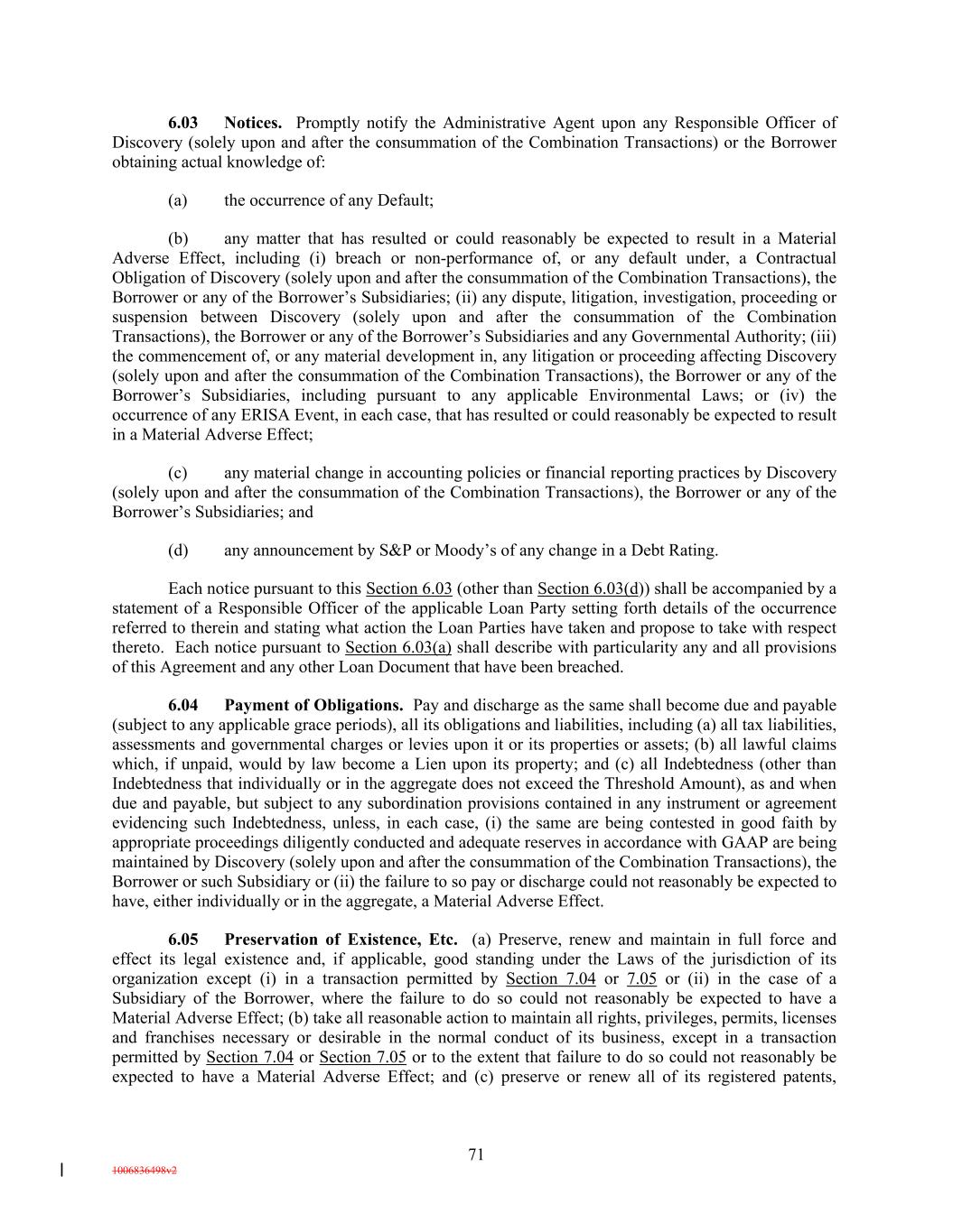 6.03 Notices. Promptly notify the Administrative Agent upon any Responsible Officer of Discovery (solely upon and after the consummation of the Combination Transactions) or the Borrower obtaining actual knowledge of: (a) the occurrence of any Default; (b) any matter that has resulted or could reasonably be expected to result in a Material Adverse Effect, including (i) breach or non-performance of, or any default under, a Contractual Obligation of Discovery (solely upon and after the consummation of the Combination Transactions), the Borrower or any of the Borrower’s Subsidiaries; (ii) any dispute, litigation, investigation, proceeding or suspension between Discovery (solely upon and after the consummation of the Combination Transactions), the Borrower or any of the Borrower’s Subsidiaries and any Governmental Authority; (iii) the commencement of, or any material development in, any litigation or proceeding affecting Discovery (solely upon and after the consummation of the Combination Transactions), the Borrower or any of the Borrower’s Subsidiaries, including pursuant to any applicable Environmental Laws; or (iv) the occurrence of any ERISA Event, in each case, that has resulted or could reasonably be expected to result in a Material Adverse Effect; (c) any material change in accounting policies or financial reporting practices by Discovery (solely upon and after the consummation of the Combination Transactions), the Borrower or any of the Borrower’s Subsidiaries; and (d) any announcement by S&P or Moody’s of any change in a Debt Rating. Each notice pursuant to this Section 6.03 (other than Section 6.03(d)) shall be accompanied by a statement of a Responsible Officer of the applicable Loan Party setting forth details of the occurrence referred to therein and stating what action the Loan Parties have taken and propose to take with respect thereto. Each notice pursuant to Section 6.03(a) shall describe with particularity any and all provisions of this Agreement and any other Loan Document that have been breached. 6.04 Payment of Obligations. Pay and discharge as the same shall become due and payable (subject to any applicable grace periods), all its obligations and liabilities, including (a) all tax liabilities, assessments and governmental charges or levies upon it or its properties or assets; (b) all lawful claims which, if unpaid, would by law become a Lien upon its property; and (c) all Indebtedness (other than Indebtedness that individually or in the aggregate does not exceed the Threshold Amount), as and when due and payable, but subject to any subordination provisions contained in any instrument or agreement evidencing such Indebtedness, unless, in each case, (i) the same are being contested in good faith by appropriate proceedings diligently conducted and adequate reserves in accordance with GAAP are being maintained by Discovery (solely upon and after the consummation of the Combination Transactions), the Borrower or such Subsidiary or (ii) the failure to so pay or discharge could not reasonably be expected to have, either individually or in the aggregate, a Material Adverse Effect. 6.05 Preservation of Existence, Etc. (a) Preserve, renew and maintain in full force and effect its legal existence and, if applicable, good standing under the Laws of the jurisdiction of its organization except (i) in a transaction permitted by Section 7.04 or 7.05 or (ii) in the case of a Subsidiary of the Borrower, where the failure to do so could not reasonably be expected to have a Material Adverse Effect; (b) take all reasonable action to maintain all rights, privileges, permits, licenses and franchises necessary or desirable in the normal conduct of its business, except in a transaction permitted by Section 7.04 or Section 7.05 or to the extent that failure to do so could not reasonably be expected to have a Material Adverse Effect; and (c) preserve or renew all of its registered patents, 71 1006836498v2