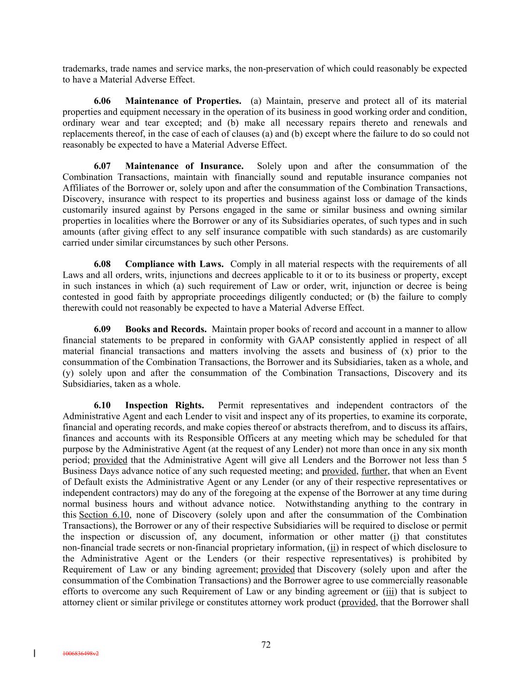 trademarks, trade names and service marks, the non-preservation of which could reasonably be expected to have a Material Adverse Effect. 6.06 Maintenance of Properties. (a) Maintain, preserve and protect all of its material properties and equipment necessary in the operation of its business in good working order and condition, ordinary wear and tear excepted; and (b) make all necessary repairs thereto and renewals and replacements thereof, in the case of each of clauses (a) and (b) except where the failure to do so could not reasonably be expected to have a Material Adverse Effect. 6.07 Maintenance of Insurance. Solely upon and after the consummation of the Combination Transactions, maintain with financially sound and reputable insurance companies not Affiliates of the Borrower or, solely upon and after the consummation of the Combination Transactions, Discovery, insurance with respect to its properties and business against loss or damage of the kinds customarily insured against by Persons engaged in the same or similar business and owning similar properties in localities where the Borrower or any of its Subsidiaries operates, of such types and in such amounts (after giving effect to any self insurance compatible with such standards) as are customarily carried under similar circumstances by such other Persons. 6.08 Compliance with Laws. Comply in all material respects with the requirements of all Laws and all orders, writs, injunctions and decrees applicable to it or to its business or property, except in such instances in which (a) such requirement of Law or order, writ, injunction or decree is being contested in good faith by appropriate proceedings diligently conducted; or (b) the failure to comply therewith could not reasonably be expected to have a Material Adverse Effect. 6.09 Books and Records. Maintain proper books of record and account in a manner to allow financial statements to be prepared in conformity with GAAP consistently applied in respect of all material financial transactions and matters involving the assets and business of (x) prior to the consummation of the Combination Transactions, the Borrower and its Subsidiaries, taken as a whole, and (y) solely upon and after the consummation of the Combination Transactions, Discovery and its Subsidiaries, taken as a whole. 6.10 Inspection Rights. Permit representatives and independent contractors of the Administrative Agent and each Lender to visit and inspect any of its properties, to examine its corporate, financial and operating records, and make copies thereof or abstracts therefrom, and to discuss its affairs, finances and accounts with its Responsible Officers at any meeting which may be scheduled for that purpose by the Administrative Agent (at the request of any Lender) not more than once in any six month period; provided that the Administrative Agent will give all Lenders and the Borrower not less than 5 Business Days advance notice of any such requested meeting; and provided, further, that when an Event of Default exists the Administrative Agent or any Lender (or any of their respective representatives or independent contractors) may do any of the foregoing at the expense of the Borrower at any time during normal business hours and without advance notice. Notwithstanding anything to the contrary in this Section 6.10, none of Discovery (solely upon and after the consummation of the Combination Transactions), the Borrower or any of their respective Subsidiaries will be required to disclose or permit the inspection or discussion of, any document, information or other matter (i) that constitutes non-financial trade secrets or non-financial proprietary information, (ii) in respect of which disclosure to the Administrative Agent or the Lenders (or their respective representatives) is prohibited by Requirement of Law or any binding agreement; provided that Discovery (solely upon and after the consummation of the Combination Transactions) and the Borrower agree to use commercially reasonable efforts to overcome any such Requirement of Law or any binding agreement or (iii) that is subject to attorney client or similar privilege or constitutes attorney work product (provided, that the Borrower shall 72 1006836498v2