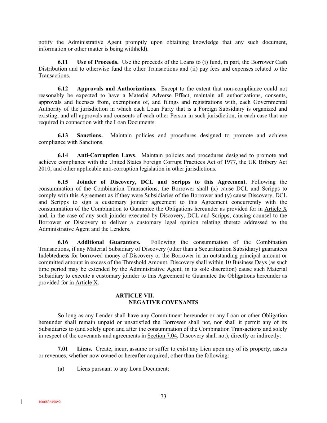 notify the Administrative Agent promptly upon obtaining knowledge that any such document, information or other matter is being withheld). 6.11 Use of Proceeds. Use the proceeds of the Loans to (i) fund, in part, the Borrower Cash Distribution and to otherwise fund the other Transactions and (ii) pay fees and expenses related to the Transactions. 6.12 Approvals and Authorizations. Except to the extent that non-compliance could not reasonably be expected to have a Material Adverse Effect, maintain all authorizations, consents, approvals and licenses from, exemptions of, and filings and registrations with, each Governmental Authority of the jurisdiction in which each Loan Party that is a Foreign Subsidiary is organized and existing, and all approvals and consents of each other Person in such jurisdiction, in each case that are required in connection with the Loan Documents. 6.13 Sanctions. Maintain policies and procedures designed to promote and achieve compliance with Sanctions. 6.14 Anti-Corruption Laws. Maintain policies and procedures designed to promote and achieve compliance with the United States Foreign Corrupt Practices Act of 1977, the UK Bribery Act 2010, and other applicable anti-corruption legislation in other jurisdictions. 6.15 Joinder of Discovery, DCL and Scripps to this Agreement. Following the consummation of the Combination Transactions, the Borrower shall (x) cause DCL and Scripps to comply with this Agreement as if they were Subsidiaries of the Borrower and (y) cause Discovery, DCL and Scripps to sign a customary joinder agreement to this Agreement concurrently with the consummation of the Combination to Guarantee the Obligations hereunder as provided for in Article X and, in the case of any such joinder executed by Discovery, DCL and Scripps, causing counsel to the Borrower or Discovery to deliver a customary legal opinion relating thereto addressed to the Administrative Agent and the Lenders. 6.16 Additional Guarantors. Following the consummation of the Combination Transactions, if any Material Subsidiary of Discovery (other than a Securitization Subsidiary) guarantees Indebtedness for borrowed money of Discovery or the Borrower in an outstanding principal amount or committed amount in excess of the Threshold Amount, Discovery shall within 10 Business Days (as such time period may be extended by the Administrative Agent, in its sole discretion) cause such Material Subsidiary to execute a customary joinder to this Agreement to Guarantee the Obligations hereunder as provided for in Article X. ARTICLE VII. NEGATIVE COVENANTS So long as any Lender shall have any Commitment hereunder or any Loan or other Obligation hereunder shall remain unpaid or unsatisfied the Borrower shall not, nor shall it permit any of its Subsidiaries to (and solely upon and after the consummation of the Combination Transactions and solely in respect of the covenants and agreements in Section 7.04, Discovery shall not), directly or indirectly: 7.01 Liens. Create, incur, assume or suffer to exist any Lien upon any of its property, assets or revenues, whether now owned or hereafter acquired, other than the following: (a) Liens pursuant to any Loan Document; 73 1006836498v2