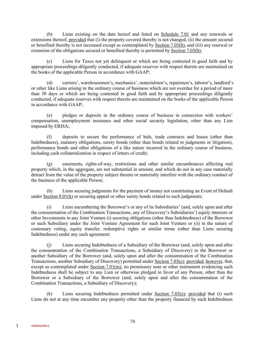 (b) Liens existing on the date hereof and listed on Schedule 7.01 and any renewals or extensions thereof, provided that (i) the property covered thereby is not changed, (ii) the amount secured or benefited thereby is not increased except as contemplated by Section 7.03(b), and (iii) any renewal or extension of the obligations secured or benefited thereby is permitted by Section 7.03(b); (c) Liens for Taxes not yet delinquent or which are being contested in good faith and by appropriate proceedings diligently conducted, if adequate reserves with respect thereto are maintained on the books of the applicable Person in accordance with GAAP; (d) carriers’, warehousemen’s, mechanics’, materialmen’s, repairmen’s, laborer’s, landlord’s or other like Liens arising in the ordinary course of business which are not overdue for a period of more than 30 days or which are being contested in good faith and by appropriate proceedings diligently conducted, if adequate reserves with respect thereto are maintained on the books of the applicable Person in accordance with GAAP; (e) pledges or deposits in the ordinary course of business in connection with workers’ compensation, unemployment insurance and other social security legislation, other than any Lien imposed by ERISA; (f) deposits to secure the performance of bids, trade contracts and leases (other than Indebtedness), statutory obligations, surety bonds (other than bonds related to judgments or litigation), performance bonds and other obligations of a like nature incurred in the ordinary course of business, including cash collateralization in respect of letters of credit; (g) easements, rights-of-way, restrictions and other similar encumbrances affecting real property which, in the aggregate, are not substantial in amount, and which do not in any case materially detract from the value of the property subject thereto or materially interfere with the ordinary conduct of the business of the applicable Person; (h) Liens securing judgments for the payment of money not constituting an Event of Default under Section 8.01(h) or securing appeal or other surety bonds related to such judgments; (i) Liens encumbering the Borrower’s or any of its Subsidiaries’ (and, solely upon and after the consummation of the Combination Transactions, any of Discovery’s Subsidiaries’) equity interests or other Investments in any Joint Venture (i) securing obligations (other than Indebtedness) of the Borrower or such Subsidiary under the Joint Venture Agreement for such Joint Venture or (ii) in the nature of customary voting, equity transfer, redemptive rights or similar terms (other than Liens securing Indebtedness) under any such agreement; (j) Liens securing Indebtedness of a Subsidiary of the Borrower (and, solely upon and after the consummation of the Combination Transactions, a Subsidiary of Discovery) to the Borrower or another Subsidiary of the Borrower (and, solely upon and after the consummation of the Combination Transactions, another Subsidiary of Discovery) permitted under Section 7.03(c); provided, however, that, except as contemplated under Section 7.01(m), no promissory note or other instrument evidencing such Indebtedness shall be subject to any Lien or otherwise pledged in favor of any Person, other than the Borrower or a Subsidiary of the Borrower (and, solely upon and after the consummation of the Combination Transactions, a Subsidiary of Discovery); (k) Liens securing Indebtedness permitted under Section 7.03(e); provided that (i) such Liens do not at any time encumber any property other than the property financed by such Indebtedness 74 1006836498v2