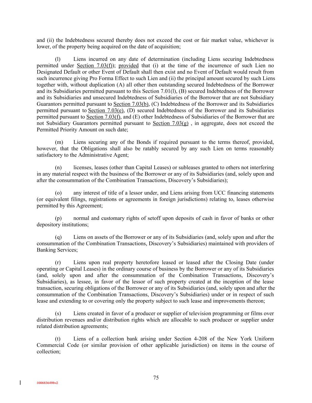 and (ii) the Indebtedness secured thereby does not exceed the cost or fair market value, whichever is lower, of the property being acquired on the date of acquisition; (l) Liens incurred on any date of determination (including Liens securing Indebtedness permitted under Section 7.03(f)); provided that (i) at the time of the incurrence of such Lien no Designated Default or other Event of Default shall then exist and no Event of Default would result from such incurrence giving Pro Forma Effect to such Lien and (ii) the principal amount secured by such Liens together with, without duplication (A) all other then outstanding secured Indebtedness of the Borrower and its Subsidiaries permitted pursuant to this Section 7.01(l), (B) secured Indebtedness of the Borrower and its Subsidiaries and unsecured Indebtedness of Subsidiaries of the Borrower that are not Subsidiary Guarantors permitted pursuant to Section 7.03(b), (C) Indebtedness of the Borrower and its Subsidiaries permitted pursuant to Section 7.03(e), (D) secured Indebtedness of the Borrower and its Subsidiaries permitted pursuant to Section 7.03(f), and (E) other Indebtedness of Subsidiaries of the Borrower that are not Subsidiary Guarantors permitted pursuant to Section 7.03(g) , in aggregate, does not exceed the Permitted Priority Amount on such date; (m) Liens securing any of the Bonds if required pursuant to the terms thereof, provided, however, that the Obligations shall also be ratably secured by any such Lien on terms reasonably satisfactory to the Administrative Agent; (n) licenses, leases (other than Capital Leases) or subleases granted to others not interfering in any material respect with the business of the Borrower or any of its Subsidiaries (and, solely upon and after the consummation of the Combination Transactions, Discovery’s Subsidiaries); (o) any interest of title of a lessor under, and Liens arising from UCC financing statements (or equivalent filings, registrations or agreements in foreign jurisdictions) relating to, leases otherwise permitted by this Agreement; (p) normal and customary rights of setoff upon deposits of cash in favor of banks or other depository institutions; (q) Liens on assets of the Borrower or any of its Subsidiaries (and, solely upon and after the consummation of the Combination Transactions, Discovery’s Subsidiaries) maintained with providers of Banking Services; (r) Liens upon real property heretofore leased or leased after the Closing Date (under operating or Capital Leases) in the ordinary course of business by the Borrower or any of its Subsidiaries (and, solely upon and after the consummation of the Combination Transactions, Discovery’s Subsidiaries), as lessee, in favor of the lessor of such property created at the inception of the lease transaction, securing obligations of the Borrower or any of its Subsidiaries (and, solely upon and after the consummation of the Combination Transactions, Discovery’s Subsidiaries) under or in respect of such lease and extending to or covering only the property subject to such lease and improvements thereon; (s) Liens created in favor of a producer or supplier of television programming or films over distribution revenues and/or distribution rights which are allocable to such producer or supplier under related distribution agreements; (t) Liens of a collection bank arising under Section 4-208 of the New York Uniform Commercial Code (or similar provision of other applicable jurisdiction) on items in the course of collection; 75 1006836498v2
