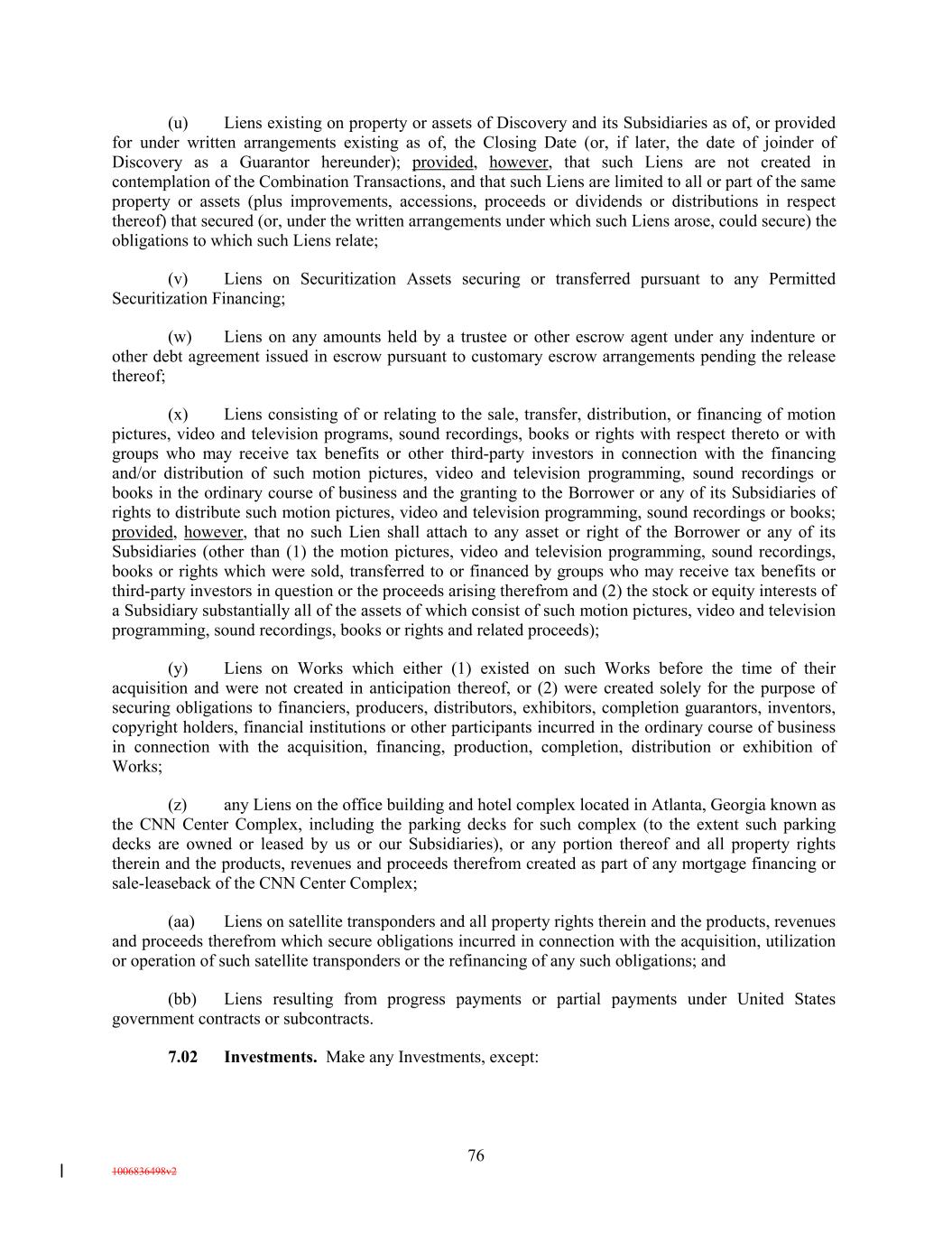 (u) Liens existing on property or assets of Discovery and its Subsidiaries as of, or provided for under written arrangements existing as of, the Closing Date (or, if later, the date of joinder of Discovery as a Guarantor hereunder); provided, however, that such Liens are not created in contemplation of the Combination Transactions, and that such Liens are limited to all or part of the same property or assets (plus improvements, accessions, proceeds or dividends or distributions in respect thereof) that secured (or, under the written arrangements under which such Liens arose, could secure) the obligations to which such Liens relate; (v) Liens on Securitization Assets securing or transferred pursuant to any Permitted Securitization Financing; (w) Liens on any amounts held by a trustee or other escrow agent under any indenture or other debt agreement issued in escrow pursuant to customary escrow arrangements pending the release thereof; (x) Liens consisting of or relating to the sale, transfer, distribution, or financing of motion pictures, video and television programs, sound recordings, books or rights with respect thereto or with groups who may receive tax benefits or other third-party investors in connection with the financing and/or distribution of such motion pictures, video and television programming, sound recordings or books in the ordinary course of business and the granting to the Borrower or any of its Subsidiaries of rights to distribute such motion pictures, video and television programming, sound recordings or books; provided, however, that no such Lien shall attach to any asset or right of the Borrower or any of its Subsidiaries (other than (1) the motion pictures, video and television programming, sound recordings, books or rights which were sold, transferred to or financed by groups who may receive tax benefits or third-party investors in question or the proceeds arising therefrom and (2) the stock or equity interests of a Subsidiary substantially all of the assets of which consist of such motion pictures, video and television programming, sound recordings, books or rights and related proceeds); (y) Liens on Works which either (1) existed on such Works before the time of their acquisition and were not created in anticipation thereof, or (2) were created solely for the purpose of securing obligations to financiers, producers, distributors, exhibitors, completion guarantors, inventors, copyright holders, financial institutions or other participants incurred in the ordinary course of business in connection with the acquisition, financing, production, completion, distribution or exhibition of Works; (z) any Liens on the office building and hotel complex located in Atlanta, Georgia known as the CNN Center Complex, including the parking decks for such complex (to the extent such parking decks are owned or leased by us or our Subsidiaries), or any portion thereof and all property rights therein and the products, revenues and proceeds therefrom created as part of any mortgage financing or sale-leaseback of the CNN Center Complex; (aa) Liens on satellite transponders and all property rights therein and the products, revenues and proceeds therefrom which secure obligations incurred in connection with the acquisition, utilization or operation of such satellite transponders or the refinancing of any such obligations; and (bb) Liens resulting from progress payments or partial payments under United States government contracts or subcontracts. 7.02 Investments. Make any Investments, except: 76 1006836498v2