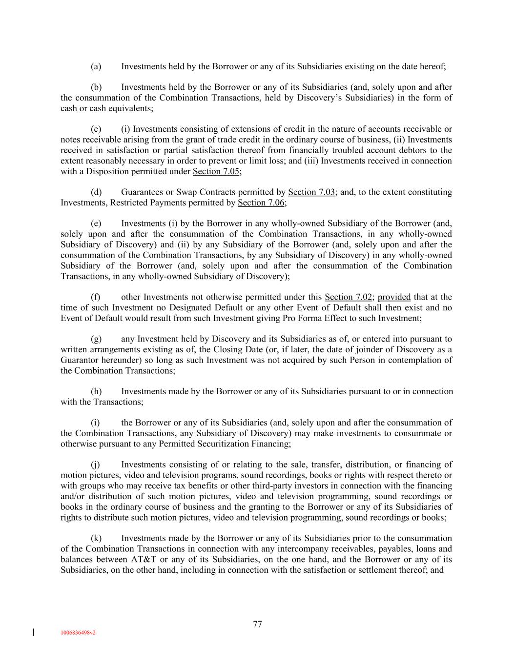 (a) Investments held by the Borrower or any of its Subsidiaries existing on the date hereof; (b) Investments held by the Borrower or any of its Subsidiaries (and, solely upon and after the consummation of the Combination Transactions, held by Discovery’s Subsidiaries) in the form of cash or cash equivalents; (c) (i) Investments consisting of extensions of credit in the nature of accounts receivable or notes receivable arising from the grant of trade credit in the ordinary course of business, (ii) Investments received in satisfaction or partial satisfaction thereof from financially troubled account debtors to the extent reasonably necessary in order to prevent or limit loss; and (iii) Investments received in connection with a Disposition permitted under Section 7.05; (d) Guarantees or Swap Contracts permitted by Section 7.03; and, to the extent constituting Investments, Restricted Payments permitted by Section 7.06; (e) Investments (i) by the Borrower in any wholly-owned Subsidiary of the Borrower (and, solely upon and after the consummation of the Combination Transactions, in any wholly-owned Subsidiary of Discovery) and (ii) by any Subsidiary of the Borrower (and, solely upon and after the consummation of the Combination Transactions, by any Subsidiary of Discovery) in any wholly-owned Subsidiary of the Borrower (and, solely upon and after the consummation of the Combination Transactions, in any wholly-owned Subsidiary of Discovery); (f) other Investments not otherwise permitted under this Section 7.02; provided that at the time of such Investment no Designated Default or any other Event of Default shall then exist and no Event of Default would result from such Investment giving Pro Forma Effect to such Investment; (g) any Investment held by Discovery and its Subsidiaries as of, or entered into pursuant to written arrangements existing as of, the Closing Date (or, if later, the date of joinder of Discovery as a Guarantor hereunder) so long as such Investment was not acquired by such Person in contemplation of the Combination Transactions; (h) Investments made by the Borrower or any of its Subsidiaries pursuant to or in connection with the Transactions; (i) the Borrower or any of its Subsidiaries (and, solely upon and after the consummation of the Combination Transactions, any Subsidiary of Discovery) may make investments to consummate or otherwise pursuant to any Permitted Securitization Financing; (j) Investments consisting of or relating to the sale, transfer, distribution, or financing of motion pictures, video and television programs, sound recordings, books or rights with respect thereto or with groups who may receive tax benefits or other third-party investors in connection with the financing and/or distribution of such motion pictures, video and television programming, sound recordings or books in the ordinary course of business and the granting to the Borrower or any of its Subsidiaries of rights to distribute such motion pictures, video and television programming, sound recordings or books; (k) Investments made by the Borrower or any of its Subsidiaries prior to the consummation of the Combination Transactions in connection with any intercompany receivables, payables, loans and balances between AT&T or any of its Subsidiaries, on the one hand, and the Borrower or any of its Subsidiaries, on the other hand, including in connection with the satisfaction or settlement thereof; and 77 1006836498v2