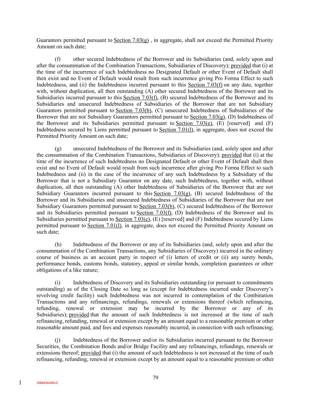 Guarantors permitted pursuant to Section 7.03(g) , in aggregate, shall not exceed the Permitted Priority Amount on such date; (f) other secured Indebtedness of the Borrower and its Subsidiaries (and, solely upon and after the consummation of the Combination Transactions, Subsidiaries of Discovery); provided that (i) at the time of the incurrence of such Indebtedness no Designated Default or other Event of Default shall then exist and no Event of Default would result from such incurrence giving Pro Forma Effect to such Indebtedness, and (ii) the Indebtedness incurred pursuant to this Section 7.03(f) on any date, together with, without duplication, all then outstanding (A) other secured Indebtedness of the Borrower and its Subsidiaries incurred pursuant to this Section 7.03(f), (B) secured Indebtedness of the Borrower and its Subsidiaries and unsecured Indebtedness of Subsidiaries of the Borrower that are not Subsidiary Guarantors permitted pursuant to Section 7.03(b), (C) unsecured Indebtedness of Subsidiaries of the Borrower that are not Subsidiary Guarantors permitted pursuant to Section 7.03(g), (D) Indebtedness of the Borrower and its Subsidiaries permitted pursuant to Section 7.03(e), (E) [reserved] and (F) Indebtedness secured by Liens permitted pursuant to Section 7.01(l), in aggregate, does not exceed the Permitted Priority Amount on such date; (g) unsecured Indebtedness of the Borrower and its Subsidiaries (and, solely upon and after the consummation of the Combination Transactions, Subsidiaries of Discovery); provided that (i) at the time of the incurrence of such Indebtedness no Designated Default or other Event of Default shall then exist and no Event of Default would result from such incurrence after giving Pro Forma Effect to such Indebtedness and (ii) in the case of the incurrence of any such Indebtedness by a Subsidiary of the Borrower that is not a Subsidiary Guarantor on any date, such Indebtedness, together with, without duplication, all then outstanding (A) other Indebtedness of Subsidiaries of the Borrower that are not Subsidiary Guarantors incurred pursuant to this Section 7.03(g), (B) secured Indebtedness of the Borrower and its Subsidiaries and unsecured Indebtedness of Subsidiaries of the Borrower that are not Subsidiary Guarantors permitted pursuant to Section 7.03(b), (C) secured Indebtedness of the Borrower and its Subsidiaries permitted pursuant to Section 7.03(f), (D) Indebtedness of the Borrower and its Subsidiaries permitted pursuant to Section 7.03(e), (E) [reserved] and (F) Indebtedness secured by Liens permitted pursuant to Section 7.01(l), in aggregate, does not exceed the Permitted Priority Amount on such date; (h) Indebtedness of the Borrower or any of its Subsidiaries (and, solely upon and after the consummation of the Combination Transactions, any Subsidiaries of Discovery) incurred in the ordinary course of business as an account party in respect of (i) letters of credit or (ii) any surety bonds, performance bonds, customs bonds, statutory, appeal or similar bonds, completion guarantees or other obligations of a like nature; (i) Indebtedness of Discovery and its Subsidiaries outstanding (or pursuant to commitments outstanding) as of the Closing Date so long as (except for Indebtedness incurred under Discovery’s revolving credit facility) such Indebtedness was not incurred in contemplation of the Combination Transactions and any refinancings, refundings, renewals or extensions thereof (which refinancing, refunding, renewal or extension may be incurred by the Borrower or any of its Subsidiaries); provided that the amount of such Indebtedness is not increased at the time of such refinancing, refunding, renewal or extension except by an amount equal to a reasonable premium or other reasonable amount paid, and fees and expenses reasonably incurred, in connection with such refinancing; (j) Indebtedness of the Borrower and/or its Subsidiaries incurred pursuant to the Borrower Securities, the Combination Bonds and/or Bridge Facility and any refinancings, refundings, renewals or extensions thereof; provided that (i) the amount of such Indebtedness is not increased at the time of such refinancing, refunding, renewal or extension except by an amount equal to a reasonable premium or other 79 1006836498v2