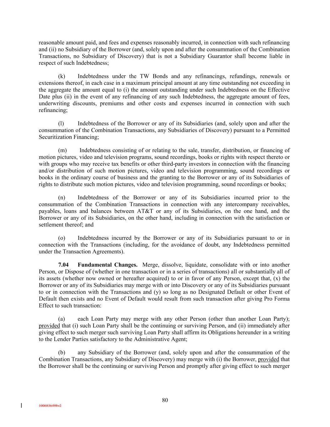 reasonable amount paid, and fees and expenses reasonably incurred, in connection with such refinancing and (ii) no Subsidiary of the Borrower (and, solely upon and after the consummation of the Combination Transactions, no Subsidiary of Discovery) that is not a Subsidiary Guarantor shall become liable in respect of such Indebtedness; (k) Indebtedness under the TW Bonds and any refinancings, refundings, renewals or extensions thereof, in each case in a maximum principal amount at any time outstanding not exceeding in the aggregate the amount equal to (i) the amount outstanding under such Indebtedness on the Effective Date plus (ii) in the event of any refinancing of any such Indebtedness, the aggregate amount of fees, underwriting discounts, premiums and other costs and expenses incurred in connection with such refinancing; (l) Indebtedness of the Borrower or any of its Subsidiaries (and, solely upon and after the consummation of the Combination Transactions, any Subsidiaries of Discovery) pursuant to a Permitted Securitization Financing; (m) Indebtedness consisting of or relating to the sale, transfer, distribution, or financing of motion pictures, video and television programs, sound recordings, books or rights with respect thereto or with groups who may receive tax benefits or other third-party investors in connection with the financing and/or distribution of such motion pictures, video and television programming, sound recordings or books in the ordinary course of business and the granting to the Borrower or any of its Subsidiaries of rights to distribute such motion pictures, video and television programming, sound recordings or books; (n) Indebtedness of the Borrower or any of its Subsidiaries incurred prior to the consummation of the Combination Transactions in connection with any intercompany receivables, payables, loans and balances between AT&T or any of its Subsidiaries, on the one hand, and the Borrower or any of its Subsidiaries, on the other hand, including in connection with the satisfaction or settlement thereof; and (o) Indebtedness incurred by the Borrower or any of its Subsidiaries pursuant to or in connection with the Transactions (including, for the avoidance of doubt, any Indebtedness permitted under the Transaction Agreements). 7.04 Fundamental Changes. Merge, dissolve, liquidate, consolidate with or into another Person, or Dispose of (whether in one transaction or in a series of transactions) all or substantially all of its assets (whether now owned or hereafter acquired) to or in favor of any Person, except that, (x) the Borrower or any of its Subsidiaries may merge with or into Discovery or any of its Subsidiaries pursuant to or in connection with the Transactions and (y) so long as no Designated Default or other Event of Default then exists and no Event of Default would result from such transaction after giving Pro Forma Effect to such transaction: (a) each Loan Party may merge with any other Person (other than another Loan Party); provided that (i) such Loan Party shall be the continuing or surviving Person, and (ii) immediately after giving effect to such merger such surviving Loan Party shall affirm its Obligations hereunder in a writing to the Lender Parties satisfactory to the Administrative Agent; (b) any Subsidiary of the Borrower (and, solely upon and after the consummation of the Combination Transactions, any Subsidiary of Discovery) may merge with (i) the Borrower, provided that the Borrower shall be the continuing or surviving Person and promptly after giving effect to such merger 80 1006836498v2