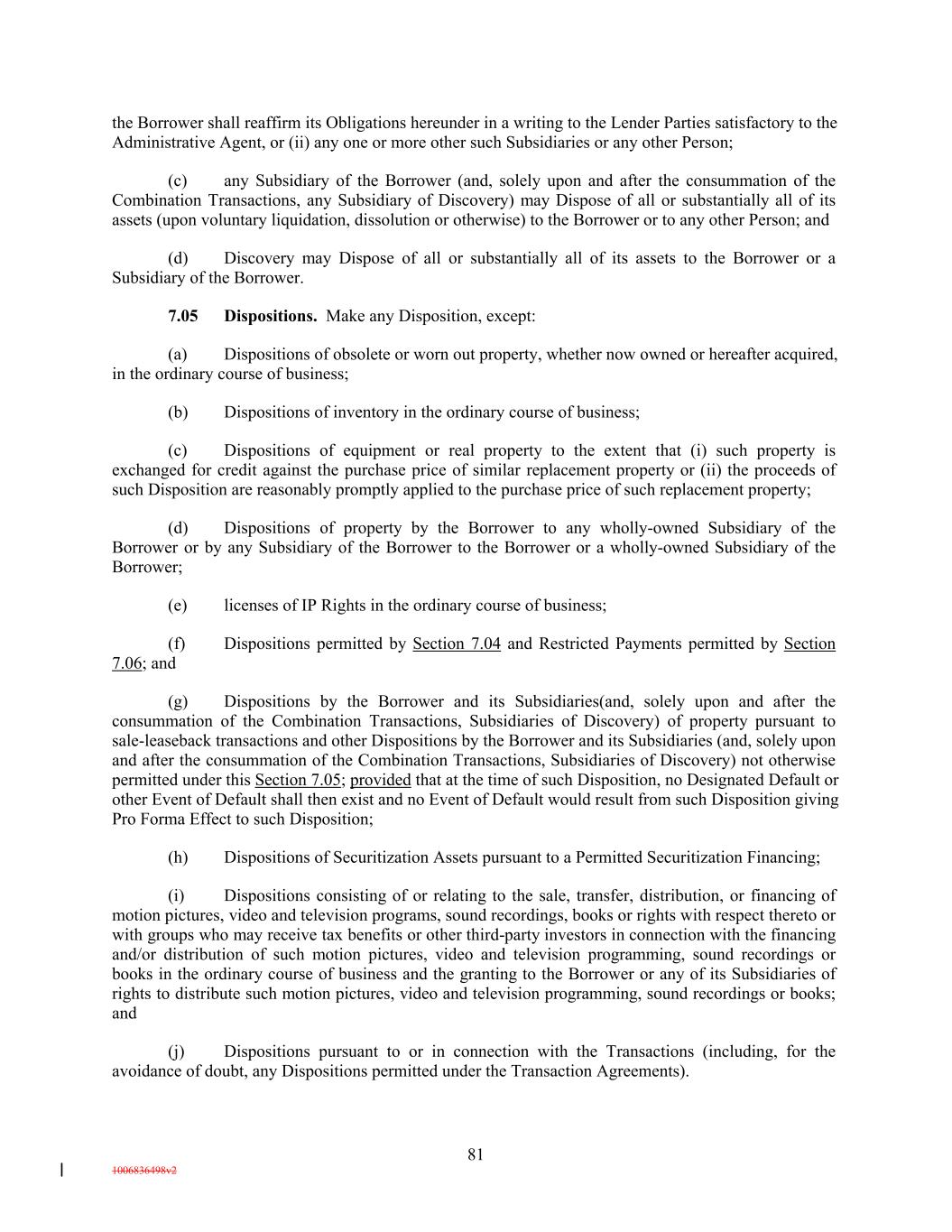 the Borrower shall reaffirm its Obligations hereunder in a writing to the Lender Parties satisfactory to the Administrative Agent, or (ii) any one or more other such Subsidiaries or any other Person; (c) any Subsidiary of the Borrower (and, solely upon and after the consummation of the Combination Transactions, any Subsidiary of Discovery) may Dispose of all or substantially all of its assets (upon voluntary liquidation, dissolution or otherwise) to the Borrower or to any other Person; and (d) Discovery may Dispose of all or substantially all of its assets to the Borrower or a Subsidiary of the Borrower. 7.05 Dispositions. Make any Disposition, except: (a) Dispositions of obsolete or worn out property, whether now owned or hereafter acquired, in the ordinary course of business; (b) Dispositions of inventory in the ordinary course of business; (c) Dispositions of equipment or real property to the extent that (i) such property is exchanged for credit against the purchase price of similar replacement property or (ii) the proceeds of such Disposition are reasonably promptly applied to the purchase price of such replacement property; (d) Dispositions of property by the Borrower to any wholly-owned Subsidiary of the Borrower or by any Subsidiary of the Borrower to the Borrower or a wholly-owned Subsidiary of the Borrower; (e) licenses of IP Rights in the ordinary course of business; (f) Dispositions permitted by Section 7.04 and Restricted Payments permitted by Section 7.06; and (g) Dispositions by the Borrower and its Subsidiaries(and, solely upon and after the consummation of the Combination Transactions, Subsidiaries of Discovery) of property pursuant to sale-leaseback transactions and other Dispositions by the Borrower and its Subsidiaries (and, solely upon and after the consummation of the Combination Transactions, Subsidiaries of Discovery) not otherwise permitted under this Section 7.05; provided that at the time of such Disposition, no Designated Default or other Event of Default shall then exist and no Event of Default would result from such Disposition giving Pro Forma Effect to such Disposition; (h) Dispositions of Securitization Assets pursuant to a Permitted Securitization Financing; (i) Dispositions consisting of or relating to the sale, transfer, distribution, or financing of motion pictures, video and television programs, sound recordings, books or rights with respect thereto or with groups who may receive tax benefits or other third-party investors in connection with the financing and/or distribution of such motion pictures, video and television programming, sound recordings or books in the ordinary course of business and the granting to the Borrower or any of its Subsidiaries of rights to distribute such motion pictures, video and television programming, sound recordings or books; and (j) Dispositions pursuant to or in connection with the Transactions (including, for the avoidance of doubt, any Dispositions permitted under the Transaction Agreements). 81 1006836498v2