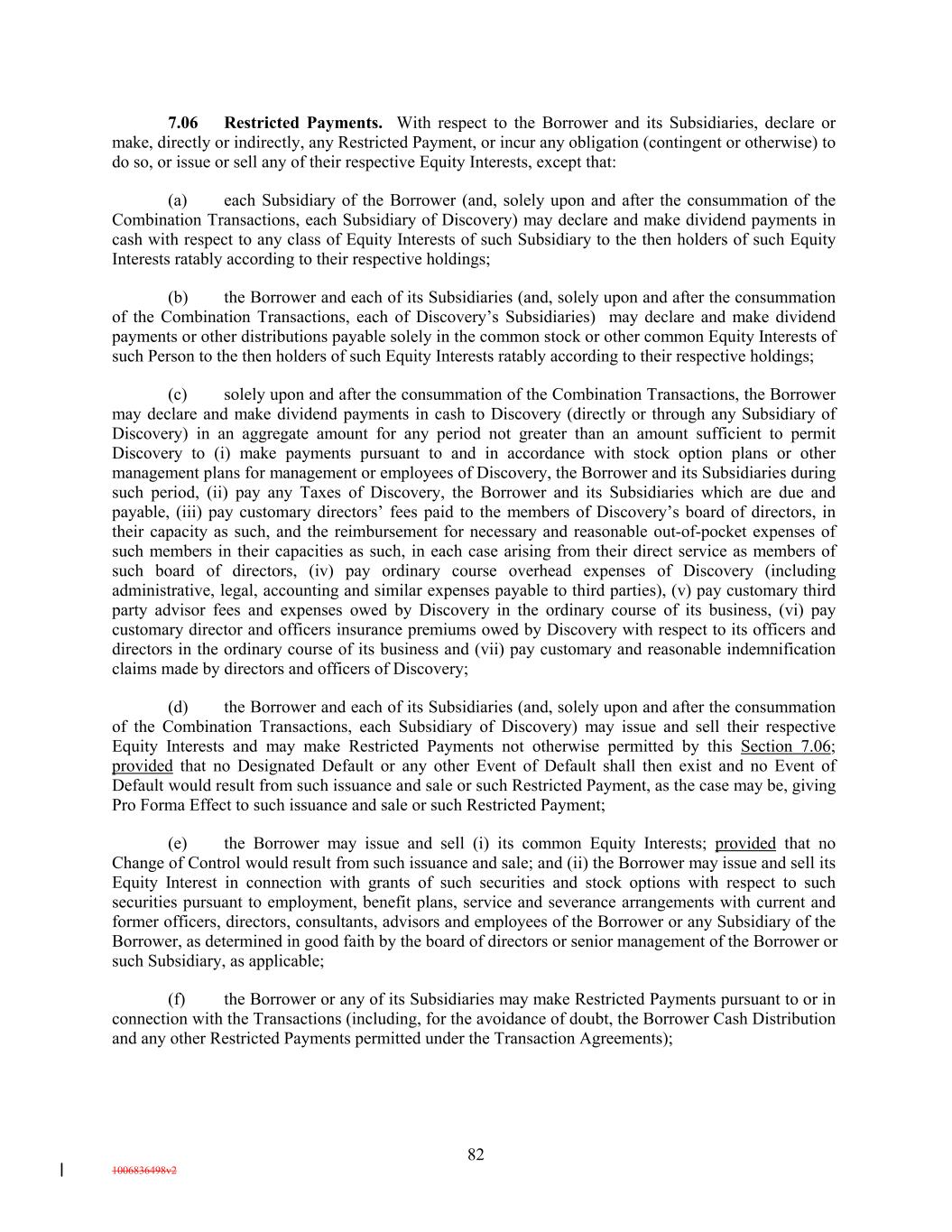 7.06 Restricted Payments. With respect to the Borrower and its Subsidiaries, declare or make, directly or indirectly, any Restricted Payment, or incur any obligation (contingent or otherwise) to do so, or issue or sell any of their respective Equity Interests, except that: (a) each Subsidiary of the Borrower (and, solely upon and after the consummation of the Combination Transactions, each Subsidiary of Discovery) may declare and make dividend payments in cash with respect to any class of Equity Interests of such Subsidiary to the then holders of such Equity Interests ratably according to their respective holdings; (b) the Borrower and each of its Subsidiaries (and, solely upon and after the consummation of the Combination Transactions, each of Discovery’s Subsidiaries) may declare and make dividend payments or other distributions payable solely in the common stock or other common Equity Interests of such Person to the then holders of such Equity Interests ratably according to their respective holdings; (c) solely upon and after the consummation of the Combination Transactions, the Borrower may declare and make dividend payments in cash to Discovery (directly or through any Subsidiary of Discovery) in an aggregate amount for any period not greater than an amount sufficient to permit Discovery to (i) make payments pursuant to and in accordance with stock option plans or other management plans for management or employees of Discovery, the Borrower and its Subsidiaries during such period, (ii) pay any Taxes of Discovery, the Borrower and its Subsidiaries which are due and payable, (iii) pay customary directors’ fees paid to the members of Discovery’s board of directors, in their capacity as such, and the reimbursement for necessary and reasonable out-of-pocket expenses of such members in their capacities as such, in each case arising from their direct service as members of such board of directors, (iv) pay ordinary course overhead expenses of Discovery (including administrative, legal, accounting and similar expenses payable to third parties), (v) pay customary third party advisor fees and expenses owed by Discovery in the ordinary course of its business, (vi) pay customary director and officers insurance premiums owed by Discovery with respect to its officers and directors in the ordinary course of its business and (vii) pay customary and reasonable indemnification claims made by directors and officers of Discovery; (d) the Borrower and each of its Subsidiaries (and, solely upon and after the consummation of the Combination Transactions, each Subsidiary of Discovery) may issue and sell their respective Equity Interests and may make Restricted Payments not otherwise permitted by this Section 7.06; provided that no Designated Default or any other Event of Default shall then exist and no Event of Default would result from such issuance and sale or such Restricted Payment, as the case may be, giving Pro Forma Effect to such issuance and sale or such Restricted Payment; (e) the Borrower may issue and sell (i) its common Equity Interests; provided that no Change of Control would result from such issuance and sale; and (ii) the Borrower may issue and sell its Equity Interest in connection with grants of such securities and stock options with respect to such securities pursuant to employment, benefit plans, service and severance arrangements with current and former officers, directors, consultants, advisors and employees of the Borrower or any Subsidiary of the Borrower, as determined in good faith by the board of directors or senior management of the Borrower or such Subsidiary, as applicable; (f) the Borrower or any of its Subsidiaries may make Restricted Payments pursuant to or in connection with the Transactions (including, for the avoidance of doubt, the Borrower Cash Distribution and any other Restricted Payments permitted under the Transaction Agreements); 82 1006836498v2