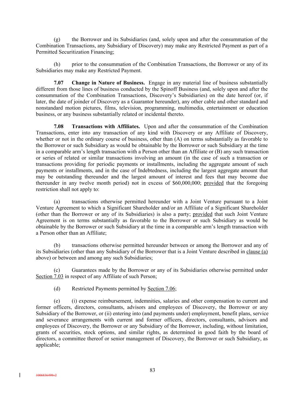 (g) the Borrower and its Subsidiaries (and, solely upon and after the consummation of the Combination Transactions, any Subsidiary of Discovery) may make any Restricted Payment as part of a Permitted Securitization Financing; (h) prior to the consummation of the Combination Transactions, the Borrower or any of its Subsidiaries may make any Restricted Payment. 7.07 Change in Nature of Business. Engage in any material line of business substantially different from those lines of business conducted by the Spinoff Business (and, solely upon and after the consummation of the Combination Transactions, Discovery’s Subsidiaries) on the date hereof (or, if later, the date of joinder of Discovery as a Guarantor hereunder), any other cable and other standard and nonstandard motion pictures, films, television, programming, multimedia, entertainment or education business, or any business substantially related or incidental thereto. 7.08 Transactions with Affiliates. Upon and after the consummation of the Combination Transactions, enter into any transaction of any kind with Discovery or any Affiliate of Discovery, whether or not in the ordinary course of business, other than (A) on terms substantially as favorable to the Borrower or such Subsidiary as would be obtainable by the Borrower or such Subsidiary at the time in a comparable arm’s length transaction with a Person other than an Affiliate or (B) any such transaction or series of related or similar transactions involving an amount (in the case of such a transaction or transactions providing for periodic payments or installments, including the aggregate amount of such payments or installments, and in the case of Indebtedness, including the largest aggregate amount that may be outstanding thereunder and the largest amount of interest and fees that may become due thereunder in any twelve month period) not in excess of $60,000,000; provided that the foregoing restriction shall not apply to: (a) transactions otherwise permitted hereunder with a Joint Venture pursuant to a Joint Venture Agreement to which a Significant Shareholder and/or an Affiliate of a Significant Shareholder (other than the Borrower or any of its Subsidiaries) is also a party; provided that such Joint Venture Agreement is on terms substantially as favorable to the Borrower or such Subsidiary as would be obtainable by the Borrower or such Subsidiary at the time in a comparable arm’s length transaction with a Person other than an Affiliate; (b) transactions otherwise permitted hereunder between or among the Borrower and any of its Subsidiaries (other than any Subsidiary of the Borrower that is a Joint Venture described in clause (a) above) or between and among any such Subsidiaries; (c) Guarantees made by the Borrower or any of its Subsidiaries otherwise permitted under Section 7.03 in respect of any Affiliate of such Person; (d) Restricted Payments permitted by Section 7.06; (e) (i) expense reimbursement, indemnities, salaries and other compensation to current and former officers, directors, consultants, advisors and employees of Discovery, the Borrower or any Subsidiary of the Borrower, or (ii) entering into (and payments under) employment, benefit plans, service and severance arrangements with current and former officers, directors, consultants, advisors and employees of Discovery, the Borrower or any Subsidiary of the Borrower, including, without limitation, grants of securities, stock options, and similar rights, as determined in good faith by the board of directors, a committee thereof or senior management of Discovery, the Borrower or such Subsidiary, as applicable; 83 1006836498v2