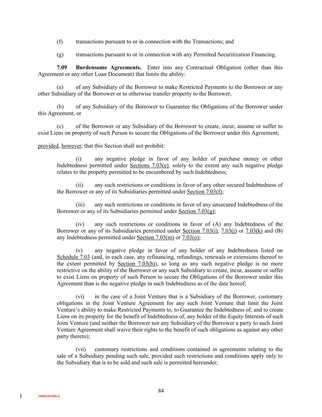 (f) transactions pursuant to or in connection with the Transactions; and (g) transactions pursuant to or in connection with any Permitted Securitization Financing. 7.09 Burdensome Agreements. Enter into any Contractual Obligation (other than this Agreement or any other Loan Document) that limits the ability: (a) of any Subsidiary of the Borrower to make Restricted Payments to the Borrower or any other Subsidiary of the Borrower or to otherwise transfer property to the Borrower, (b) of any Subsidiary of the Borrower to Guarantee the Obligations of the Borrower under this Agreement, or (c) of the Borrower or any Subsidiary of the Borrower to create, incur, assume or suffer to exist Liens on property of such Person to secure the Obligations of the Borrower under this Agreement; provided, however, that this Section shall not prohibit: (i) any negative pledge in favor of any holder of purchase money or other Indebtedness permitted under Sections 7.03(e), solely to the extent any such negative pledge relates to the property permitted to be encumbered by such Indebtedness; (ii) any such restrictions or conditions in favor of any other secured Indebtedness of the Borrower or any of its Subsidiaries permitted under Section 7.03(f); (iii) any such restrictions or conditions in favor of any unsecured Indebtedness of the Borrower or any of its Subsidiaries permitted under Section 7.03(g); (iv) any such restrictions or conditions in favor of (A) any Indebtedness of the Borrower or any of its Subsidiaries permitted under Section 7.03(i), 7.03(j) or 7.03(k) and (B) any Indebtedness permitted under Section 7.03(m) or 7.03(o); (v) any negative pledge in favor of any holder of any Indebtedness listed on Schedule 7.03 (and, in each case, any refinancing, refundings, renewals or extensions thereof to the extent permitted by Section 7.03(b)), so long as any such negative pledge is no more restrictive on the ability of the Borrower or any such Subsidiary to create, incur, assume or suffer to exist Liens on property of such Person to secure the Obligations of the Borrower under this Agreement than is the negative pledge in such Indebtedness as of the date hereof; (vi) in the case of a Joint Venture that is a Subsidiary of the Borrower, customary obligations in the Joint Venture Agreement for any such Joint Venture that limit the Joint Venture’s ability to make Restricted Payments to, to Guarantee the Indebtedness of, and to create Liens on its property for the benefit of Indebtedness of, any holder of the Equity Interests of such Joint Venture (and neither the Borrower nor any Subsidiary of the Borrower a party to such Joint Venture Agreement shall waive their rights to the benefit of such obligations as against any other party thereto); (vii) customary restrictions and conditions contained in agreements relating to the sale of a Subsidiary pending such sale, provided such restrictions and conditions apply only to the Subsidiary that is to be sold and such sale is permitted hereunder; 84 1006836498v2