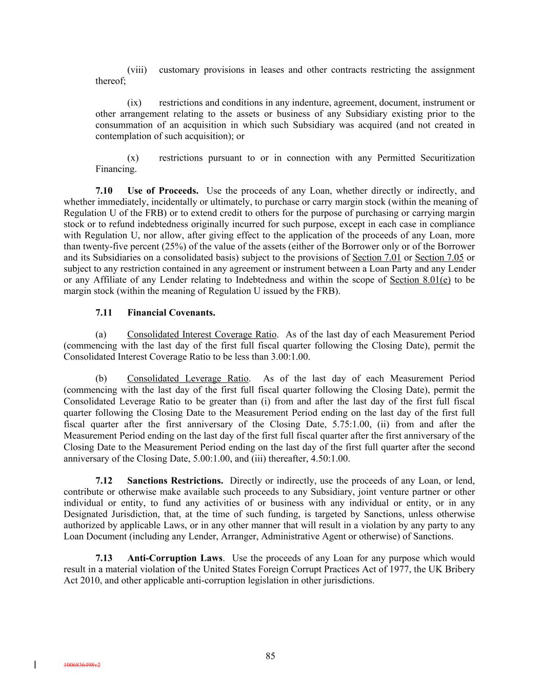 (viii) customary provisions in leases and other contracts restricting the assignment thereof; (ix) restrictions and conditions in any indenture, agreement, document, instrument or other arrangement relating to the assets or business of any Subsidiary existing prior to the consummation of an acquisition in which such Subsidiary was acquired (and not created in contemplation of such acquisition); or (x) restrictions pursuant to or in connection with any Permitted Securitization Financing. 7.10 Use of Proceeds. Use the proceeds of any Loan, whether directly or indirectly, and whether immediately, incidentally or ultimately, to purchase or carry margin stock (within the meaning of Regulation U of the FRB) or to extend credit to others for the purpose of purchasing or carrying margin stock or to refund indebtedness originally incurred for such purpose, except in each case in compliance with Regulation U, nor allow, after giving effect to the application of the proceeds of any Loan, more than twenty-five percent (25%) of the value of the assets (either of the Borrower only or of the Borrower and its Subsidiaries on a consolidated basis) subject to the provisions of Section 7.01 or Section 7.05 or subject to any restriction contained in any agreement or instrument between a Loan Party and any Lender or any Affiliate of any Lender relating to Indebtedness and within the scope of Section 8.01(e) to be margin stock (within the meaning of Regulation U issued by the FRB). 7.11 Financial Covenants. (a) Consolidated Interest Coverage Ratio. As of the last day of each Measurement Period (commencing with the last day of the first full fiscal quarter following the Closing Date), permit the Consolidated Interest Coverage Ratio to be less than 3.00:1.00. (b) Consolidated Leverage Ratio. As of the last day of each Measurement Period (commencing with the last day of the first full fiscal quarter following the Closing Date), permit the Consolidated Leverage Ratio to be greater than (i) from and after the last day of the first full fiscal quarter following the Closing Date to the Measurement Period ending on the last day of the first full fiscal quarter after the first anniversary of the Closing Date, 5.75:1.00, (ii) from and after the Measurement Period ending on the last day of the first full fiscal quarter after the first anniversary of the Closing Date to the Measurement Period ending on the last day of the first full quarter after the second anniversary of the Closing Date, 5.00:1.00, and (iii) thereafter, 4.50:1.00. 7.12 Sanctions Restrictions. Directly or indirectly, use the proceeds of any Loan, or lend, contribute or otherwise make available such proceeds to any Subsidiary, joint venture partner or other individual or entity, to fund any activities of or business with any individual or entity, or in any Designated Jurisdiction, that, at the time of such funding, is targeted by Sanctions, unless otherwise authorized by applicable Laws, or in any other manner that will result in a violation by any party to any Loan Document (including any Lender, Arranger, Administrative Agent or otherwise) of Sanctions. 7.13 Anti-Corruption Laws. Use the proceeds of any Loan for any purpose which would result in a material violation of the United States Foreign Corrupt Practices Act of 1977, the UK Bribery Act 2010, and other applicable anti-corruption legislation in other jurisdictions. 85 1006836498v2