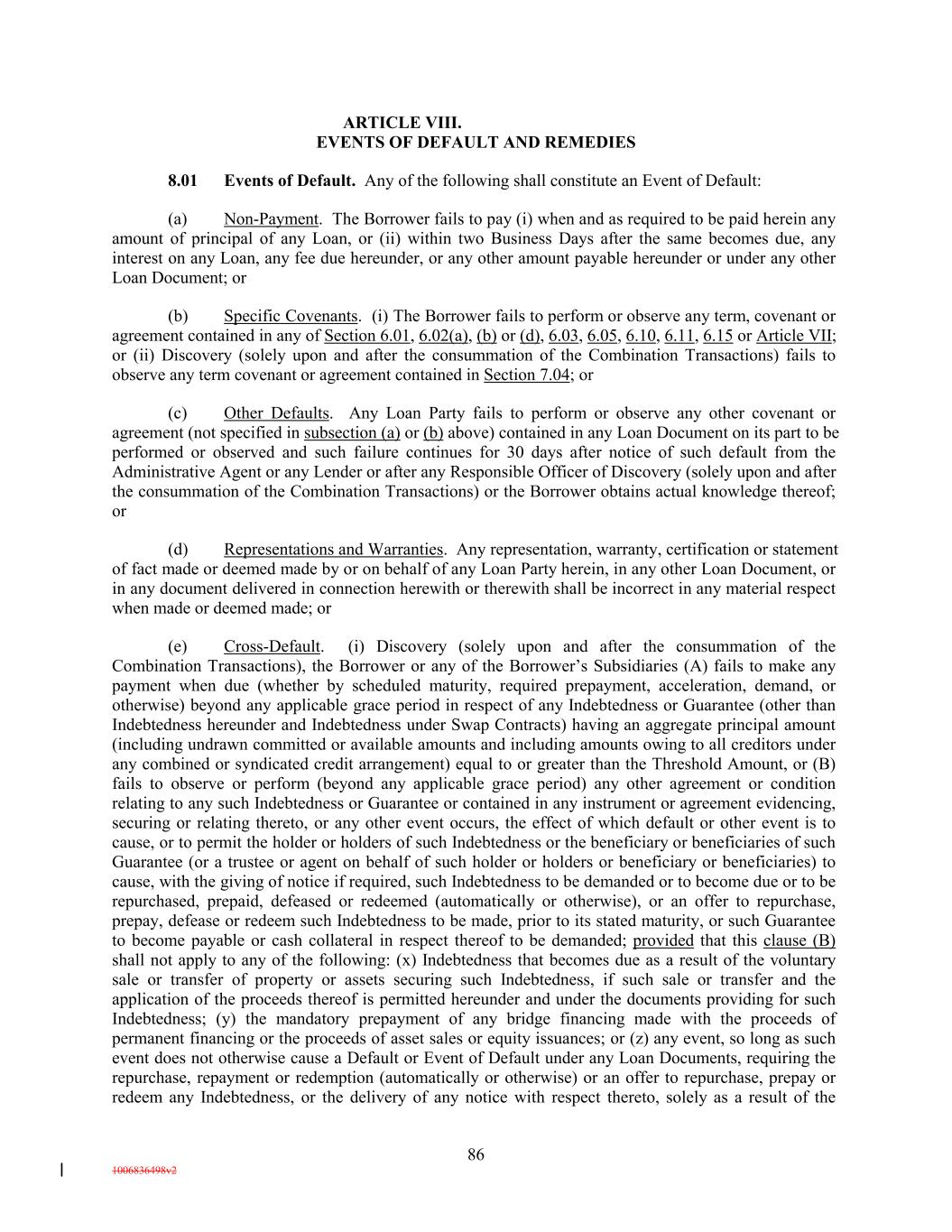 ARTICLE VIII. EVENTS OF DEFAULT AND REMEDIES 8.01 Events of Default. Any of the following shall constitute an Event of Default: (a) Non-Payment. The Borrower fails to pay (i) when and as required to be paid herein any amount of principal of any Loan, or (ii) within two Business Days after the same becomes due, any interest on any Loan, any fee due hereunder, or any other amount payable hereunder or under any other Loan Document; or (b) Specific Covenants. (i) The Borrower fails to perform or observe any term, covenant or agreement contained in any of Section 6.01, 6.02(a), (b) or (d), 6.03, 6.05, 6.10, 6.11, 6.15 or Article VII; or (ii) Discovery (solely upon and after the consummation of the Combination Transactions) fails to observe any term covenant or agreement contained in Section 7.04; or (c) Other Defaults. Any Loan Party fails to perform or observe any other covenant or agreement (not specified in subsection (a) or (b) above) contained in any Loan Document on its part to be performed or observed and such failure continues for 30 days after notice of such default from the Administrative Agent or any Lender or after any Responsible Officer of Discovery (solely upon and after the consummation of the Combination Transactions) or the Borrower obtains actual knowledge thereof; or (d) Representations and Warranties. Any representation, warranty, certification or statement of fact made or deemed made by or on behalf of any Loan Party herein, in any other Loan Document, or in any document delivered in connection herewith or therewith shall be incorrect in any material respect when made or deemed made; or (e) Cross-Default. (i) Discovery (solely upon and after the consummation of the Combination Transactions), the Borrower or any of the Borrower’s Subsidiaries (A) fails to make any payment when due (whether by scheduled maturity, required prepayment, acceleration, demand, or otherwise) beyond any applicable grace period in respect of any Indebtedness or Guarantee (other than Indebtedness hereunder and Indebtedness under Swap Contracts) having an aggregate principal amount (including undrawn committed or available amounts and including amounts owing to all creditors under any combined or syndicated credit arrangement) equal to or greater than the Threshold Amount, or (B) fails to observe or perform (beyond any applicable grace period) any other agreement or condition relating to any such Indebtedness or Guarantee or contained in any instrument or agreement evidencing, securing or relating thereto, or any other event occurs, the effect of which default or other event is to cause, or to permit the holder or holders of such Indebtedness or the beneficiary or beneficiaries of such Guarantee (or a trustee or agent on behalf of such holder or holders or beneficiary or beneficiaries) to cause, with the giving of notice if required, such Indebtedness to be demanded or to become due or to be repurchased, prepaid, defeased or redeemed (automatically or otherwise), or an offer to repurchase, prepay, defease or redeem such Indebtedness to be made, prior to its stated maturity, or such Guarantee to become payable or cash collateral in respect thereof to be demanded; provided that this clause (B) shall not apply to any of the following: (x) Indebtedness that becomes due as a result of the voluntary sale or transfer of property or assets securing such Indebtedness, if such sale or transfer and the application of the proceeds thereof is permitted hereunder and under the documents providing for such Indebtedness; (y) the mandatory prepayment of any bridge financing made with the proceeds of permanent financing or the proceeds of asset sales or equity issuances; or (z) any event, so long as such event does not otherwise cause a Default or Event of Default under any Loan Documents, requiring the repurchase, repayment or redemption (automatically or otherwise) or an offer to repurchase, prepay or redeem any Indebtedness, or the delivery of any notice with respect thereto, solely as a result of the 86 1006836498v2