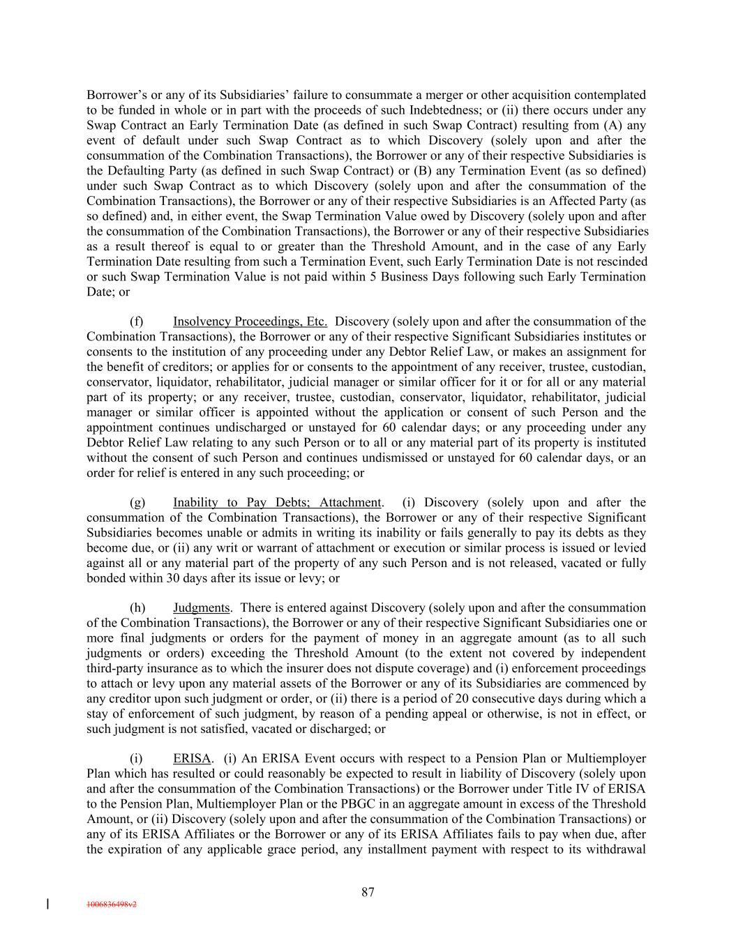 Borrower’s or any of its Subsidiaries’ failure to consummate a merger or other acquisition contemplated to be funded in whole or in part with the proceeds of such Indebtedness; or (ii) there occurs under any Swap Contract an Early Termination Date (as defined in such Swap Contract) resulting from (A) any event of default under such Swap Contract as to which Discovery (solely upon and after the consummation of the Combination Transactions), the Borrower or any of their respective Subsidiaries is the Defaulting Party (as defined in such Swap Contract) or (B) any Termination Event (as so defined) under such Swap Contract as to which Discovery (solely upon and after the consummation of the Combination Transactions), the Borrower or any of their respective Subsidiaries is an Affected Party (as so defined) and, in either event, the Swap Termination Value owed by Discovery (solely upon and after the consummation of the Combination Transactions), the Borrower or any of their respective Subsidiaries as a result thereof is equal to or greater than the Threshold Amount, and in the case of any Early Termination Date resulting from such a Termination Event, such Early Termination Date is not rescinded or such Swap Termination Value is not paid within 5 Business Days following such Early Termination Date; or (f) Insolvency Proceedings, Etc. Discovery (solely upon and after the consummation of the Combination Transactions), the Borrower or any of their respective Significant Subsidiaries institutes or consents to the institution of any proceeding under any Debtor Relief Law, or makes an assignment for the benefit of creditors; or applies for or consents to the appointment of any receiver, trustee, custodian, conservator, liquidator, rehabilitator, judicial manager or similar officer for it or for all or any material part of its property; or any receiver, trustee, custodian, conservator, liquidator, rehabilitator, judicial manager or similar officer is appointed without the application or consent of such Person and the appointment continues undischarged or unstayed for 60 calendar days; or any proceeding under any Debtor Relief Law relating to any such Person or to all or any material part of its property is instituted without the consent of such Person and continues undismissed or unstayed for 60 calendar days, or an order for relief is entered in any such proceeding; or (g) Inability to Pay Debts; Attachment. (i) Discovery (solely upon and after the consummation of the Combination Transactions), the Borrower or any of their respective Significant Subsidiaries becomes unable or admits in writing its inability or fails generally to pay its debts as they become due, or (ii) any writ or warrant of attachment or execution or similar process is issued or levied against all or any material part of the property of any such Person and is not released, vacated or fully bonded within 30 days after its issue or levy; or (h) Judgments. There is entered against Discovery (solely upon and after the consummation of the Combination Transactions), the Borrower or any of their respective Significant Subsidiaries one or more final judgments or orders for the payment of money in an aggregate amount (as to all such judgments or orders) exceeding the Threshold Amount (to the extent not covered by independent third-party insurance as to which the insurer does not dispute coverage) and (i) enforcement proceedings to attach or levy upon any material assets of the Borrower or any of its Subsidiaries are commenced by any creditor upon such judgment or order, or (ii) there is a period of 20 consecutive days during which a stay of enforcement of such judgment, by reason of a pending appeal or otherwise, is not in effect, or such judgment is not satisfied, vacated or discharged; or (i) ERISA. (i) An ERISA Event occurs with respect to a Pension Plan or Multiemployer Plan which has resulted or could reasonably be expected to result in liability of Discovery (solely upon and after the consummation of the Combination Transactions) or the Borrower under Title IV of ERISA to the Pension Plan, Multiemployer Plan or the PBGC in an aggregate amount in excess of the Threshold Amount, or (ii) Discovery (solely upon and after the consummation of the Combination Transactions) or any of its ERISA Affiliates or the Borrower or any of its ERISA Affiliates fails to pay when due, after the expiration of any applicable grace period, any installment payment with respect to its withdrawal 87 1006836498v2