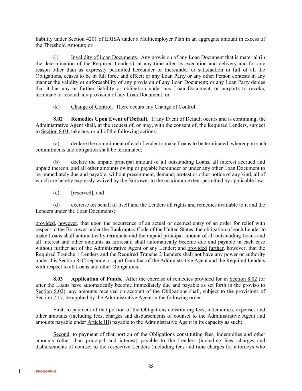 liability under Section 4201 of ERISA under a Multiemployer Plan in an aggregate amount in excess of the Threshold Amount; or (j) Invalidity of Loan Documents. Any provision of any Loan Document that is material (in the determination of the Required Lenders), at any time after its execution and delivery and for any reason other than as expressly permitted hereunder or thereunder or satisfaction in full of all the Obligations, ceases to be in full force and effect; or any Loan Party or any other Person contests in any manner the validity or enforceability of any provision of any Loan Document; or any Loan Party denies that it has any or further liability or obligation under any Loan Document, or purports to revoke, terminate or rescind any provision of any Loan Document; or (k) Change of Control. There occurs any Change of Control. 8.02 Remedies Upon Event of Default. If any Event of Default occurs and is continuing, the Administrative Agent shall, at the request of, or may, with the consent of, the Required Lenders, subject to Section 8.04, take any or all of the following actions: (a) declare the commitment of each Lender to make Loans to be terminated, whereupon such commitments and obligation shall be terminated; (b) declare the unpaid principal amount of all outstanding Loans, all interest accrued and unpaid thereon, and all other amounts owing or payable hereunder or under any other Loan Document to be immediately due and payable, without presentment, demand, protest or other notice of any kind, all of which are hereby expressly waived by the Borrower to the maximum extent permitted by applicable law; (c) [reserved]; and (d) exercise on behalf of itself and the Lenders all rights and remedies available to it and the Lenders under the Loan Documents; provided, however, that upon the occurrence of an actual or deemed entry of an order for relief with respect to the Borrower under the Bankruptcy Code of the United States, the obligation of each Lender to make Loans shall automatically terminate and the unpaid principal amount of all outstanding Loans and all interest and other amounts as aforesaid shall automatically become due and payable in each case without further act of the Administrative Agent or any Lender; and provided further, however, that the Required Tranche 1 Lenders and the Required Tranche 2 Lenders shall not have any power or authority under this Section 8.02 separate or apart from that of the Administrative Agent and the Required Lenders with respect to all Loans and other Obligations. 8.03 Application of Funds. After the exercise of remedies provided for in Section 8.02 (or after the Loans have automatically become immediately due and payable as set forth in the proviso to Section 8.02), any amounts received on account of the Obligations shall, subject to the provisions of Section 2.17, be applied by the Administrative Agent in the following order: First, to payment of that portion of the Obligations constituting fees, indemnities, expenses and other amounts (including fees, charges and disbursements of counsel to the Administrative Agent and amounts payable under Article III) payable to the Administrative Agent in its capacity as such; Second, to payment of that portion of the Obligations constituting fees, indemnities and other amounts (other than principal and interest) payable to the Lenders (including fees, charges and disbursements of counsel to the respective Lenders (including fees and time charges for attorneys who 88 1006836498v2