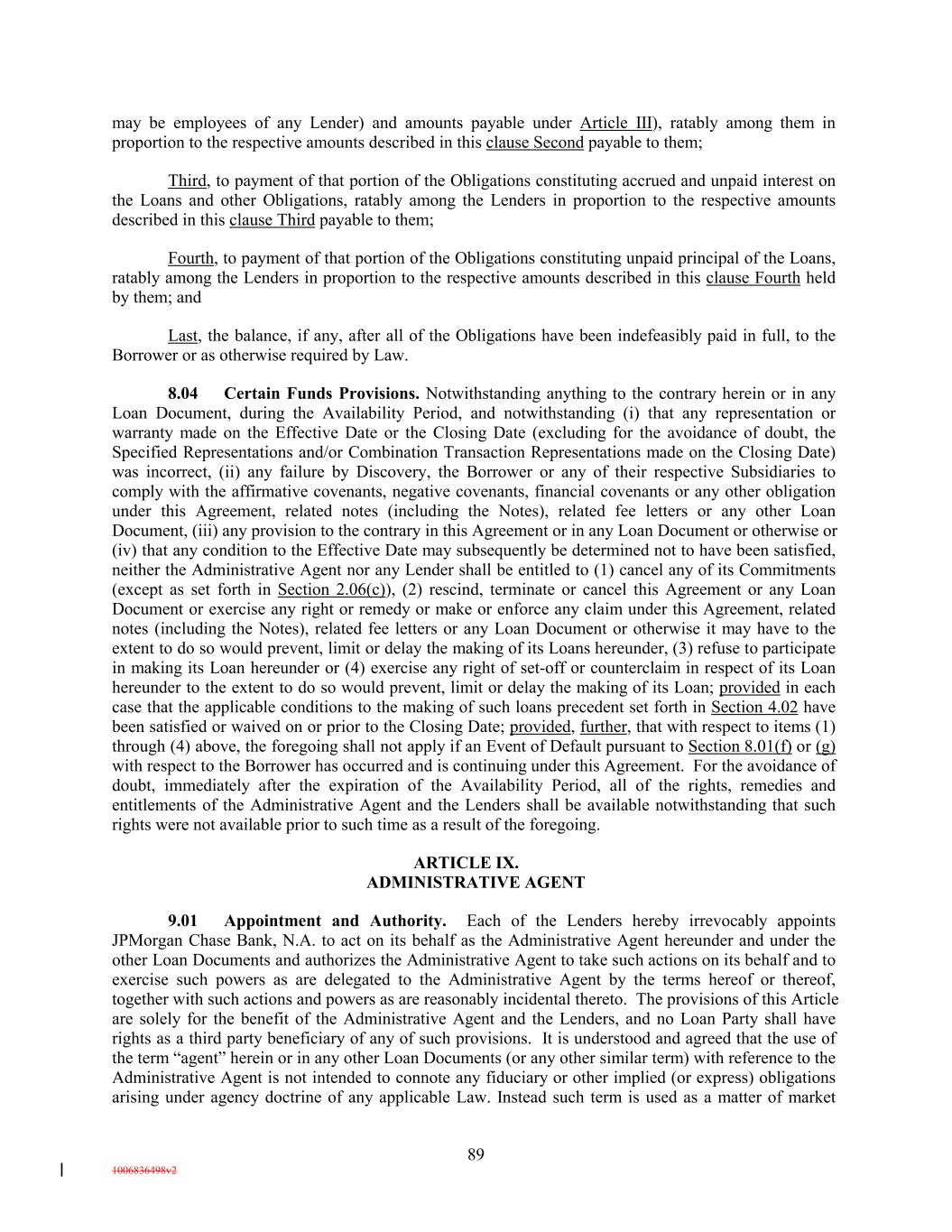 may be employees of any Lender) and amounts payable under Article III), ratably among them in proportion to the respective amounts described in this clause Second payable to them; Third, to payment of that portion of the Obligations constituting accrued and unpaid interest on the Loans and other Obligations, ratably among the Lenders in proportion to the respective amounts described in this clause Third payable to them; Fourth, to payment of that portion of the Obligations constituting unpaid principal of the Loans, ratably among the Lenders in proportion to the respective amounts described in this clause Fourth held by them; and Last, the balance, if any, after all of the Obligations have been indefeasibly paid in full, to the Borrower or as otherwise required by Law. 8.04 Certain Funds Provisions. Notwithstanding anything to the contrary herein or in any Loan Document, during the Availability Period, and notwithstanding (i) that any representation or warranty made on the Effective Date or the Closing Date (excluding for the avoidance of doubt, the Specified Representations and/or Combination Transaction Representations made on the Closing Date) was incorrect, (ii) any failure by Discovery, the Borrower or any of their respective Subsidiaries to comply with the affirmative covenants, negative covenants, financial covenants or any other obligation under this Agreement, related notes (including the Notes), related fee letters or any other Loan Document, (iii) any provision to the contrary in this Agreement or in any Loan Document or otherwise or (iv) that any condition to the Effective Date may subsequently be determined not to have been satisfied, neither the Administrative Agent nor any Lender shall be entitled to (1) cancel any of its Commitments (except as set forth in Section 2.06(c)), (2) rescind, terminate or cancel this Agreement or any Loan Document or exercise any right or remedy or make or enforce any claim under this Agreement, related notes (including the Notes), related fee letters or any Loan Document or otherwise it may have to the extent to do so would prevent, limit or delay the making of its Loans hereunder, (3) refuse to participate in making its Loan hereunder or (4) exercise any right of set-off or counterclaim in respect of its Loan hereunder to the extent to do so would prevent, limit or delay the making of its Loan; provided in each case that the applicable conditions to the making of such loans precedent set forth in Section 4.02 have been satisfied or waived on or prior to the Closing Date; provided, further, that with respect to items (1) through (4) above, the foregoing shall not apply if an Event of Default pursuant to Section 8.01(f) or (g) with respect to the Borrower has occurred and is continuing under this Agreement. For the avoidance of doubt, immediately after the expiration of the Availability Period, all of the rights, remedies and entitlements of the Administrative Agent and the Lenders shall be available notwithstanding that such rights were not available prior to such time as a result of the foregoing. ARTICLE IX. ADMINISTRATIVE AGENT 9.01 Appointment and Authority. Each of the Lenders hereby irrevocably appoints JPMorgan Chase Bank, N.A. to act on its behalf as the Administrative Agent hereunder and under the other Loan Documents and authorizes the Administrative Agent to take such actions on its behalf and to exercise such powers as are delegated to the Administrative Agent by the terms hereof or thereof, together with such actions and powers as are reasonably incidental thereto. The provisions of this Article are solely for the benefit of the Administrative Agent and the Lenders, and no Loan Party shall have rights as a third party beneficiary of any of such provisions. It is understood and agreed that the use of the term “agent” herein or in any other Loan Documents (or any other similar term) with reference to the Administrative Agent is not intended to connote any fiduciary or other implied (or express) obligations arising under agency doctrine of any applicable Law. Instead such term is used as a matter of market 89 1006836498v2