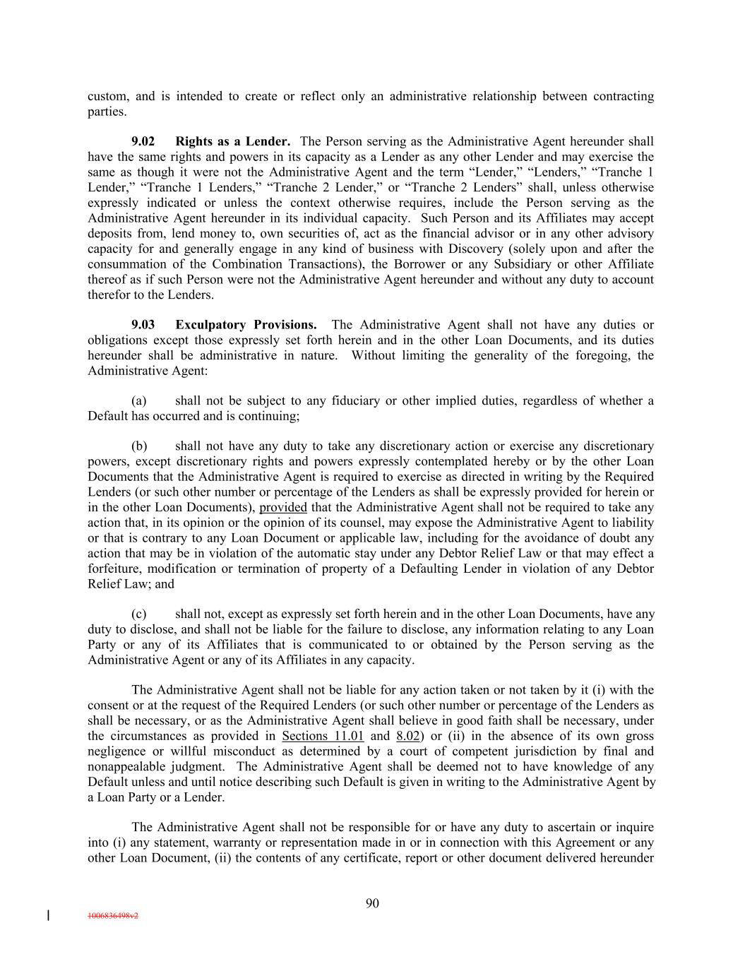 custom, and is intended to create or reflect only an administrative relationship between contracting parties. 9.02 Rights as a Lender. The Person serving as the Administrative Agent hereunder shall have the same rights and powers in its capacity as a Lender as any other Lender and may exercise the same as though it were not the Administrative Agent and the term “Lender,” “Lenders,” “Tranche 1 Lender,” “Tranche 1 Lenders,” “Tranche 2 Lender,” or “Tranche 2 Lenders” shall, unless otherwise expressly indicated or unless the context otherwise requires, include the Person serving as the Administrative Agent hereunder in its individual capacity. Such Person and its Affiliates may accept deposits from, lend money to, own securities of, act as the financial advisor or in any other advisory capacity for and generally engage in any kind of business with Discovery (solely upon and after the consummation of the Combination Transactions), the Borrower or any Subsidiary or other Affiliate thereof as if such Person were not the Administrative Agent hereunder and without any duty to account therefor to the Lenders. 9.03 Exculpatory Provisions. The Administrative Agent shall not have any duties or obligations except those expressly set forth herein and in the other Loan Documents, and its duties hereunder shall be administrative in nature. Without limiting the generality of the foregoing, the Administrative Agent: (a) shall not be subject to any fiduciary or other implied duties, regardless of whether a Default has occurred and is continuing; (b) shall not have any duty to take any discretionary action or exercise any discretionary powers, except discretionary rights and powers expressly contemplated hereby or by the other Loan Documents that the Administrative Agent is required to exercise as directed in writing by the Required Lenders (or such other number or percentage of the Lenders as shall be expressly provided for herein or in the other Loan Documents), provided that the Administrative Agent shall not be required to take any action that, in its opinion or the opinion of its counsel, may expose the Administrative Agent to liability or that is contrary to any Loan Document or applicable law, including for the avoidance of doubt any action that may be in violation of the automatic stay under any Debtor Relief Law or that may effect a forfeiture, modification or termination of property of a Defaulting Lender in violation of any Debtor Relief Law; and (c) shall not, except as expressly set forth herein and in the other Loan Documents, have any duty to disclose, and shall not be liable for the failure to disclose, any information relating to any Loan Party or any of its Affiliates that is communicated to or obtained by the Person serving as the Administrative Agent or any of its Affiliates in any capacity. The Administrative Agent shall not be liable for any action taken or not taken by it (i) with the consent or at the request of the Required Lenders (or such other number or percentage of the Lenders as shall be necessary, or as the Administrative Agent shall believe in good faith shall be necessary, under the circumstances as provided in Sections 11.01 and 8.02) or (ii) in the absence of its own gross negligence or willful misconduct as determined by a court of competent jurisdiction by final and nonappealable judgment. The Administrative Agent shall be deemed not to have knowledge of any Default unless and until notice describing such Default is given in writing to the Administrative Agent by a Loan Party or a Lender. The Administrative Agent shall not be responsible for or have any duty to ascertain or inquire into (i) any statement, warranty or representation made in or in connection with this Agreement or any other Loan Document, (ii) the contents of any certificate, report or other document delivered hereunder 90 1006836498v2