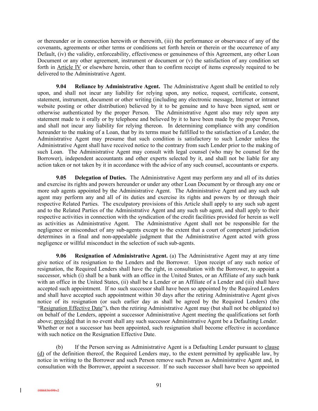 or thereunder or in connection herewith or therewith, (iii) the performance or observance of any of the covenants, agreements or other terms or conditions set forth herein or therein or the occurrence of any Default, (iv) the validity, enforceability, effectiveness or genuineness of this Agreement, any other Loan Document or any other agreement, instrument or document or (v) the satisfaction of any condition set forth in Article IV or elsewhere herein, other than to confirm receipt of items expressly required to be delivered to the Administrative Agent. 9.04 Reliance by Administrative Agent. The Administrative Agent shall be entitled to rely upon, and shall not incur any liability for relying upon, any notice, request, certificate, consent, statement, instrument, document or other writing (including any electronic message, Internet or intranet website posting or other distribution) believed by it to be genuine and to have been signed, sent or otherwise authenticated by the proper Person. The Administrative Agent also may rely upon any statement made to it orally or by telephone and believed by it to have been made by the proper Person, and shall not incur any liability for relying thereon. In determining compliance with any condition hereunder to the making of a Loan, that by its terms must be fulfilled to the satisfaction of a Lender, the Administrative Agent may presume that such condition is satisfactory to such Lender unless the Administrative Agent shall have received notice to the contrary from such Lender prior to the making of such Loan. The Administrative Agent may consult with legal counsel (who may be counsel for the Borrower), independent accountants and other experts selected by it, and shall not be liable for any action taken or not taken by it in accordance with the advice of any such counsel, accountants or experts. 9.05 Delegation of Duties. The Administrative Agent may perform any and all of its duties and exercise its rights and powers hereunder or under any other Loan Document by or through any one or more sub agents appointed by the Administrative Agent. The Administrative Agent and any such sub agent may perform any and all of its duties and exercise its rights and powers by or through their respective Related Parties. The exculpatory provisions of this Article shall apply to any such sub agent and to the Related Parties of the Administrative Agent and any such sub agent, and shall apply to their respective activities in connection with the syndication of the credit facilities provided for herein as well as activities as Administrative Agent. The Administrative Agent shall not be responsible for the negligence or misconduct of any sub-agents except to the extent that a court of competent jurisdiction determines in a final and non-appealable judgment that the Administrative Agent acted with gross negligence or willful misconduct in the selection of such sub-agents. 9.06 Resignation of Administrative Agent. (a) The Administrative Agent may at any time give notice of its resignation to the Lenders and the Borrower. Upon receipt of any such notice of resignation, the Required Lenders shall have the right, in consultation with the Borrower, to appoint a successor, which (i) shall be a bank with an office in the United States, or an Affiliate of any such bank with an office in the United States, (ii) shall be a Lender or an Affiliate of a Lender and (iii) shall have accepted such appointment. If no such successor shall have been so appointed by the Required Lenders and shall have accepted such appointment within 30 days after the retiring Administrative Agent gives notice of its resignation (or such earlier day as shall be agreed by the Required Lenders) (the “Resignation Effective Date”), then the retiring Administrative Agent may (but shall not be obligated to) on behalf of the Lenders, appoint a successor Administrative Agent meeting the qualifications set forth above; provided that in no event shall any such successor Administrative Agent be a Defaulting Lender. Whether or not a successor has been appointed, such resignation shall become effective in accordance with such notice on the Resignation Effective Date. (b) If the Person serving as Administrative Agent is a Defaulting Lender pursuant to clause (d) of the definition thereof, the Required Lenders may, to the extent permitted by applicable law, by notice in writing to the Borrower and such Person remove such Person as Administrative Agent and, in consultation with the Borrower, appoint a successor. If no such successor shall have been so appointed 91 1006836498v2