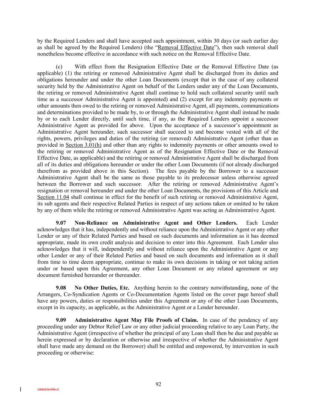 by the Required Lenders and shall have accepted such appointment, within 30 days (or such earlier day as shall be agreed by the Required Lenders) (the “Removal Effective Date”), then such removal shall nonetheless become effective in accordance with such notice on the Removal Effective Date. (c) With effect from the Resignation Effective Date or the Removal Effective Date (as applicable) (1) the retiring or removed Administrative Agent shall be discharged from its duties and obligations hereunder and under the other Loan Documents (except that in the case of any collateral security held by the Administrative Agent on behalf of the Lenders under any of the Loan Documents, the retiring or removed Administrative Agent shall continue to hold such collateral security until such time as a successor Administrative Agent is appointed) and (2) except for any indemnity payments or other amounts then owed to the retiring or removed Administrative Agent, all payments, communications and determinations provided to be made by, to or through the Administrative Agent shall instead be made by or to each Lender directly, until such time, if any, as the Required Lenders appoint a successor Administrative Agent as provided for above. Upon the acceptance of a successor’s appointment as Administrative Agent hereunder, such successor shall succeed to and become vested with all of the rights, powers, privileges and duties of the retiring (or removed) Administrative Agent (other than as provided in Section 3.01(h) and other than any rights to indemnity payments or other amounts owed to the retiring or removed Administrative Agent as of the Resignation Effective Date or the Removal Effective Date, as applicable) and the retiring or removed Administrative Agent shall be discharged from all of its duties and obligations hereunder or under the other Loan Documents (if not already discharged therefrom as provided above in this Section). The fees payable by the Borrower to a successor Administrative Agent shall be the same as those payable to its predecessor unless otherwise agreed between the Borrower and such successor. After the retiring or removed Administrative Agent’s resignation or removal hereunder and under the other Loan Documents, the provisions of this Article and Section 11.04 shall continue in effect for the benefit of such retiring or removed Administrative Agent, its sub agents and their respective Related Parties in respect of any actions taken or omitted to be taken by any of them while the retiring or removed Administrative Agent was acting as Administrative Agent. 9.07 Non-Reliance on Administrative Agent and Other Lenders. Each Lender acknowledges that it has, independently and without reliance upon the Administrative Agent or any other Lender or any of their Related Parties and based on such documents and information as it has deemed appropriate, made its own credit analysis and decision to enter into this Agreement. Each Lender also acknowledges that it will, independently and without reliance upon the Administrative Agent or any other Lender or any of their Related Parties and based on such documents and information as it shall from time to time deem appropriate, continue to make its own decisions in taking or not taking action under or based upon this Agreement, any other Loan Document or any related agreement or any document furnished hereunder or thereunder. 9.08 No Other Duties, Etc. Anything herein to the contrary notwithstanding, none of the Arrangers, Co-Syndication Agents or Co-Documentation Agents listed on the cover page hereof shall have any powers, duties or responsibilities under this Agreement or any of the other Loan Documents, except in its capacity, as applicable, as the Administrative Agent or a Lender hereunder. 9.09 Administrative Agent May File Proofs of Claim. In case of the pendency of any proceeding under any Debtor Relief Law or any other judicial proceeding relative to any Loan Party, the Administrative Agent (irrespective of whether the principal of any Loan shall then be due and payable as herein expressed or by declaration or otherwise and irrespective of whether the Administrative Agent shall have made any demand on the Borrower) shall be entitled and empowered, by intervention in such proceeding or otherwise: 92 1006836498v2