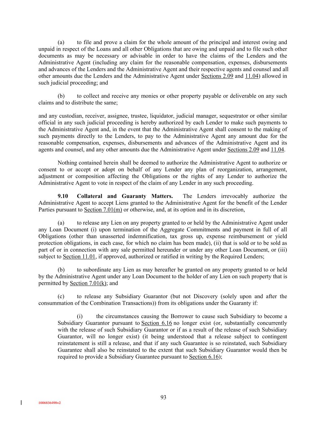 (a) to file and prove a claim for the whole amount of the principal and interest owing and unpaid in respect of the Loans and all other Obligations that are owing and unpaid and to file such other documents as may be necessary or advisable in order to have the claims of the Lenders and the Administrative Agent (including any claim for the reasonable compensation, expenses, disbursements and advances of the Lenders and the Administrative Agent and their respective agents and counsel and all other amounts due the Lenders and the Administrative Agent under Sections 2.09 and 11.04) allowed in such judicial proceeding; and (b) to collect and receive any monies or other property payable or deliverable on any such claims and to distribute the same; and any custodian, receiver, assignee, trustee, liquidator, judicial manager, sequestrator or other similar official in any such judicial proceeding is hereby authorized by each Lender to make such payments to the Administrative Agent and, in the event that the Administrative Agent shall consent to the making of such payments directly to the Lenders, to pay to the Administrative Agent any amount due for the reasonable compensation, expenses, disbursements and advances of the Administrative Agent and its agents and counsel, and any other amounts due the Administrative Agent under Sections 2.09 and 11.04. Nothing contained herein shall be deemed to authorize the Administrative Agent to authorize or consent to or accept or adopt on behalf of any Lender any plan of reorganization, arrangement, adjustment or composition affecting the Obligations or the rights of any Lender to authorize the Administrative Agent to vote in respect of the claim of any Lender in any such proceeding. 9.10 Collateral and Guaranty Matters. The Lenders irrevocably authorize the Administrative Agent to accept Liens granted to the Administrative Agent for the benefit of the Lender Parties pursuant to Section 7.01(m) or otherwise, and, at its option and in its discretion, (a) to release any Lien on any property granted to or held by the Administrative Agent under any Loan Document (i) upon termination of the Aggregate Commitments and payment in full of all Obligations (other than unasserted indemnification, tax gross up, expense reimbursement or yield protection obligations, in each case, for which no claim has been made), (ii) that is sold or to be sold as part of or in connection with any sale permitted hereunder or under any other Loan Document, or (iii) subject to Section 11.01, if approved, authorized or ratified in writing by the Required Lenders; (b) to subordinate any Lien as may hereafter be granted on any property granted to or held by the Administrative Agent under any Loan Document to the holder of any Lien on such property that is permitted by Section 7.01(k); and (c) to release any Subsidiary Guarantor (but not Discovery (solely upon and after the consummation of the Combination Transactions)) from its obligations under the Guaranty if: (i) the circumstances causing the Borrower to cause such Subsidiary to become a Subsidiary Guarantor pursuant to Section 6.16 no longer exist (or, substantially concurrently with the release of such Subsidiary Guarantor or if as a result of the release of such Subsidiary Guarantor, will no longer exist) (it being understood that a release subject to contingent reinstatement is still a release, and that if any such Guarantee is so reinstated, such Subsidiary Guarantee shall also be reinstated to the extent that such Subsidiary Guarantor would then be required to provide a Subsidiary Guarantee pursuant to Section 6.16); 93 1006836498v2
