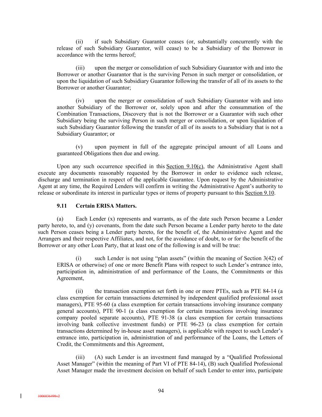 (ii) if such Subsidiary Guarantor ceases (or, substantially concurrently with the release of such Subsidiary Guarantor, will cease) to be a Subsidiary of the Borrower in accordance with the terms hereof; (iii) upon the merger or consolidation of such Subsidiary Guarantor with and into the Borrower or another Guarantor that is the surviving Person in such merger or consolidation, or upon the liquidation of such Subsidiary Guarantor following the transfer of all of its assets to the Borrower or another Guarantor; (iv) upon the merger or consolidation of such Subsidiary Guarantor with and into another Subsidiary of the Borrower or, solely upon and after the consummation of the Combination Transactions, Discovery that is not the Borrower or a Guarantor with such other Subsidiary being the surviving Person in such merger or consolidation, or upon liquidation of such Subsidiary Guarantor following the transfer of all of its assets to a Subsidiary that is not a Subsidiary Guarantor; or (v) upon payment in full of the aggregate principal amount of all Loans and guaranteed Obligations then due and owing. Upon any such occurrence specified in this Section 9.10(c), the Administrative Agent shall execute any documents reasonably requested by the Borrower in order to evidence such release, discharge and termination in respect of the applicable Guarantee. Upon request by the Administrative Agent at any time, the Required Lenders will confirm in writing the Administrative Agent’s authority to release or subordinate its interest in particular types or items of property pursuant to this Section 9.10. 9.11 Certain ERISA Matters. (a) Each Lender (x) represents and warrants, as of the date such Person became a Lender party hereto, to, and (y) covenants, from the date such Person became a Lender party hereto to the date such Person ceases being a Lender party hereto, for the benefit of, the Administrative Agent and the Arrangers and their respective Affiliates, and not, for the avoidance of doubt, to or for the benefit of the Borrower or any other Loan Party, that at least one of the following is and will be true: (i) such Lender is not using “plan assets” (within the meaning of Section 3(42) of ERISA or otherwise) of one or more Benefit Plans with respect to such Lender’s entrance into, participation in, administration of and performance of the Loans, the Commitments or this Agreement, (ii) the transaction exemption set forth in one or more PTEs, such as PTE 84-14 (a class exemption for certain transactions determined by independent qualified professional asset managers), PTE 95-60 (a class exemption for certain transactions involving insurance company general accounts), PTE 90-1 (a class exemption for certain transactions involving insurance company pooled separate accounts), PTE 91-38 (a class exemption for certain transactions involving bank collective investment funds) or PTE 96-23 (a class exemption for certain transactions determined by in-house asset managers), is applicable with respect to such Lender’s entrance into, participation in, administration of and performance of the Loans, the Letters of Credit, the Commitments and this Agreement, (iii) (A) such Lender is an investment fund managed by a “Qualified Professional Asset Manager” (within the meaning of Part VI of PTE 84-14), (B) such Qualified Professional Asset Manager made the investment decision on behalf of such Lender to enter into, participate 94 1006836498v2