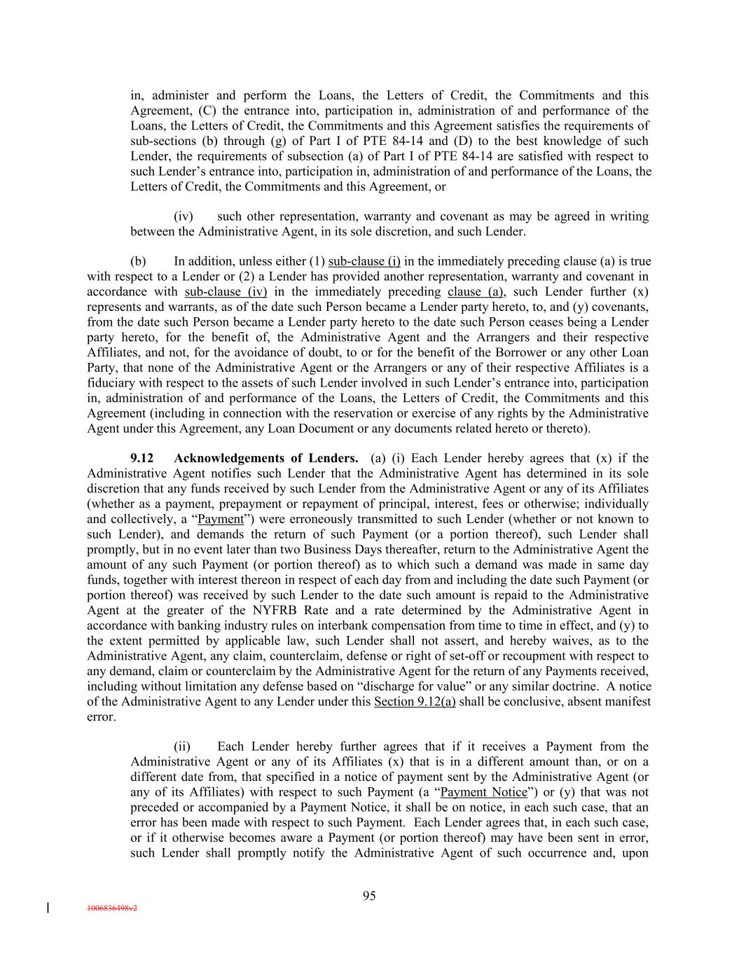 in, administer and perform the Loans, the Letters of Credit, the Commitments and this Agreement, (C) the entrance into, participation in, administration of and performance of the Loans, the Letters of Credit, the Commitments and this Agreement satisfies the requirements of sub-sections (b) through (g) of Part I of PTE 84-14 and (D) to the best knowledge of such Lender, the requirements of subsection (a) of Part I of PTE 84-14 are satisfied with respect to such Lender’s entrance into, participation in, administration of and performance of the Loans, the Letters of Credit, the Commitments and this Agreement, or (iv) such other representation, warranty and covenant as may be agreed in writing between the Administrative Agent, in its sole discretion, and such Lender. (b) In addition, unless either (1) sub-clause (i) in the immediately preceding clause (a) is true with respect to a Lender or (2) a Lender has provided another representation, warranty and covenant in accordance with sub-clause (iv) in the immediately preceding clause (a), such Lender further (x) represents and warrants, as of the date such Person became a Lender party hereto, to, and (y) covenants, from the date such Person became a Lender party hereto to the date such Person ceases being a Lender party hereto, for the benefit of, the Administrative Agent and the Arrangers and their respective Affiliates, and not, for the avoidance of doubt, to or for the benefit of the Borrower or any other Loan Party, that none of the Administrative Agent or the Arrangers or any of their respective Affiliates is a fiduciary with respect to the assets of such Lender involved in such Lender’s entrance into, participation in, administration of and performance of the Loans, the Letters of Credit, the Commitments and this Agreement (including in connection with the reservation or exercise of any rights by the Administrative Agent under this Agreement, any Loan Document or any documents related hereto or thereto). 9.12 Acknowledgements of Lenders. (a) (i) Each Lender hereby agrees that (x) if the Administrative Agent notifies such Lender that the Administrative Agent has determined in its sole discretion that any funds received by such Lender from the Administrative Agent or any of its Affiliates (whether as a payment, prepayment or repayment of principal, interest, fees or otherwise; individually and collectively, a “Payment”) were erroneously transmitted to such Lender (whether or not known to such Lender), and demands the return of such Payment (or a portion thereof), such Lender shall promptly, but in no event later than two Business Days thereafter, return to the Administrative Agent the amount of any such Payment (or portion thereof) as to which such a demand was made in same day funds, together with interest thereon in respect of each day from and including the date such Payment (or portion thereof) was received by such Lender to the date such amount is repaid to the Administrative Agent at the greater of the NYFRB Rate and a rate determined by the Administrative Agent in accordance with banking industry rules on interbank compensation from time to time in effect, and (y) to the extent permitted by applicable law, such Lender shall not assert, and hereby waives, as to the Administrative Agent, any claim, counterclaim, defense or right of set-off or recoupment with respect to any demand, claim or counterclaim by the Administrative Agent for the return of any Payments received, including without limitation any defense based on “discharge for value” or any similar doctrine. A notice of the Administrative Agent to any Lender under this Section 9.12(a) shall be conclusive, absent manifest error. (ii) Each Lender hereby further agrees that if it receives a Payment from the Administrative Agent or any of its Affiliates (x) that is in a different amount than, or on a different date from, that specified in a notice of payment sent by the Administrative Agent (or any of its Affiliates) with respect to such Payment (a “Payment Notice”) or (y) that was not preceded or accompanied by a Payment Notice, it shall be on notice, in each such case, that an error has been made with respect to such Payment. Each Lender agrees that, in each such case, or if it otherwise becomes aware a Payment (or portion thereof) may have been sent in error, such Lender shall promptly notify the Administrative Agent of such occurrence and, upon 95 1006836498v2