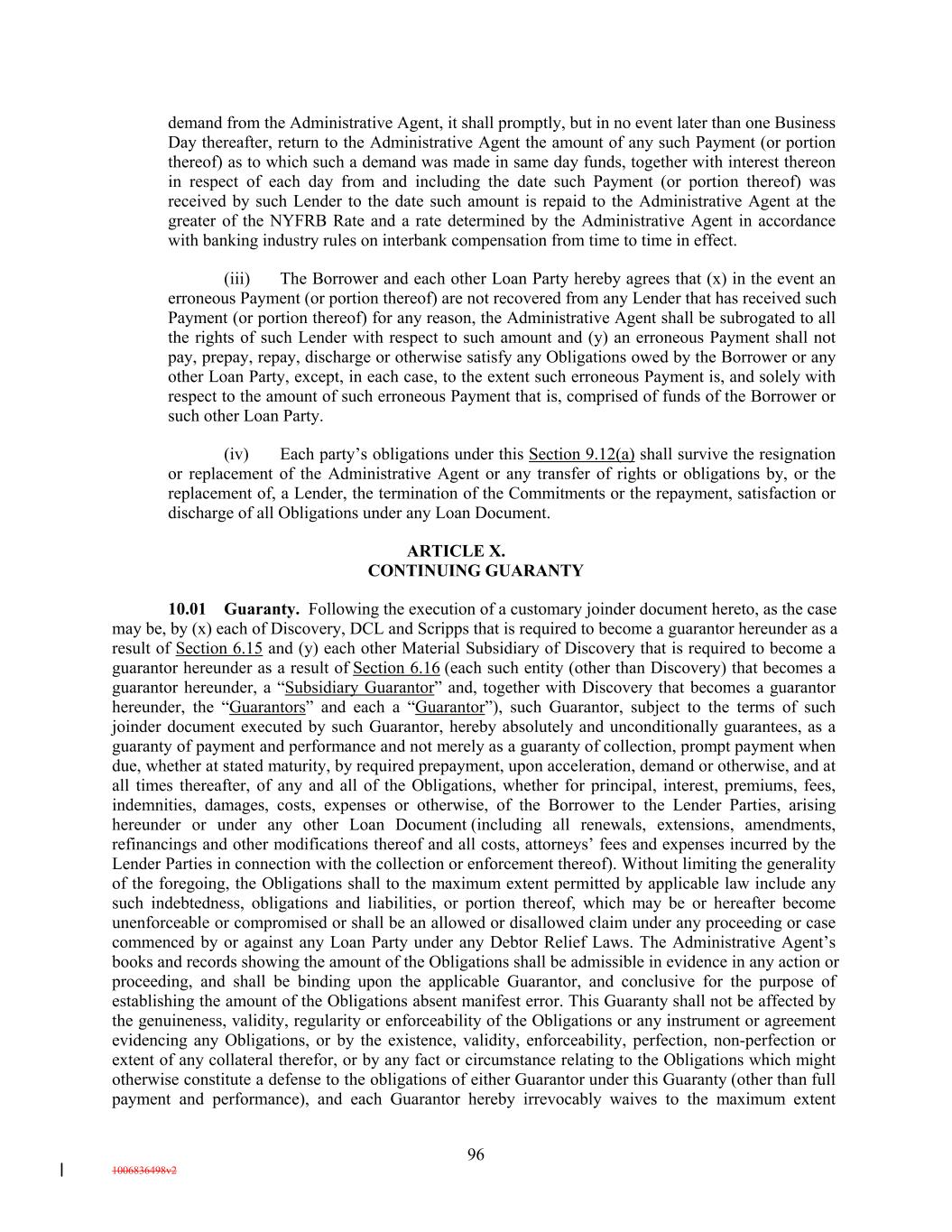 demand from the Administrative Agent, it shall promptly, but in no event later than one Business Day thereafter, return to the Administrative Agent the amount of any such Payment (or portion thereof) as to which such a demand was made in same day funds, together with interest thereon in respect of each day from and including the date such Payment (or portion thereof) was received by such Lender to the date such amount is repaid to the Administrative Agent at the greater of the NYFRB Rate and a rate determined by the Administrative Agent in accordance with banking industry rules on interbank compensation from time to time in effect. (iii) The Borrower and each other Loan Party hereby agrees that (x) in the event an erroneous Payment (or portion thereof) are not recovered from any Lender that has received such Payment (or portion thereof) for any reason, the Administrative Agent shall be subrogated to all the rights of such Lender with respect to such amount and (y) an erroneous Payment shall not pay, prepay, repay, discharge or otherwise satisfy any Obligations owed by the Borrower or any other Loan Party, except, in each case, to the extent such erroneous Payment is, and solely with respect to the amount of such erroneous Payment that is, comprised of funds of the Borrower or such other Loan Party. (iv) Each party’s obligations under this Section 9.12(a) shall survive the resignation or replacement of the Administrative Agent or any transfer of rights or obligations by, or the replacement of, a Lender, the termination of the Commitments or the repayment, satisfaction or discharge of all Obligations under any Loan Document. ARTICLE X. CONTINUING GUARANTY 10.01 Guaranty. Following the execution of a customary joinder document hereto, as the case may be, by (x) each of Discovery, DCL and Scripps that is required to become a guarantor hereunder as a result of Section 6.15 and (y) each other Material Subsidiary of Discovery that is required to become a guarantor hereunder as a result of Section 6.16 (each such entity (other than Discovery) that becomes a guarantor hereunder, a “Subsidiary Guarantor” and, together with Discovery that becomes a guarantor hereunder, the “Guarantors” and each a “Guarantor”), such Guarantor, subject to the terms of such joinder document executed by such Guarantor, hereby absolutely and unconditionally guarantees, as a guaranty of payment and performance and not merely as a guaranty of collection, prompt payment when due, whether at stated maturity, by required prepayment, upon acceleration, demand or otherwise, and at all times thereafter, of any and all of the Obligations, whether for principal, interest, premiums, fees, indemnities, damages, costs, expenses or otherwise, of the Borrower to the Lender Parties, arising hereunder or under any other Loan Document (including all renewals, extensions, amendments, refinancings and other modifications thereof and all costs, attorneys’ fees and expenses incurred by the Lender Parties in connection with the collection or enforcement thereof). Without limiting the generality of the foregoing, the Obligations shall to the maximum extent permitted by applicable law include any such indebtedness, obligations and liabilities, or portion thereof, which may be or hereafter become unenforceable or compromised or shall be an allowed or disallowed claim under any proceeding or case commenced by or against any Loan Party under any Debtor Relief Laws. The Administrative Agent’s books and records showing the amount of the Obligations shall be admissible in evidence in any action or proceeding, and shall be binding upon the applicable Guarantor, and conclusive for the purpose of establishing the amount of the Obligations absent manifest error. This Guaranty shall not be affected by the genuineness, validity, regularity or enforceability of the Obligations or any instrument or agreement evidencing any Obligations, or by the existence, validity, enforceability, perfection, non-perfection or extent of any collateral therefor, or by any fact or circumstance relating to the Obligations which might otherwise constitute a defense to the obligations of either Guarantor under this Guaranty (other than full payment and performance), and each Guarantor hereby irrevocably waives to the maximum extent 96 1006836498v2