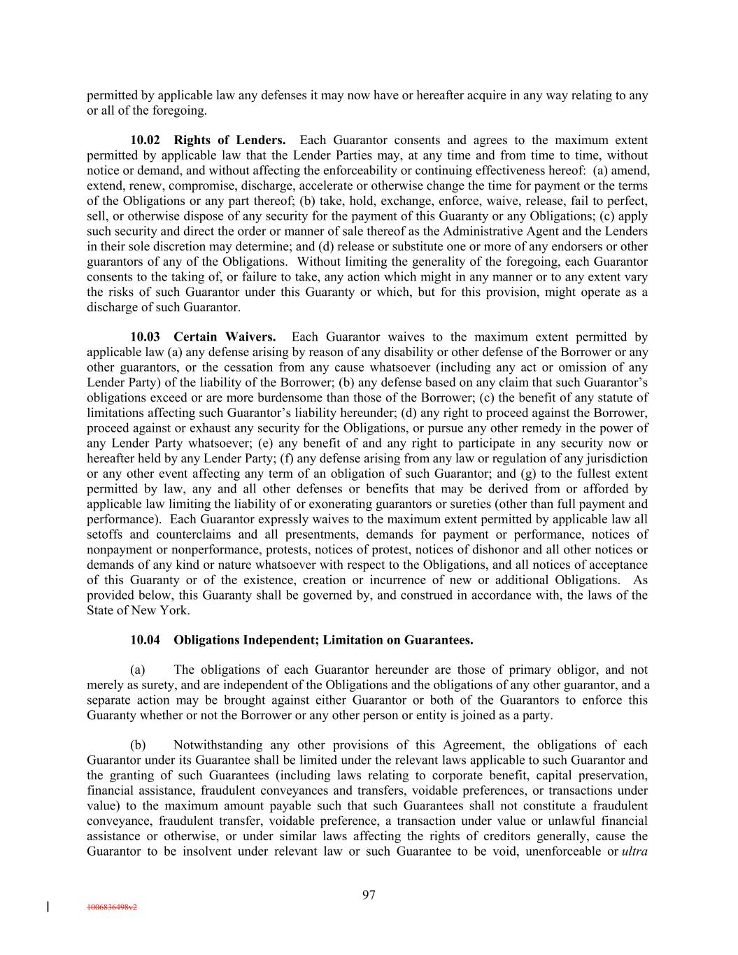 permitted by applicable law any defenses it may now have or hereafter acquire in any way relating to any or all of the foregoing. 10.02 Rights of Lenders. Each Guarantor consents and agrees to the maximum extent permitted by applicable law that the Lender Parties may, at any time and from time to time, without notice or demand, and without affecting the enforceability or continuing effectiveness hereof: (a) amend, extend, renew, compromise, discharge, accelerate or otherwise change the time for payment or the terms of the Obligations or any part thereof; (b) take, hold, exchange, enforce, waive, release, fail to perfect, sell, or otherwise dispose of any security for the payment of this Guaranty or any Obligations; (c) apply such security and direct the order or manner of sale thereof as the Administrative Agent and the Lenders in their sole discretion may determine; and (d) release or substitute one or more of any endorsers or other guarantors of any of the Obligations. Without limiting the generality of the foregoing, each Guarantor consents to the taking of, or failure to take, any action which might in any manner or to any extent vary the risks of such Guarantor under this Guaranty or which, but for this provision, might operate as a discharge of such Guarantor. 10.03 Certain Waivers. Each Guarantor waives to the maximum extent permitted by applicable law (a) any defense arising by reason of any disability or other defense of the Borrower or any other guarantors, or the cessation from any cause whatsoever (including any act or omission of any Lender Party) of the liability of the Borrower; (b) any defense based on any claim that such Guarantor’s obligations exceed or are more burdensome than those of the Borrower; (c) the benefit of any statute of limitations affecting such Guarantor’s liability hereunder; (d) any right to proceed against the Borrower, proceed against or exhaust any security for the Obligations, or pursue any other remedy in the power of any Lender Party whatsoever; (e) any benefit of and any right to participate in any security now or hereafter held by any Lender Party; (f) any defense arising from any law or regulation of any jurisdiction or any other event affecting any term of an obligation of such Guarantor; and (g) to the fullest extent permitted by law, any and all other defenses or benefits that may be derived from or afforded by applicable law limiting the liability of or exonerating guarantors or sureties (other than full payment and performance). Each Guarantor expressly waives to the maximum extent permitted by applicable law all setoffs and counterclaims and all presentments, demands for payment or performance, notices of nonpayment or nonperformance, protests, notices of protest, notices of dishonor and all other notices or demands of any kind or nature whatsoever with respect to the Obligations, and all notices of acceptance of this Guaranty or of the existence, creation or incurrence of new or additional Obligations. As provided below, this Guaranty shall be governed by, and construed in accordance with, the laws of the State of New York. 10.04 Obligations Independent; Limitation on Guarantees. (a) The obligations of each Guarantor hereunder are those of primary obligor, and not merely as surety, and are independent of the Obligations and the obligations of any other guarantor, and a separate action may be brought against either Guarantor or both of the Guarantors to enforce this Guaranty whether or not the Borrower or any other person or entity is joined as a party. (b) Notwithstanding any other provisions of this Agreement, the obligations of each Guarantor under its Guarantee shall be limited under the relevant laws applicable to such Guarantor and the granting of such Guarantees (including laws relating to corporate benefit, capital preservation, financial assistance, fraudulent conveyances and transfers, voidable preferences, or transactions under value) to the maximum amount payable such that such Guarantees shall not constitute a fraudulent conveyance, fraudulent transfer, voidable preference, a transaction under value or unlawful financial assistance or otherwise, or under similar laws affecting the rights of creditors generally, cause the Guarantor to be insolvent under relevant law or such Guarantee to be void, unenforceable or ultra 97 1006836498v2