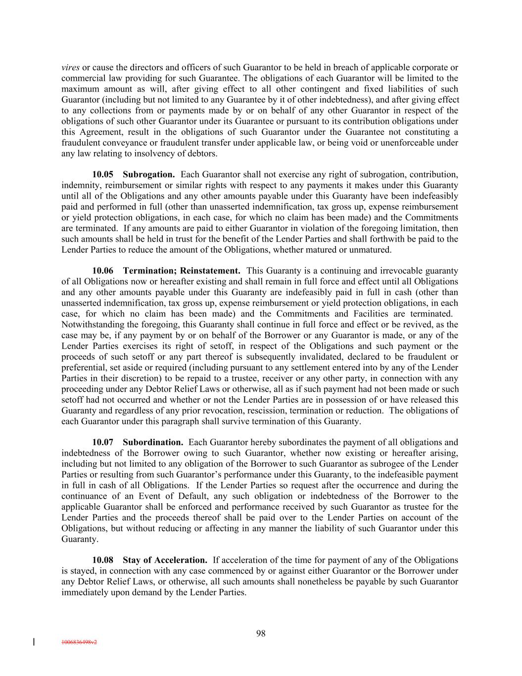 vires or cause the directors and officers of such Guarantor to be held in breach of applicable corporate or commercial law providing for such Guarantee. The obligations of each Guarantor will be limited to the maximum amount as will, after giving effect to all other contingent and fixed liabilities of such Guarantor (including but not limited to any Guarantee by it of other indebtedness), and after giving effect to any collections from or payments made by or on behalf of any other Guarantor in respect of the obligations of such other Guarantor under its Guarantee or pursuant to its contribution obligations under this Agreement, result in the obligations of such Guarantor under the Guarantee not constituting a fraudulent conveyance or fraudulent transfer under applicable law, or being void or unenforceable under any law relating to insolvency of debtors. 10.05 Subrogation. Each Guarantor shall not exercise any right of subrogation, contribution, indemnity, reimbursement or similar rights with respect to any payments it makes under this Guaranty until all of the Obligations and any other amounts payable under this Guaranty have been indefeasibly paid and performed in full (other than unasserted indemnification, tax gross up, expense reimbursement or yield protection obligations, in each case, for which no claim has been made) and the Commitments are terminated. If any amounts are paid to either Guarantor in violation of the foregoing limitation, then such amounts shall be held in trust for the benefit of the Lender Parties and shall forthwith be paid to the Lender Parties to reduce the amount of the Obligations, whether matured or unmatured. 10.06 Termination; Reinstatement. This Guaranty is a continuing and irrevocable guaranty of all Obligations now or hereafter existing and shall remain in full force and effect until all Obligations and any other amounts payable under this Guaranty are indefeasibly paid in full in cash (other than unasserted indemnification, tax gross up, expense reimbursement or yield protection obligations, in each case, for which no claim has been made) and the Commitments and Facilities are terminated. Notwithstanding the foregoing, this Guaranty shall continue in full force and effect or be revived, as the case may be, if any payment by or on behalf of the Borrower or any Guarantor is made, or any of the Lender Parties exercises its right of setoff, in respect of the Obligations and such payment or the proceeds of such setoff or any part thereof is subsequently invalidated, declared to be fraudulent or preferential, set aside or required (including pursuant to any settlement entered into by any of the Lender Parties in their discretion) to be repaid to a trustee, receiver or any other party, in connection with any proceeding under any Debtor Relief Laws or otherwise, all as if such payment had not been made or such setoff had not occurred and whether or not the Lender Parties are in possession of or have released this Guaranty and regardless of any prior revocation, rescission, termination or reduction. The obligations of each Guarantor under this paragraph shall survive termination of this Guaranty. 10.07 Subordination. Each Guarantor hereby subordinates the payment of all obligations and indebtedness of the Borrower owing to such Guarantor, whether now existing or hereafter arising, including but not limited to any obligation of the Borrower to such Guarantor as subrogee of the Lender Parties or resulting from such Guarantor’s performance under this Guaranty, to the indefeasible payment in full in cash of all Obligations. If the Lender Parties so request after the occurrence and during the continuance of an Event of Default, any such obligation or indebtedness of the Borrower to the applicable Guarantor shall be enforced and performance received by such Guarantor as trustee for the Lender Parties and the proceeds thereof shall be paid over to the Lender Parties on account of the Obligations, but without reducing or affecting in any manner the liability of such Guarantor under this Guaranty. 10.08 Stay of Acceleration. If acceleration of the time for payment of any of the Obligations is stayed, in connection with any case commenced by or against either Guarantor or the Borrower under any Debtor Relief Laws, or otherwise, all such amounts shall nonetheless be payable by such Guarantor immediately upon demand by the Lender Parties. 98 1006836498v2