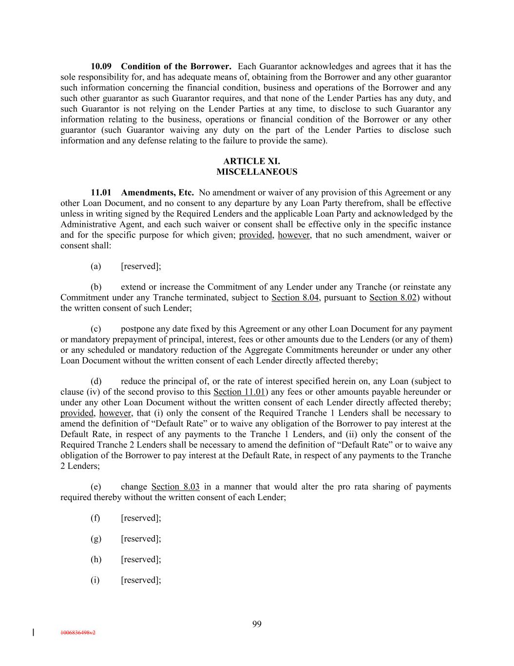 10.09 Condition of the Borrower. Each Guarantor acknowledges and agrees that it has the sole responsibility for, and has adequate means of, obtaining from the Borrower and any other guarantor such information concerning the financial condition, business and operations of the Borrower and any such other guarantor as such Guarantor requires, and that none of the Lender Parties has any duty, and such Guarantor is not relying on the Lender Parties at any time, to disclose to such Guarantor any information relating to the business, operations or financial condition of the Borrower or any other guarantor (such Guarantor waiving any duty on the part of the Lender Parties to disclose such information and any defense relating to the failure to provide the same). ARTICLE XI. MISCELLANEOUS 11.01 Amendments, Etc. No amendment or waiver of any provision of this Agreement or any other Loan Document, and no consent to any departure by any Loan Party therefrom, shall be effective unless in writing signed by the Required Lenders and the applicable Loan Party and acknowledged by the Administrative Agent, and each such waiver or consent shall be effective only in the specific instance and for the specific purpose for which given; provided, however, that no such amendment, waiver or consent shall: (a) [reserved]; (b) extend or increase the Commitment of any Lender under any Tranche (or reinstate any Commitment under any Tranche terminated, subject to Section 8.04, pursuant to Section 8.02) without the written consent of such Lender; (c) postpone any date fixed by this Agreement or any other Loan Document for any payment or mandatory prepayment of principal, interest, fees or other amounts due to the Lenders (or any of them) or any scheduled or mandatory reduction of the Aggregate Commitments hereunder or under any other Loan Document without the written consent of each Lender directly affected thereby; (d) reduce the principal of, or the rate of interest specified herein on, any Loan (subject to clause (iv) of the second proviso to this Section 11.01) any fees or other amounts payable hereunder or under any other Loan Document without the written consent of each Lender directly affected thereby; provided, however, that (i) only the consent of the Required Tranche 1 Lenders shall be necessary to amend the definition of “Default Rate” or to waive any obligation of the Borrower to pay interest at the Default Rate, in respect of any payments to the Tranche 1 Lenders, and (ii) only the consent of the Required Tranche 2 Lenders shall be necessary to amend the definition of “Default Rate” or to waive any obligation of the Borrower to pay interest at the Default Rate, in respect of any payments to the Tranche 2 Lenders; (e) change Section 8.03 in a manner that would alter the pro rata sharing of payments required thereby without the written consent of each Lender; (f) [reserved]; (g) [reserved]; (h) [reserved]; (i) [reserved]; 99 1006836498v2
