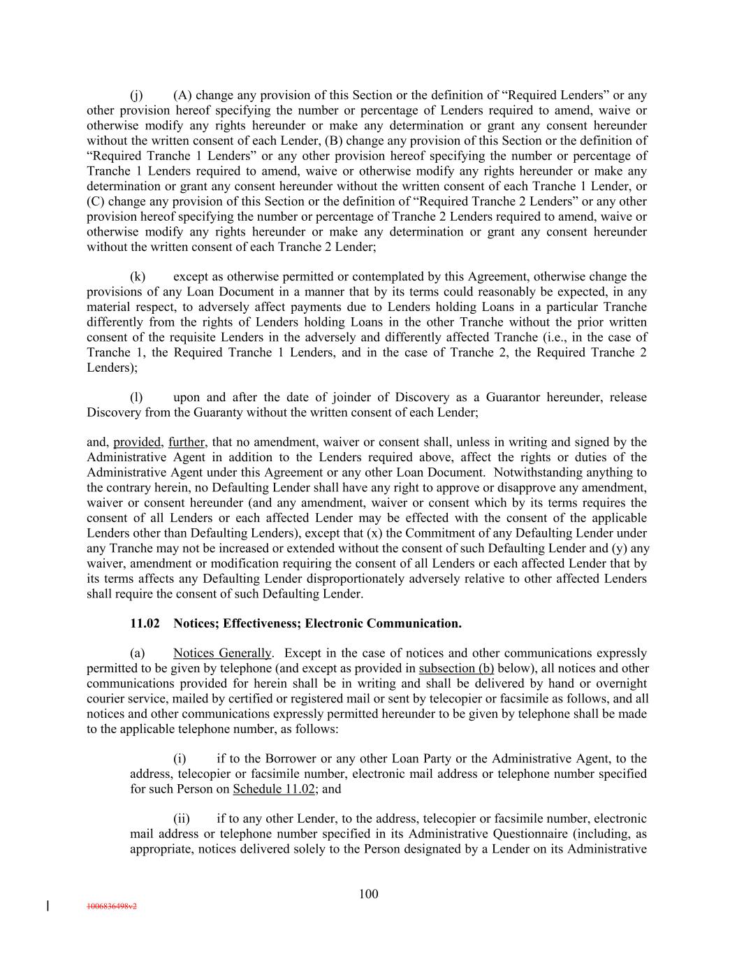 (j) (A) change any provision of this Section or the definition of “Required Lenders” or any other provision hereof specifying the number or percentage of Lenders required to amend, waive or otherwise modify any rights hereunder or make any determination or grant any consent hereunder without the written consent of each Lender, (B) change any provision of this Section or the definition of “Required Tranche 1 Lenders” or any other provision hereof specifying the number or percentage of Tranche 1 Lenders required to amend, waive or otherwise modify any rights hereunder or make any determination or grant any consent hereunder without the written consent of each Tranche 1 Lender, or (C) change any provision of this Section or the definition of “Required Tranche 2 Lenders” or any other provision hereof specifying the number or percentage of Tranche 2 Lenders required to amend, waive or otherwise modify any rights hereunder or make any determination or grant any consent hereunder without the written consent of each Tranche 2 Lender; (k) except as otherwise permitted or contemplated by this Agreement, otherwise change the provisions of any Loan Document in a manner that by its terms could reasonably be expected, in any material respect, to adversely affect payments due to Lenders holding Loans in a particular Tranche differently from the rights of Lenders holding Loans in the other Tranche without the prior written consent of the requisite Lenders in the adversely and differently affected Tranche (i.e., in the case of Tranche 1, the Required Tranche 1 Lenders, and in the case of Tranche 2, the Required Tranche 2 Lenders); (l) upon and after the date of joinder of Discovery as a Guarantor hereunder, release Discovery from the Guaranty without the written consent of each Lender; and, provided, further, that no amendment, waiver or consent shall, unless in writing and signed by the Administrative Agent in addition to the Lenders required above, affect the rights or duties of the Administrative Agent under this Agreement or any other Loan Document. Notwithstanding anything to the contrary herein, no Defaulting Lender shall have any right to approve or disapprove any amendment, waiver or consent hereunder (and any amendment, waiver or consent which by its terms requires the consent of all Lenders or each affected Lender may be effected with the consent of the applicable Lenders other than Defaulting Lenders), except that (x) the Commitment of any Defaulting Lender under any Tranche may not be increased or extended without the consent of such Defaulting Lender and (y) any waiver, amendment or modification requiring the consent of all Lenders or each affected Lender that by its terms affects any Defaulting Lender disproportionately adversely relative to other affected Lenders shall require the consent of such Defaulting Lender. 11.02 Notices; Effectiveness; Electronic Communication. (a) Notices Generally. Except in the case of notices and other communications expressly permitted to be given by telephone (and except as provided in subsection (b) below), all notices and other communications provided for herein shall be in writing and shall be delivered by hand or overnight courier service, mailed by certified or registered mail or sent by telecopier or facsimile as follows, and all notices and other communications expressly permitted hereunder to be given by telephone shall be made to the applicable telephone number, as follows: (i) if to the Borrower or any other Loan Party or the Administrative Agent, to the address, telecopier or facsimile number, electronic mail address or telephone number specified for such Person on Schedule 11.02; and (ii) if to any other Lender, to the address, telecopier or facsimile number, electronic mail address or telephone number specified in its Administrative Questionnaire (including, as appropriate, notices delivered solely to the Person designated by a Lender on its Administrative 100 1006836498v2