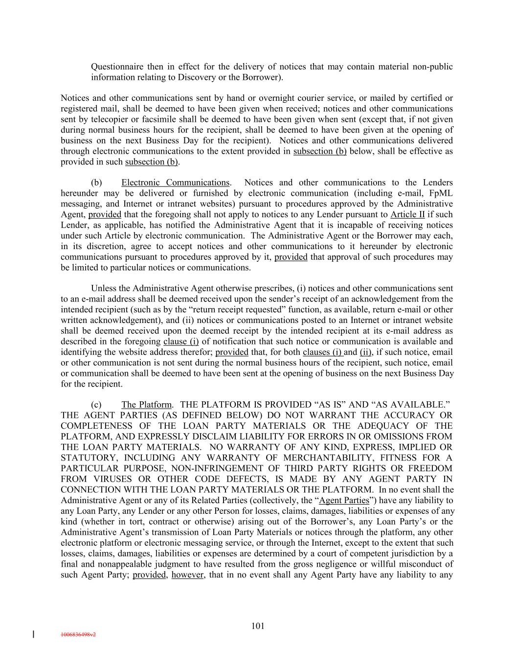 Questionnaire then in effect for the delivery of notices that may contain material non-public information relating to Discovery or the Borrower). Notices and other communications sent by hand or overnight courier service, or mailed by certified or registered mail, shall be deemed to have been given when received; notices and other communications sent by telecopier or facsimile shall be deemed to have been given when sent (except that, if not given during normal business hours for the recipient, shall be deemed to have been given at the opening of business on the next Business Day for the recipient). Notices and other communications delivered through electronic communications to the extent provided in subsection (b) below, shall be effective as provided in such subsection (b). (b) Electronic Communications. Notices and other communications to the Lenders hereunder may be delivered or furnished by electronic communication (including e-mail, FpML messaging, and Internet or intranet websites) pursuant to procedures approved by the Administrative Agent, provided that the foregoing shall not apply to notices to any Lender pursuant to Article II if such Lender, as applicable, has notified the Administrative Agent that it is incapable of receiving notices under such Article by electronic communication. The Administrative Agent or the Borrower may each, in its discretion, agree to accept notices and other communications to it hereunder by electronic communications pursuant to procedures approved by it, provided that approval of such procedures may be limited to particular notices or communications. Unless the Administrative Agent otherwise prescribes, (i) notices and other communications sent to an e-mail address shall be deemed received upon the sender’s receipt of an acknowledgement from the intended recipient (such as by the “return receipt requested” function, as available, return e-mail or other written acknowledgement), and (ii) notices or communications posted to an Internet or intranet website shall be deemed received upon the deemed receipt by the intended recipient at its e-mail address as described in the foregoing clause (i) of notification that such notice or communication is available and identifying the website address therefor; provided that, for both clauses (i) and (ii), if such notice, email or other communication is not sent during the normal business hours of the recipient, such notice, email or communication shall be deemed to have been sent at the opening of business on the next Business Day for the recipient. (c) The Platform. THE PLATFORM IS PROVIDED “AS IS” AND “AS AVAILABLE.” THE AGENT PARTIES (AS DEFINED BELOW) DO NOT WARRANT THE ACCURACY OR COMPLETENESS OF THE LOAN PARTY MATERIALS OR THE ADEQUACY OF THE PLATFORM, AND EXPRESSLY DISCLAIM LIABILITY FOR ERRORS IN OR OMISSIONS FROM THE LOAN PARTY MATERIALS. NO WARRANTY OF ANY KIND, EXPRESS, IMPLIED OR STATUTORY, INCLUDING ANY WARRANTY OF MERCHANTABILITY, FITNESS FOR A PARTICULAR PURPOSE, NON-INFRINGEMENT OF THIRD PARTY RIGHTS OR FREEDOM FROM VIRUSES OR OTHER CODE DEFECTS, IS MADE BY ANY AGENT PARTY IN CONNECTION WITH THE LOAN PARTY MATERIALS OR THE PLATFORM. In no event shall the Administrative Agent or any of its Related Parties (collectively, the “Agent Parties”) have any liability to any Loan Party, any Lender or any other Person for losses, claims, damages, liabilities or expenses of any kind (whether in tort, contract or otherwise) arising out of the Borrower’s, any Loan Party’s or the Administrative Agent’s transmission of Loan Party Materials or notices through the platform, any other electronic platform or electronic messaging service, or through the Internet, except to the extent that such losses, claims, damages, liabilities or expenses are determined by a court of competent jurisdiction by a final and nonappealable judgment to have resulted from the gross negligence or willful misconduct of such Agent Party; provided, however, that in no event shall any Agent Party have any liability to any 101 1006836498v2