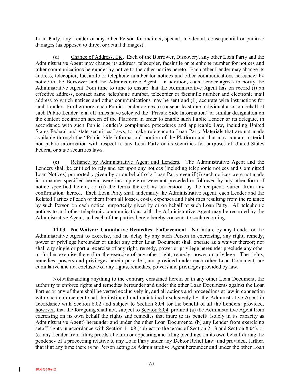 Loan Party, any Lender or any other Person for indirect, special, incidental, consequential or punitive damages (as opposed to direct or actual damages). (d) Change of Address, Etc. Each of the Borrower, Discovery, any other Loan Party and the Administrative Agent may change its address, telecopier, facsimile or telephone number for notices and other communications hereunder by notice to the other parties hereto. Each other Lender may change its address, telecopier, facsimile or telephone number for notices and other communications hereunder by notice to the Borrower and the Administrative Agent. In addition, each Lender agrees to notify the Administrative Agent from time to time to ensure that the Administrative Agent has on record (i) an effective address, contact name, telephone number, telecopier or facsimile number and electronic mail address to which notices and other communications may be sent and (ii) accurate wire instructions for such Lender. Furthermore, each Public Lender agrees to cause at least one individual at or on behalf of such Public Lender to at all times have selected the “Private Side Information” or similar designation on the content declaration screen of the Platform in order to enable such Public Lender or its delegate, in accordance with such Public Lender’s compliance procedures and applicable Law, including United States Federal and state securities Laws, to make reference to Loan Party Materials that are not made available through the “Public Side Information” portion of the Platform and that may contain material non-public information with respect to any Loan Party or its securities for purposes of United States Federal or state securities laws. (e) Reliance by Administrative Agent and Lenders. The Administrative Agent and the Lenders shall be entitled to rely and act upon any notices (including telephonic notices and Committed Loan Notices) purportedly given by or on behalf of a Loan Party even if (i) such notices were not made in a manner specified herein, were incomplete or were not preceded or followed by any other form of notice specified herein, or (ii) the terms thereof, as understood by the recipient, varied from any confirmation thereof. Each Loan Party shall indemnify the Administrative Agent, each Lender and the Related Parties of each of them from all losses, costs, expenses and liabilities resulting from the reliance by such Person on each notice purportedly given by or on behalf of such Loan Party. All telephonic notices to and other telephonic communications with the Administrative Agent may be recorded by the Administrative Agent, and each of the parties hereto hereby consents to such recording. 11.03 No Waiver; Cumulative Remedies; Enforcement. No failure by any Lender or the Administrative Agent to exercise, and no delay by any such Person in exercising, any right, remedy, power or privilege hereunder or under any other Loan Document shall operate as a waiver thereof; nor shall any single or partial exercise of any right, remedy, power or privilege hereunder preclude any other or further exercise thereof or the exercise of any other right, remedy, power or privilege. The rights, remedies, powers and privileges herein provided, and provided under each other Loan Document, are cumulative and not exclusive of any rights, remedies, powers and privileges provided by law. Notwithstanding anything to the contrary contained herein or in any other Loan Document, the authority to enforce rights and remedies hereunder and under the other Loan Documents against the Loan Parties or any of them shall be vested exclusively in, and all actions and proceedings at law in connection with such enforcement shall be instituted and maintained exclusively by, the Administrative Agent in accordance with Section 8.02 and subject to Section 8.04 for the benefit of all the Lenders; provided, however, that the foregoing shall not, subject to Section 8.04, prohibit (a) the Administrative Agent from exercising on its own behalf the rights and remedies that inure to its benefit (solely in its capacity as Administrative Agent) hereunder and under the other Loan Documents, (b) any Lender from exercising setoff rights in accordance with Section 11.08 (subject to the terms of Section 2.13 and Section 8.04), or (c) any Lender from filing proofs of claim or appearing and filing pleadings on its own behalf during the pendency of a proceeding relative to any Loan Party under any Debtor Relief Law; and provided, further, that if at any time there is no Person acting as Administrative Agent hereunder and under the other Loan 102 1006836498v2