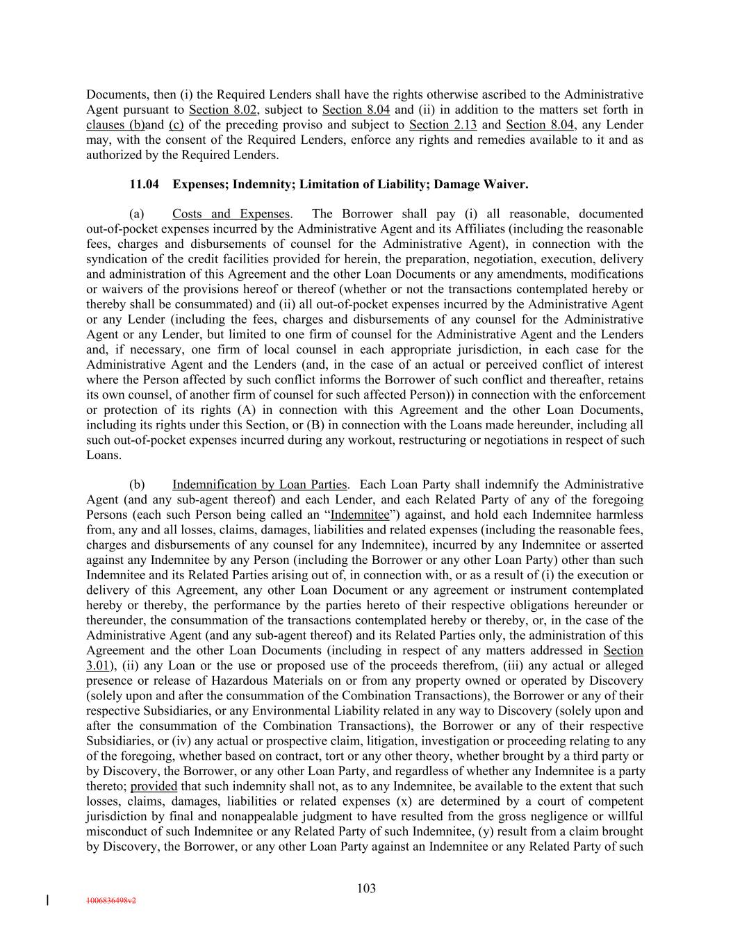 Documents, then (i) the Required Lenders shall have the rights otherwise ascribed to the Administrative Agent pursuant to Section 8.02, subject to Section 8.04 and (ii) in addition to the matters set forth in clauses (b)and (c) of the preceding proviso and subject to Section 2.13 and Section 8.04, any Lender may, with the consent of the Required Lenders, enforce any rights and remedies available to it and as authorized by the Required Lenders. 11.04 Expenses; Indemnity; Limitation of Liability; Damage Waiver. (a) Costs and Expenses. The Borrower shall pay (i) all reasonable, documented out-of-pocket expenses incurred by the Administrative Agent and its Affiliates (including the reasonable fees, charges and disbursements of counsel for the Administrative Agent), in connection with the syndication of the credit facilities provided for herein, the preparation, negotiation, execution, delivery and administration of this Agreement and the other Loan Documents or any amendments, modifications or waivers of the provisions hereof or thereof (whether or not the transactions contemplated hereby or thereby shall be consummated) and (ii) all out-of-pocket expenses incurred by the Administrative Agent or any Lender (including the fees, charges and disbursements of any counsel for the Administrative Agent or any Lender, but limited to one firm of counsel for the Administrative Agent and the Lenders and, if necessary, one firm of local counsel in each appropriate jurisdiction, in each case for the Administrative Agent and the Lenders (and, in the case of an actual or perceived conflict of interest where the Person affected by such conflict informs the Borrower of such conflict and thereafter, retains its own counsel, of another firm of counsel for such affected Person)) in connection with the enforcement or protection of its rights (A) in connection with this Agreement and the other Loan Documents, including its rights under this Section, or (B) in connection with the Loans made hereunder, including all such out-of-pocket expenses incurred during any workout, restructuring or negotiations in respect of such Loans. (b) Indemnification by Loan Parties. Each Loan Party shall indemnify the Administrative Agent (and any sub-agent thereof) and each Lender, and each Related Party of any of the foregoing Persons (each such Person being called an “Indemnitee”) against, and hold each Indemnitee harmless from, any and all losses, claims, damages, liabilities and related expenses (including the reasonable fees, charges and disbursements of any counsel for any Indemnitee), incurred by any Indemnitee or asserted against any Indemnitee by any Person (including the Borrower or any other Loan Party) other than such Indemnitee and its Related Parties arising out of, in connection with, or as a result of (i) the execution or delivery of this Agreement, any other Loan Document or any agreement or instrument contemplated hereby or thereby, the performance by the parties hereto of their respective obligations hereunder or thereunder, the consummation of the transactions contemplated hereby or thereby, or, in the case of the Administrative Agent (and any sub-agent thereof) and its Related Parties only, the administration of this Agreement and the other Loan Documents (including in respect of any matters addressed in Section 3.01), (ii) any Loan or the use or proposed use of the proceeds therefrom, (iii) any actual or alleged presence or release of Hazardous Materials on or from any property owned or operated by Discovery (solely upon and after the consummation of the Combination Transactions), the Borrower or any of their respective Subsidiaries, or any Environmental Liability related in any way to Discovery (solely upon and after the consummation of the Combination Transactions), the Borrower or any of their respective Subsidiaries, or (iv) any actual or prospective claim, litigation, investigation or proceeding relating to any of the foregoing, whether based on contract, tort or any other theory, whether brought by a third party or by Discovery, the Borrower, or any other Loan Party, and regardless of whether any Indemnitee is a party thereto; provided that such indemnity shall not, as to any Indemnitee, be available to the extent that such losses, claims, damages, liabilities or related expenses (x) are determined by a court of competent jurisdiction by final and nonappealable judgment to have resulted from the gross negligence or willful misconduct of such Indemnitee or any Related Party of such Indemnitee, (y) result from a claim brought by Discovery, the Borrower, or any other Loan Party against an Indemnitee or any Related Party of such 103 1006836498v2