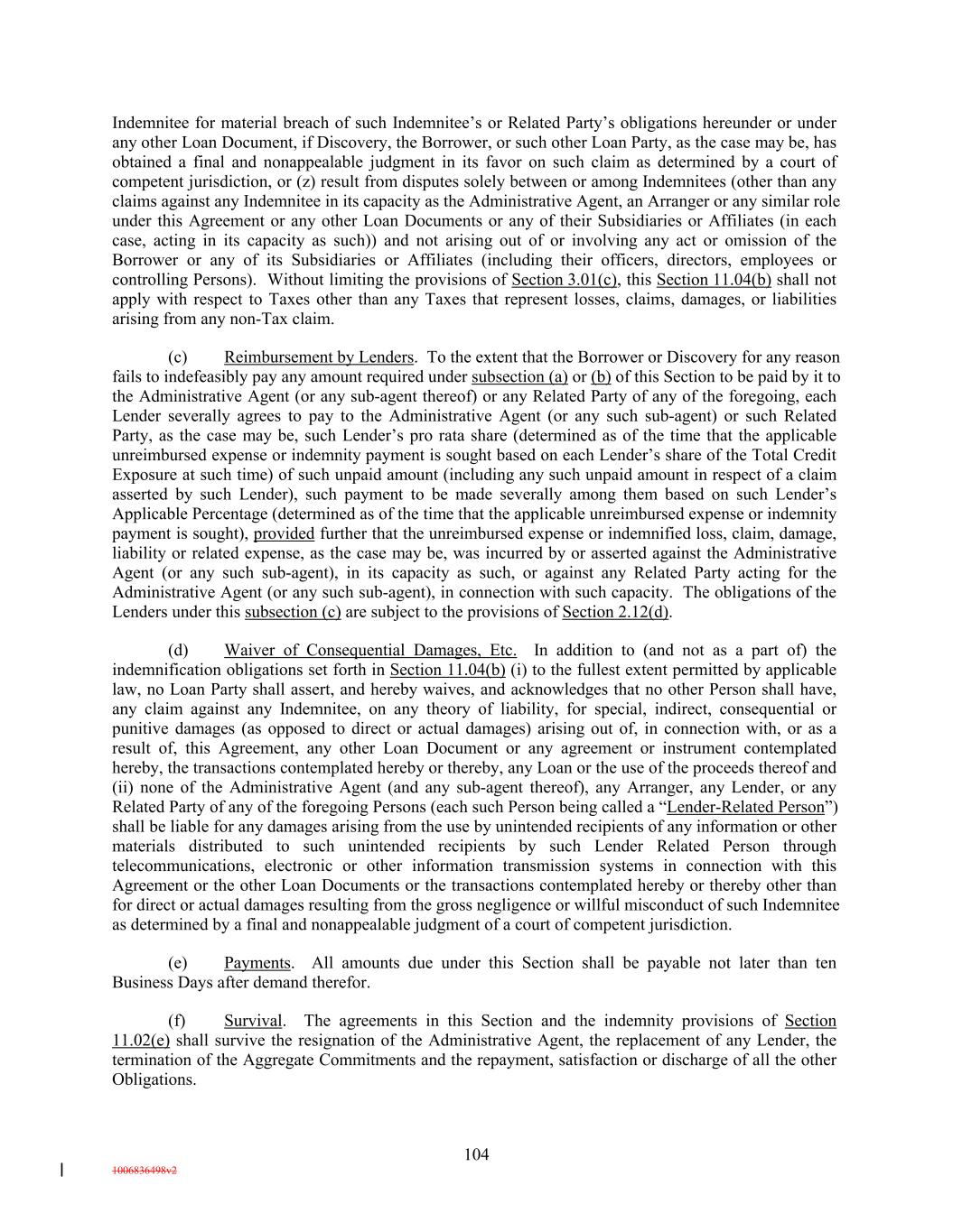 Indemnitee for material breach of such Indemnitee’s or Related Party’s obligations hereunder or under any other Loan Document, if Discovery, the Borrower, or such other Loan Party, as the case may be, has obtained a final and nonappealable judgment in its favor on such claim as determined by a court of competent jurisdiction, or (z) result from disputes solely between or among Indemnitees (other than any claims against any Indemnitee in its capacity as the Administrative Agent, an Arranger or any similar role under this Agreement or any other Loan Documents or any of their Subsidiaries or Affiliates (in each case, acting in its capacity as such)) and not arising out of or involving any act or omission of the Borrower or any of its Subsidiaries or Affiliates (including their officers, directors, employees or controlling Persons). Without limiting the provisions of Section 3.01(c), this Section 11.04(b) shall not apply with respect to Taxes other than any Taxes that represent losses, claims, damages, or liabilities arising from any non-Tax claim. (c) Reimbursement by Lenders. To the extent that the Borrower or Discovery for any reason fails to indefeasibly pay any amount required under subsection (a) or (b) of this Section to be paid by it to the Administrative Agent (or any sub-agent thereof) or any Related Party of any of the foregoing, each Lender severally agrees to pay to the Administrative Agent (or any such sub-agent) or such Related Party, as the case may be, such Lender’s pro rata share (determined as of the time that the applicable unreimbursed expense or indemnity payment is sought based on each Lender’s share of the Total Credit Exposure at such time) of such unpaid amount (including any such unpaid amount in respect of a claim asserted by such Lender), such payment to be made severally among them based on such Lender’s Applicable Percentage (determined as of the time that the applicable unreimbursed expense or indemnity payment is sought), provided further that the unreimbursed expense or indemnified loss, claim, damage, liability or related expense, as the case may be, was incurred by or asserted against the Administrative Agent (or any such sub-agent), in its capacity as such, or against any Related Party acting for the Administrative Agent (or any such sub-agent), in connection with such capacity. The obligations of the Lenders under this subsection (c) are subject to the provisions of Section 2.12(d). (d) Waiver of Consequential Damages, Etc. In addition to (and not as a part of) the indemnification obligations set forth in Section 11.04(b) (i) to the fullest extent permitted by applicable law, no Loan Party shall assert, and hereby waives, and acknowledges that no other Person shall have, any claim against any Indemnitee, on any theory of liability, for special, indirect, consequential or punitive damages (as opposed to direct or actual damages) arising out of, in connection with, or as a result of, this Agreement, any other Loan Document or any agreement or instrument contemplated hereby, the transactions contemplated hereby or thereby, any Loan or the use of the proceeds thereof and (ii) none of the Administrative Agent (and any sub-agent thereof), any Arranger, any Lender, or any Related Party of any of the foregoing Persons (each such Person being called a “Lender-Related Person”) shall be liable for any damages arising from the use by unintended recipients of any information or other materials distributed to such unintended recipients by such Lender Related Person through telecommunications, electronic or other information transmission systems in connection with this Agreement or the other Loan Documents or the transactions contemplated hereby or thereby other than for direct or actual damages resulting from the gross negligence or willful misconduct of such Indemnitee as determined by a final and nonappealable judgment of a court of competent jurisdiction. (e) Payments. All amounts due under this Section shall be payable not later than ten Business Days after demand therefor. (f) Survival. The agreements in this Section and the indemnity provisions of Section 11.02(e) shall survive the resignation of the Administrative Agent, the replacement of any Lender, the termination of the Aggregate Commitments and the repayment, satisfaction or discharge of all the other Obligations. 104 1006836498v2