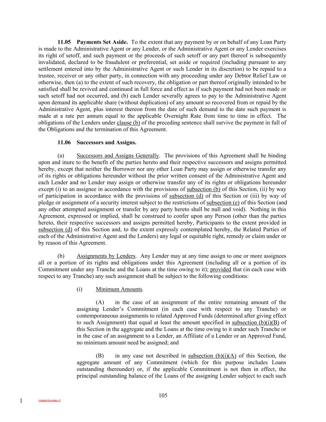11.05 Payments Set Aside. To the extent that any payment by or on behalf of any Loan Party is made to the Administrative Agent or any Lender, or the Administrative Agent or any Lender exercises its right of setoff, and such payment or the proceeds of such setoff or any part thereof is subsequently invalidated, declared to be fraudulent or preferential, set aside or required (including pursuant to any settlement entered into by the Administrative Agent or such Lender in its discretion) to be repaid to a trustee, receiver or any other party, in connection with any proceeding under any Debtor Relief Law or otherwise, then (a) to the extent of such recovery, the obligation or part thereof originally intended to be satisfied shall be revived and continued in full force and effect as if such payment had not been made or such setoff had not occurred, and (b) each Lender severally agrees to pay to the Administrative Agent upon demand its applicable share (without duplication) of any amount so recovered from or repaid by the Administrative Agent, plus interest thereon from the date of such demand to the date such payment is made at a rate per annum equal to the applicable Overnight Rate from time to time in effect. The obligations of the Lenders under clause (b) of the preceding sentence shall survive the payment in full of the Obligations and the termination of this Agreement. 11.06 Successors and Assigns. (a) Successors and Assigns Generally. The provisions of this Agreement shall be binding upon and inure to the benefit of the parties hereto and their respective successors and assigns permitted hereby, except that neither the Borrower nor any other Loan Party may assign or otherwise transfer any of its rights or obligations hereunder without the prior written consent of the Administrative Agent and each Lender and no Lender may assign or otherwise transfer any of its rights or obligations hereunder except (i) to an assignee in accordance with the provisions of subsection (b) of this Section, (ii) by way of participation in accordance with the provisions of subsection (d) of this Section or (iii) by way of pledge or assignment of a security interest subject to the restrictions of subsection (e) of this Section (and any other attempted assignment or transfer by any party hereto shall be null and void). Nothing in this Agreement, expressed or implied, shall be construed to confer upon any Person (other than the parties hereto, their respective successors and assigns permitted hereby, Participants to the extent provided in subsection (d) of this Section and, to the extent expressly contemplated hereby, the Related Parties of each of the Administrative Agent and the Lenders) any legal or equitable right, remedy or claim under or by reason of this Agreement. (b) Assignments by Lenders. Any Lender may at any time assign to one or more assignees all or a portion of its rights and obligations under this Agreement (including all or a portion of its Commitment under any Tranche and the Loans at the time owing to it); provided that (in each case with respect to any Tranche) any such assignment shall be subject to the following conditions: (i) Minimum Amounts. (A) in the case of an assignment of the entire remaining amount of the assigning Lender’s Commitment (in each case with respect to any Tranche) or contemporaneous assignments to related Approved Funds (determined after giving effect to such Assignment) that equal at least the amount specified in subsection (b)(i)(B) of this Section in the aggregate and the Loans at the time owing to it under such Tranche or in the case of an assignment to a Lender, an Affiliate of a Lender or an Approved Fund, no minimum amount need be assigned; and (B) in any case not described in subsection (b)(i)(A) of this Section, the aggregate amount of any Commitment (which for this purpose includes Loans outstanding thereunder) or, if the applicable Commitment is not then in effect, the principal outstanding balance of the Loans of the assigning Lender subject to each such 105 1006836498v2
