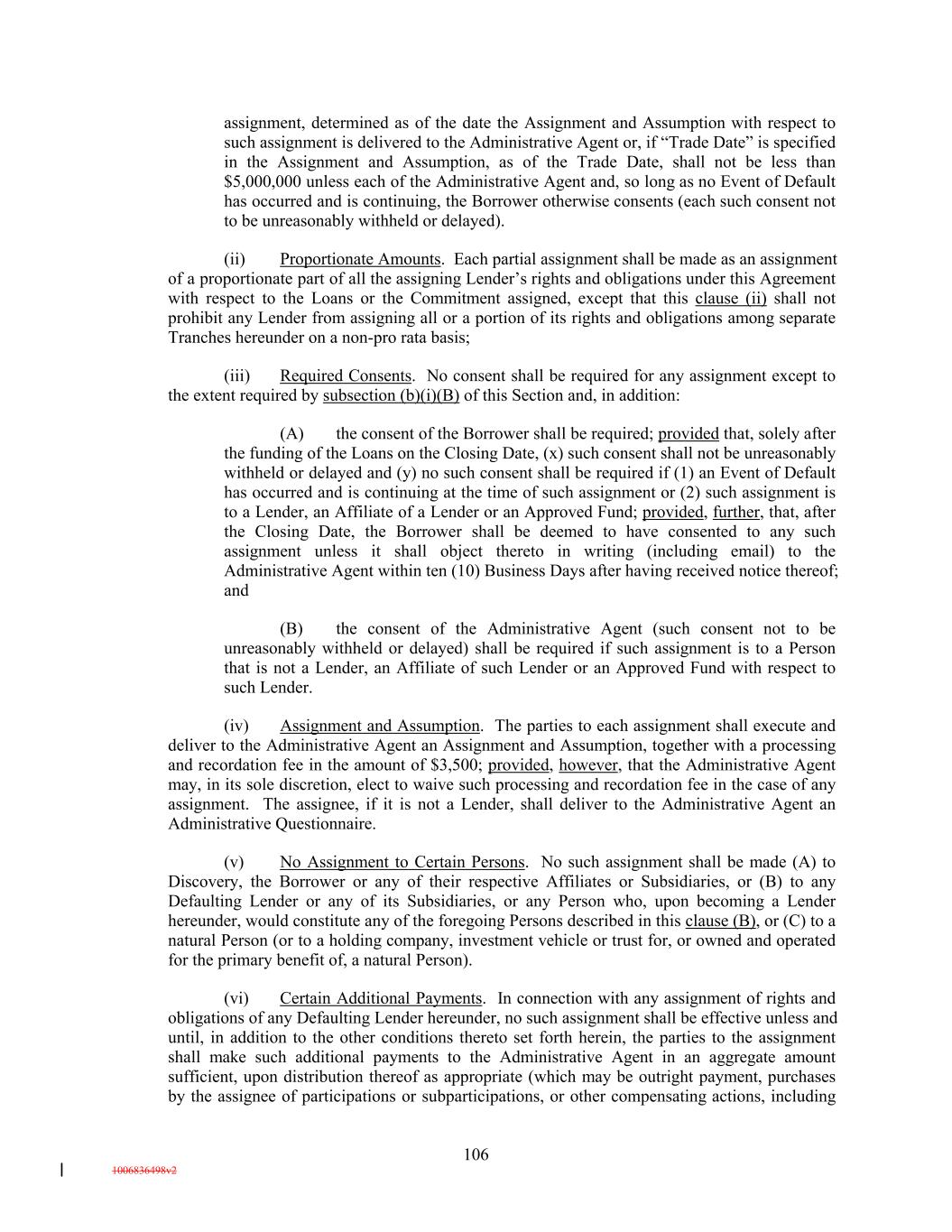 assignment, determined as of the date the Assignment and Assumption with respect to such assignment is delivered to the Administrative Agent or, if “Trade Date” is specified in the Assignment and Assumption, as of the Trade Date, shall not be less than $5,000,000 unless each of the Administrative Agent and, so long as no Event of Default has occurred and is continuing, the Borrower otherwise consents (each such consent not to be unreasonably withheld or delayed). (ii) Proportionate Amounts. Each partial assignment shall be made as an assignment of a proportionate part of all the assigning Lender’s rights and obligations under this Agreement with respect to the Loans or the Commitment assigned, except that this clause (ii) shall not prohibit any Lender from assigning all or a portion of its rights and obligations among separate Tranches hereunder on a non-pro rata basis; (iii) Required Consents. No consent shall be required for any assignment except to the extent required by subsection (b)(i)(B) of this Section and, in addition: (A) the consent of the Borrower shall be required; provided that, solely after the funding of the Loans on the Closing Date, (x) such consent shall not be unreasonably withheld or delayed and (y) no such consent shall be required if (1) an Event of Default has occurred and is continuing at the time of such assignment or (2) such assignment is to a Lender, an Affiliate of a Lender or an Approved Fund; provided, further, that, after the Closing Date, the Borrower shall be deemed to have consented to any such assignment unless it shall object thereto in writing (including email) to the Administrative Agent within ten (10) Business Days after having received notice thereof; and (B) the consent of the Administrative Agent (such consent not to be unreasonably withheld or delayed) shall be required if such assignment is to a Person that is not a Lender, an Affiliate of such Lender or an Approved Fund with respect to such Lender. (iv) Assignment and Assumption. The parties to each assignment shall execute and deliver to the Administrative Agent an Assignment and Assumption, together with a processing and recordation fee in the amount of $3,500; provided, however, that the Administrative Agent may, in its sole discretion, elect to waive such processing and recordation fee in the case of any assignment. The assignee, if it is not a Lender, shall deliver to the Administrative Agent an Administrative Questionnaire. (v) No Assignment to Certain Persons. No such assignment shall be made (A) to Discovery, the Borrower or any of their respective Affiliates or Subsidiaries, or (B) to any Defaulting Lender or any of its Subsidiaries, or any Person who, upon becoming a Lender hereunder, would constitute any of the foregoing Persons described in this clause (B), or (C) to a natural Person (or to a holding company, investment vehicle or trust for, or owned and operated for the primary benefit of, a natural Person). (vi) Certain Additional Payments. In connection with any assignment of rights and obligations of any Defaulting Lender hereunder, no such assignment shall be effective unless and until, in addition to the other conditions thereto set forth herein, the parties to the assignment shall make such additional payments to the Administrative Agent in an aggregate amount sufficient, upon distribution thereof as appropriate (which may be outright payment, purchases by the assignee of participations or subparticipations, or other compensating actions, including 106 1006836498v2