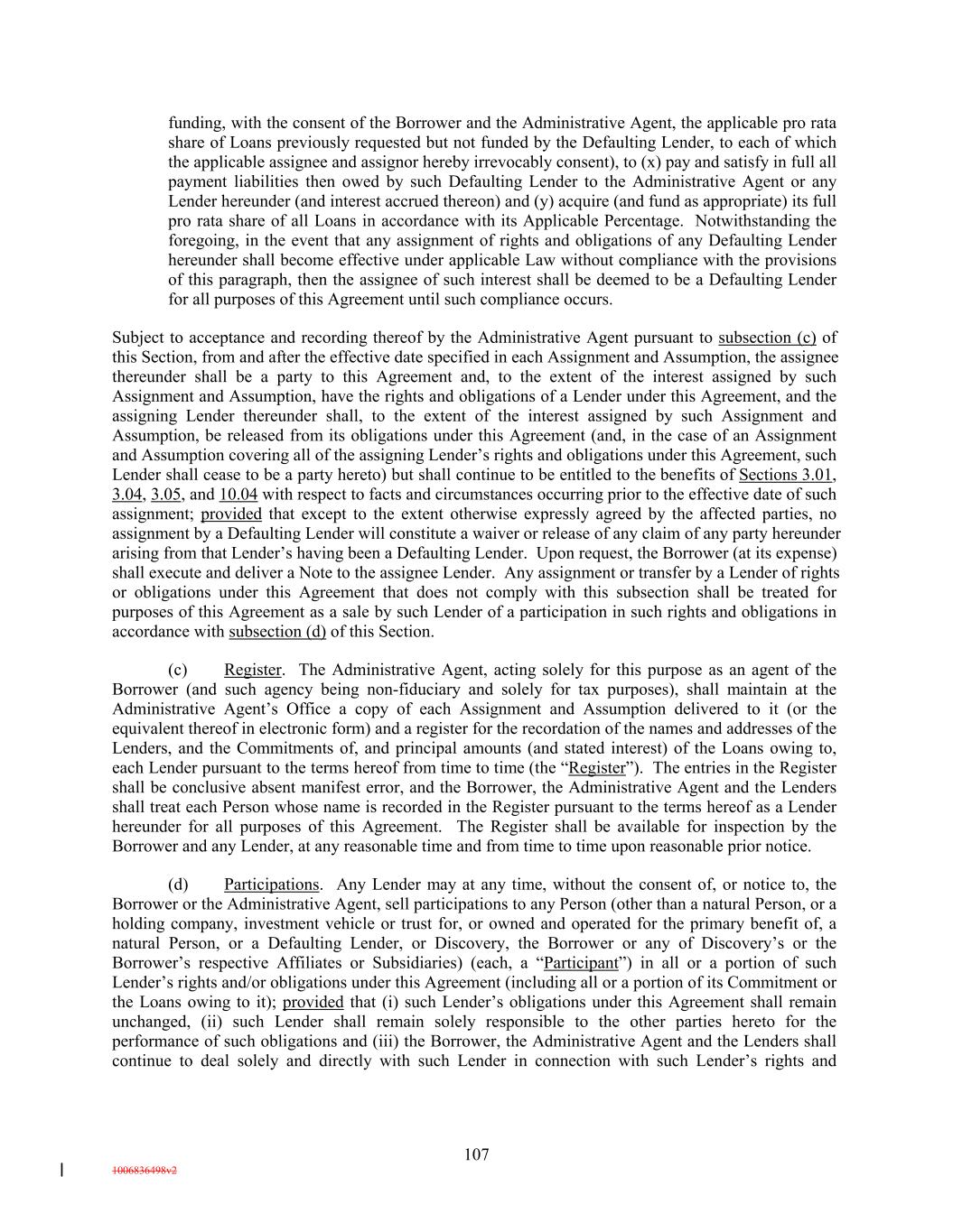 funding, with the consent of the Borrower and the Administrative Agent, the applicable pro rata share of Loans previously requested but not funded by the Defaulting Lender, to each of which the applicable assignee and assignor hereby irrevocably consent), to (x) pay and satisfy in full all payment liabilities then owed by such Defaulting Lender to the Administrative Agent or any Lender hereunder (and interest accrued thereon) and (y) acquire (and fund as appropriate) its full pro rata share of all Loans in accordance with its Applicable Percentage. Notwithstanding the foregoing, in the event that any assignment of rights and obligations of any Defaulting Lender hereunder shall become effective under applicable Law without compliance with the provisions of this paragraph, then the assignee of such interest shall be deemed to be a Defaulting Lender for all purposes of this Agreement until such compliance occurs. Subject to acceptance and recording thereof by the Administrative Agent pursuant to subsection (c) of this Section, from and after the effective date specified in each Assignment and Assumption, the assignee thereunder shall be a party to this Agreement and, to the extent of the interest assigned by such Assignment and Assumption, have the rights and obligations of a Lender under this Agreement, and the assigning Lender thereunder shall, to the extent of the interest assigned by such Assignment and Assumption, be released from its obligations under this Agreement (and, in the case of an Assignment and Assumption covering all of the assigning Lender’s rights and obligations under this Agreement, such Lender shall cease to be a party hereto) but shall continue to be entitled to the benefits of Sections 3.01, 3.04, 3.05, and 10.04 with respect to facts and circumstances occurring prior to the effective date of such assignment; provided that except to the extent otherwise expressly agreed by the affected parties, no assignment by a Defaulting Lender will constitute a waiver or release of any claim of any party hereunder arising from that Lender’s having been a Defaulting Lender. Upon request, the Borrower (at its expense) shall execute and deliver a Note to the assignee Lender. Any assignment or transfer by a Lender of rights or obligations under this Agreement that does not comply with this subsection shall be treated for purposes of this Agreement as a sale by such Lender of a participation in such rights and obligations in accordance with subsection (d) of this Section. (c) Register. The Administrative Agent, acting solely for this purpose as an agent of the Borrower (and such agency being non-fiduciary and solely for tax purposes), shall maintain at the Administrative Agent’s Office a copy of each Assignment and Assumption delivered to it (or the equivalent thereof in electronic form) and a register for the recordation of the names and addresses of the Lenders, and the Commitments of, and principal amounts (and stated interest) of the Loans owing to, each Lender pursuant to the terms hereof from time to time (the “Register”). The entries in the Register shall be conclusive absent manifest error, and the Borrower, the Administrative Agent and the Lenders shall treat each Person whose name is recorded in the Register pursuant to the terms hereof as a Lender hereunder for all purposes of this Agreement. The Register shall be available for inspection by the Borrower and any Lender, at any reasonable time and from time to time upon reasonable prior notice. (d) Participations. Any Lender may at any time, without the consent of, or notice to, the Borrower or the Administrative Agent, sell participations to any Person (other than a natural Person, or a holding company, investment vehicle or trust for, or owned and operated for the primary benefit of, a natural Person, or a Defaulting Lender, or Discovery, the Borrower or any of Discovery’s or the Borrower’s respective Affiliates or Subsidiaries) (each, a “Participant”) in all or a portion of such Lender’s rights and/or obligations under this Agreement (including all or a portion of its Commitment or the Loans owing to it); provided that (i) such Lender’s obligations under this Agreement shall remain unchanged, (ii) such Lender shall remain solely responsible to the other parties hereto for the performance of such obligations and (iii) the Borrower, the Administrative Agent and the Lenders shall continue to deal solely and directly with such Lender in connection with such Lender’s rights and 107 1006836498v2