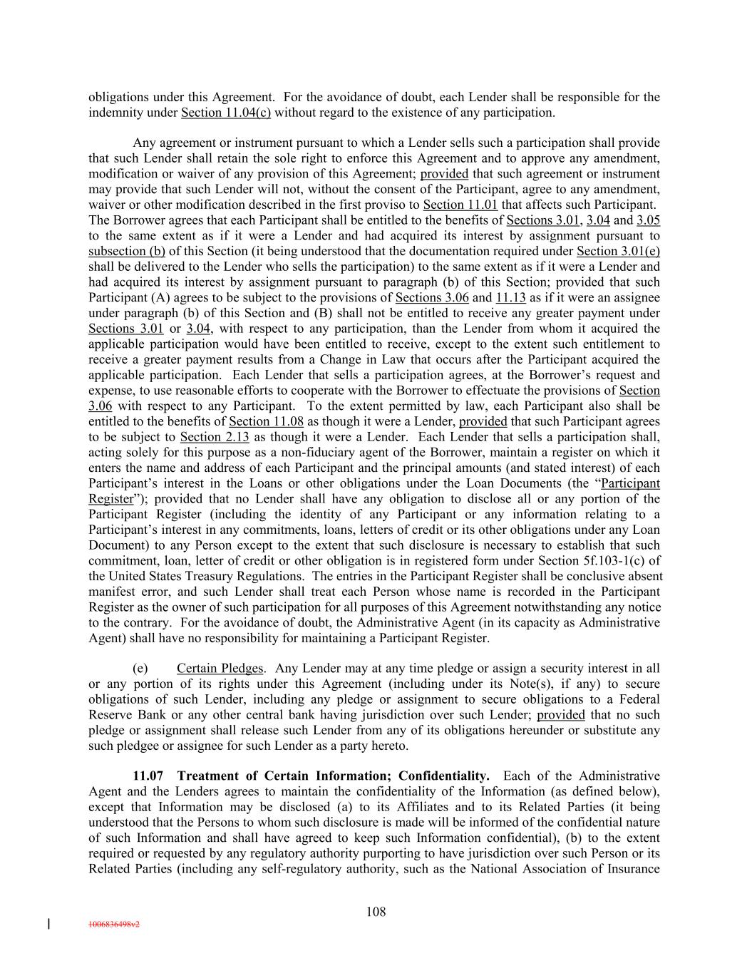 obligations under this Agreement. For the avoidance of doubt, each Lender shall be responsible for the indemnity under Section 11.04(c) without regard to the existence of any participation. Any agreement or instrument pursuant to which a Lender sells such a participation shall provide that such Lender shall retain the sole right to enforce this Agreement and to approve any amendment, modification or waiver of any provision of this Agreement; provided that such agreement or instrument may provide that such Lender will not, without the consent of the Participant, agree to any amendment, waiver or other modification described in the first proviso to Section 11.01 that affects such Participant. The Borrower agrees that each Participant shall be entitled to the benefits of Sections 3.01, 3.04 and 3.05 to the same extent as if it were a Lender and had acquired its interest by assignment pursuant to subsection (b) of this Section (it being understood that the documentation required under Section 3.01(e) shall be delivered to the Lender who sells the participation) to the same extent as if it were a Lender and had acquired its interest by assignment pursuant to paragraph (b) of this Section; provided that such Participant (A) agrees to be subject to the provisions of Sections 3.06 and 11.13 as if it were an assignee under paragraph (b) of this Section and (B) shall not be entitled to receive any greater payment under Sections 3.01 or 3.04, with respect to any participation, than the Lender from whom it acquired the applicable participation would have been entitled to receive, except to the extent such entitlement to receive a greater payment results from a Change in Law that occurs after the Participant acquired the applicable participation. Each Lender that sells a participation agrees, at the Borrower’s request and expense, to use reasonable efforts to cooperate with the Borrower to effectuate the provisions of Section 3.06 with respect to any Participant. To the extent permitted by law, each Participant also shall be entitled to the benefits of Section 11.08 as though it were a Lender, provided that such Participant agrees to be subject to Section 2.13 as though it were a Lender. Each Lender that sells a participation shall, acting solely for this purpose as a non-fiduciary agent of the Borrower, maintain a register on which it enters the name and address of each Participant and the principal amounts (and stated interest) of each Participant’s interest in the Loans or other obligations under the Loan Documents (the “Participant Register”); provided that no Lender shall have any obligation to disclose all or any portion of the Participant Register (including the identity of any Participant or any information relating to a Participant’s interest in any commitments, loans, letters of credit or its other obligations under any Loan Document) to any Person except to the extent that such disclosure is necessary to establish that such commitment, loan, letter of credit or other obligation is in registered form under Section 5f.103-1(c) of the United States Treasury Regulations. The entries in the Participant Register shall be conclusive absent manifest error, and such Lender shall treat each Person whose name is recorded in the Participant Register as the owner of such participation for all purposes of this Agreement notwithstanding any notice to the contrary. For the avoidance of doubt, the Administrative Agent (in its capacity as Administrative Agent) shall have no responsibility for maintaining a Participant Register. (e) Certain Pledges. Any Lender may at any time pledge or assign a security interest in all or any portion of its rights under this Agreement (including under its Note(s), if any) to secure obligations of such Lender, including any pledge or assignment to secure obligations to a Federal Reserve Bank or any other central bank having jurisdiction over such Lender; provided that no such pledge or assignment shall release such Lender from any of its obligations hereunder or substitute any such pledgee or assignee for such Lender as a party hereto. 11.07 Treatment of Certain Information; Confidentiality. Each of the Administrative Agent and the Lenders agrees to maintain the confidentiality of the Information (as defined below), except that Information may be disclosed (a) to its Affiliates and to its Related Parties (it being understood that the Persons to whom such disclosure is made will be informed of the confidential nature of such Information and shall have agreed to keep such Information confidential), (b) to the extent required or requested by any regulatory authority purporting to have jurisdiction over such Person or its Related Parties (including any self-regulatory authority, such as the National Association of Insurance 108 1006836498v2